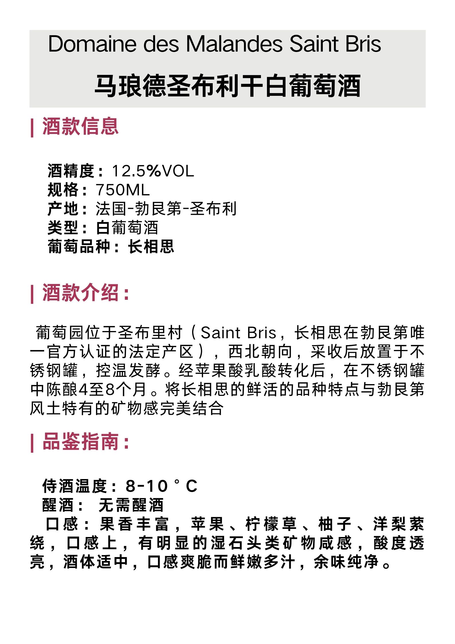 马琅德圣布利干白 Domaine des Malandes Saint Bris