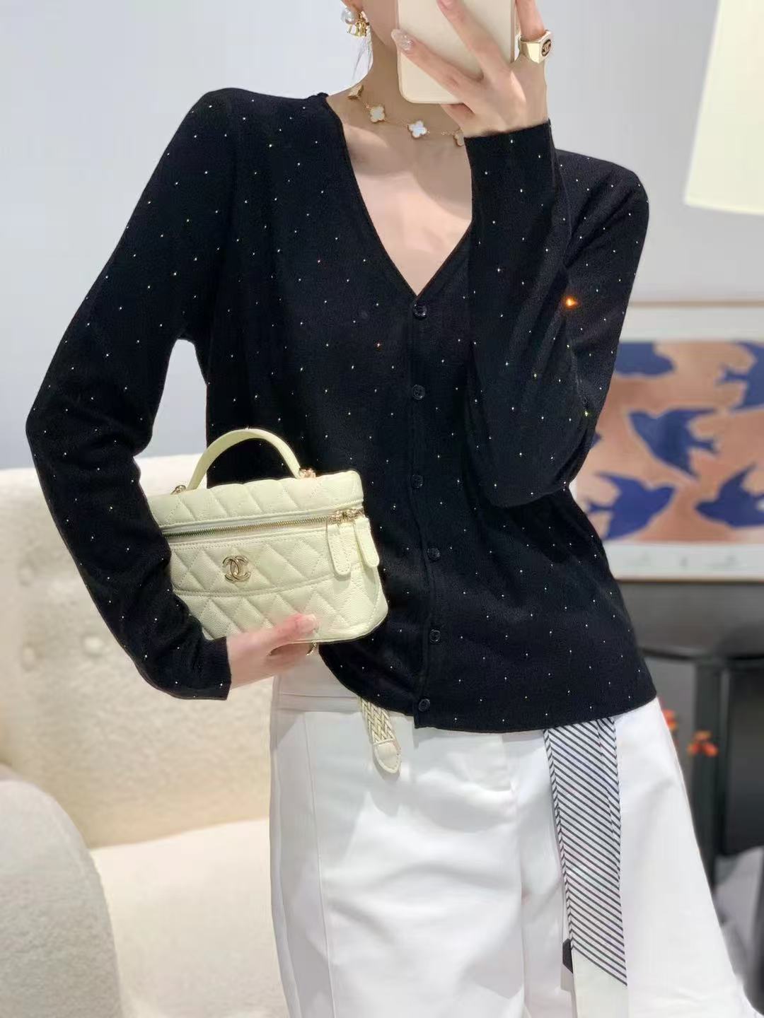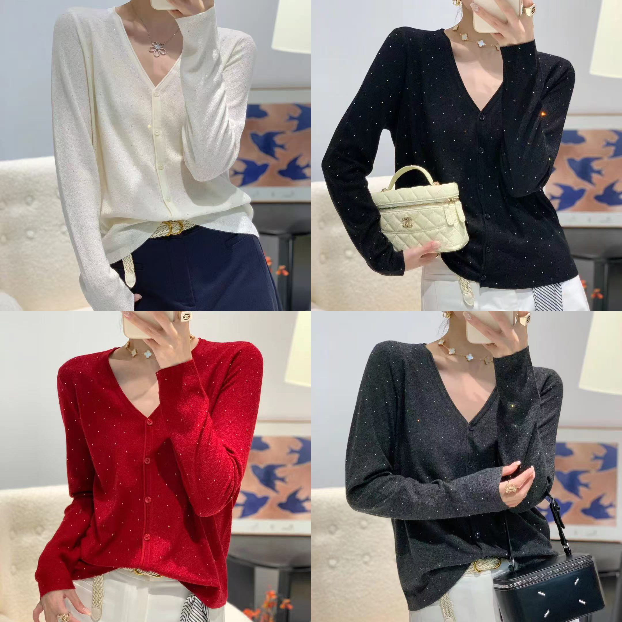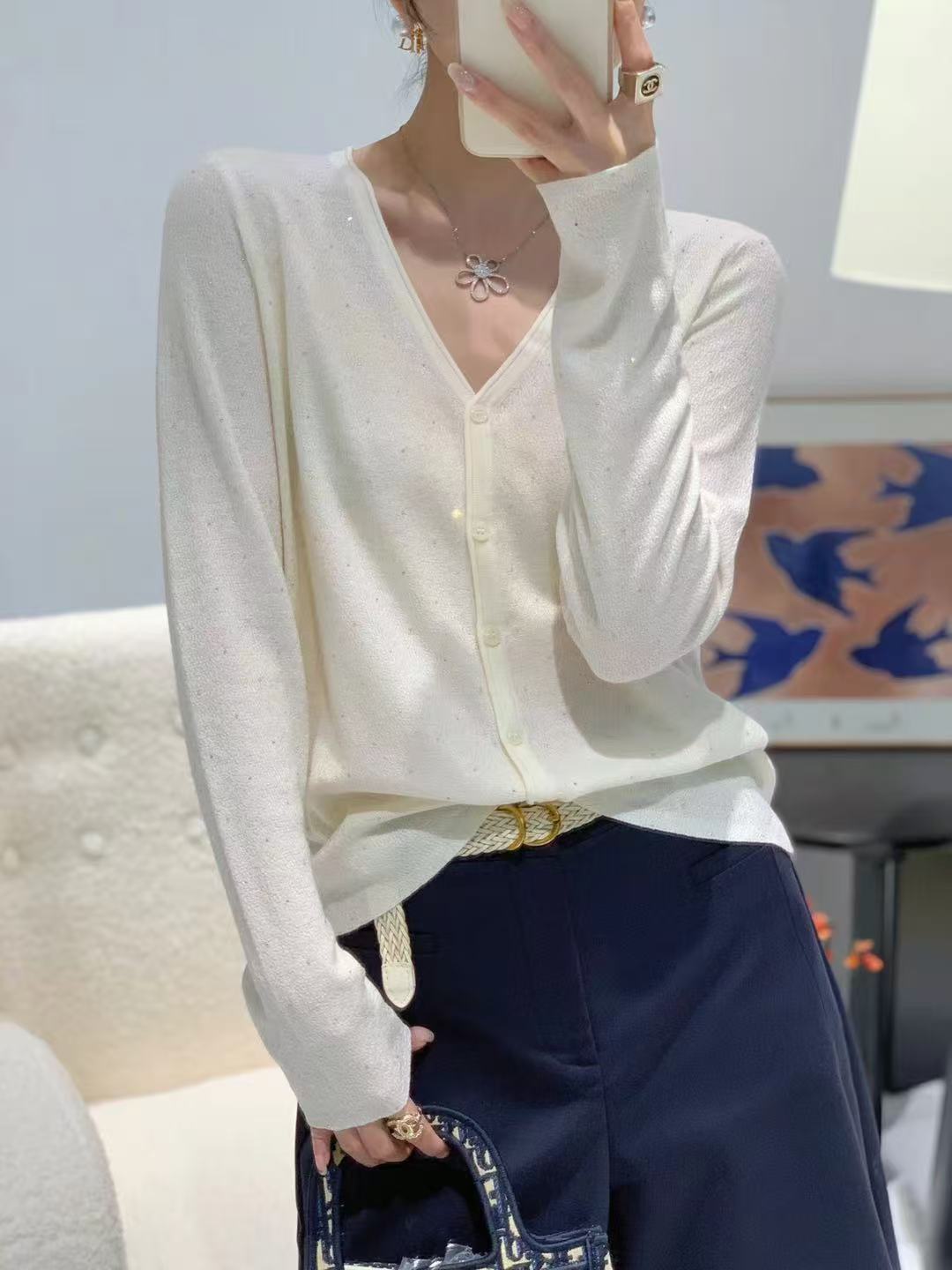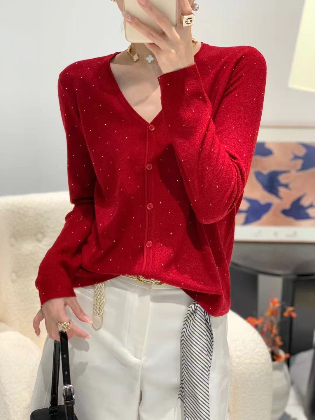 女士内搭长袖针织水钻V领针织开衫【FF25851】