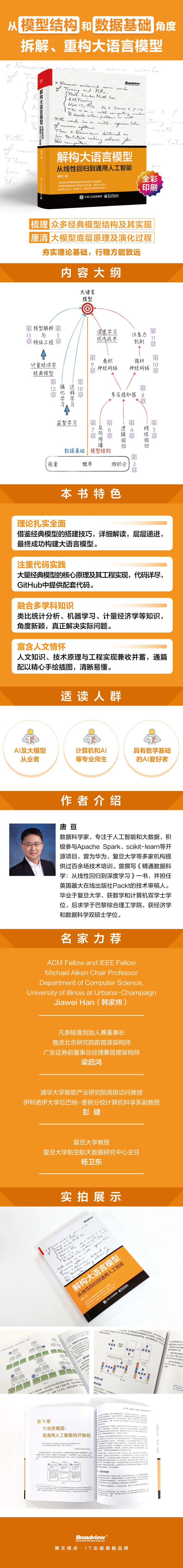 本书从模型的结构和数据基础两个方面解构大语言模型,以便帮助读者理解和搭建类似ChatGPT的系统。在模型的结构方面,大语言模型属于深度神经网络,其设计核心是注意力机制,因此,本书涵盖了多层感知器、卷积神经网络和循环神经网络等经典模型。在模型的数据基础方面,本书既涉及模型训练的工程基础,如反向传播,又涉及数据的使用方式,如迁移学习、强化学习,以及传统的监督学习和无监督学习。此外,本书还阐述了如何从计量经济学和经典机器学习模型中汲取灵感,以提高模型的稳定性和可解释性。本书既适用于希望深入了解大语言模型、通过人工智能技术解决实际问题的读者,也适合作为高等院校计算机及相关专业的师生参考用书。
