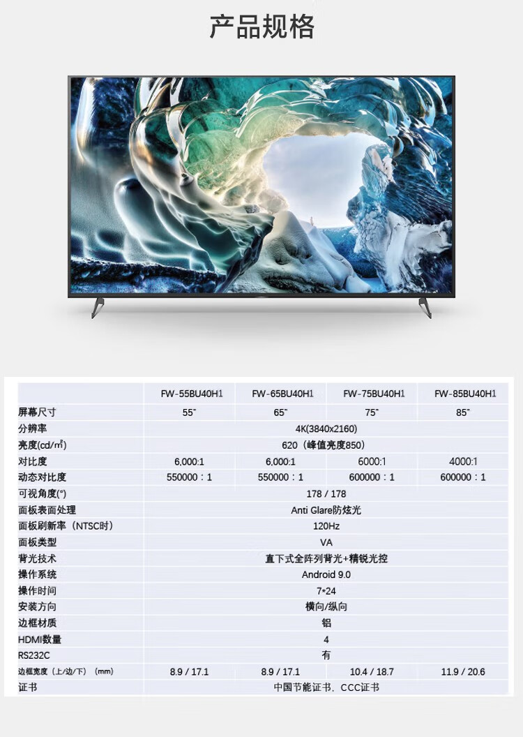 索尼(SONY)游戏电视机 120Hz高刷4K超高清HDR 对比度6000 无线投屏 FW- 85BU40H1【85英寸 数字4K优化还原】 峰值亮度850