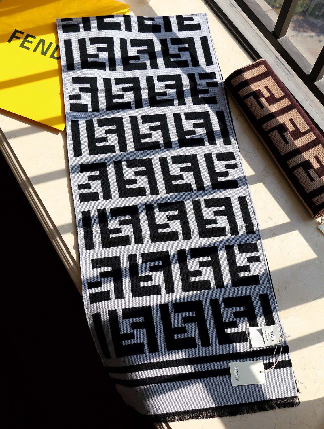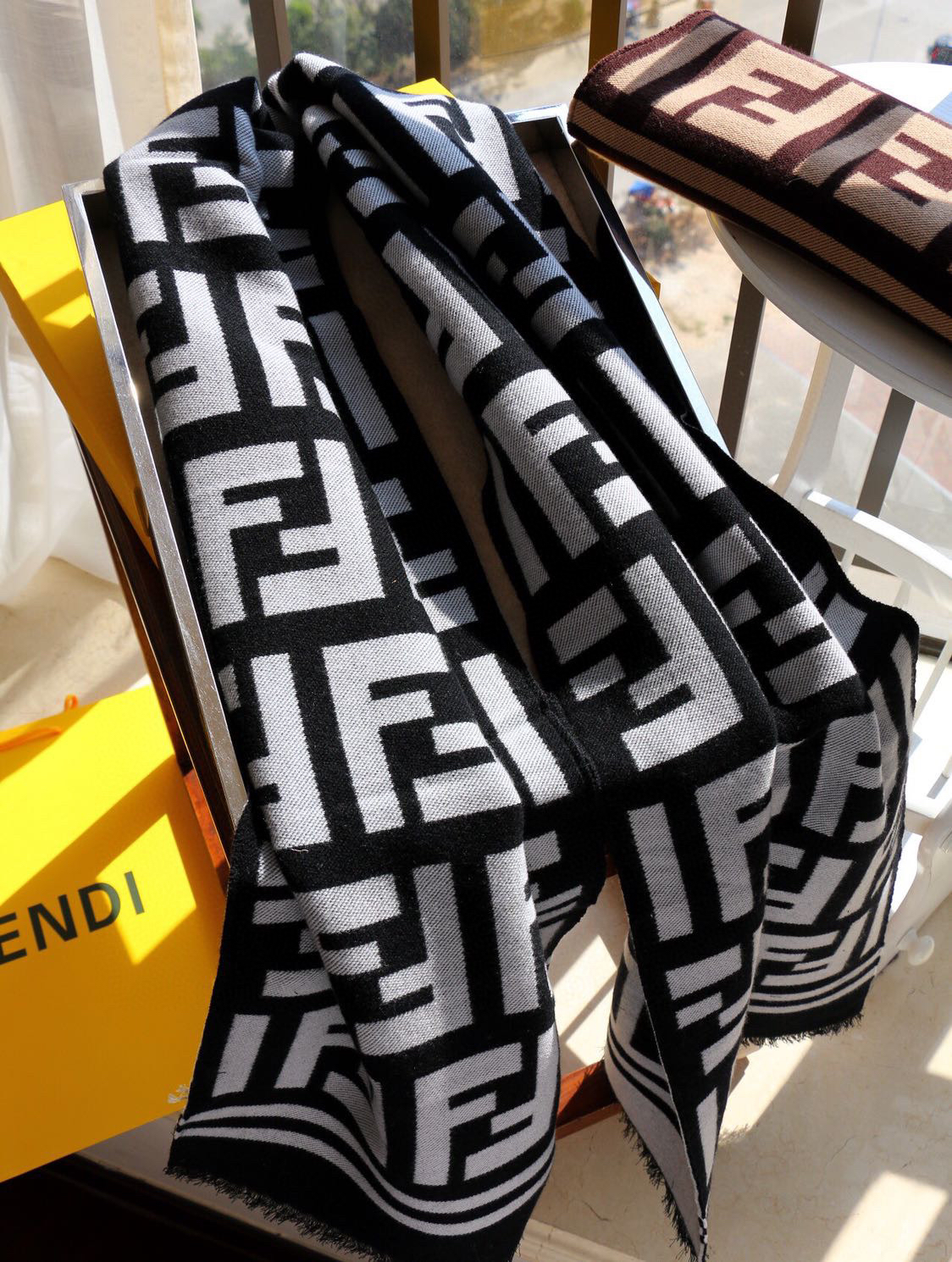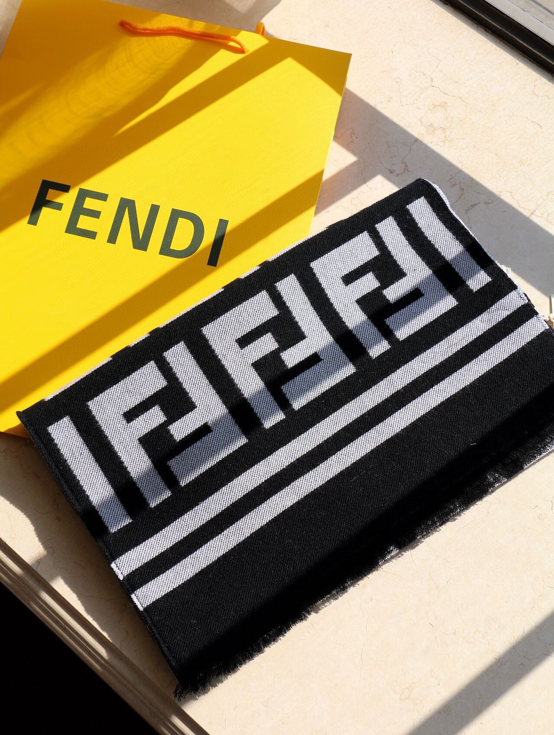 含布袋正品手提袋包邮,白色底,极品‼️Fendi今年最火的围巾🔥全世界都在抢的老花FF字母款🔥主打的限量大极品‼️专柜也是有钱也很难买到的好玩意儿‼️正儿八经的好东西,真材实料一模一样,这样的一条非常耗原料‼️据说目前很多专柜断货~~真的相当的百搭,上身气质UpUp❗️😘有正品的拉出来再对比下我们的,简直一模一样,标签编号吊牌主标什么的都是一模一样‼️代购卖+,买到偷着乐吧,这是一个香港公司的出口订单‼️总之是惊喜。不要嫌少,这种规格越来越少且珍惜。上身效果气场非常强大!纯手工精梳处理。绝对是重磅!不同于希望的围巾组织构造,这款围巾的效果很特别,手感柔软成色有质感,纱线细致分明,版型更是非常有型,用手机拍出来都能惊艳全场‼️高密度精工细作❗️大牌的东西真的非常考究,匠心之作。规格:95%羊毛+5%真丝【原版面料❗️】 35*180cm…2个色。