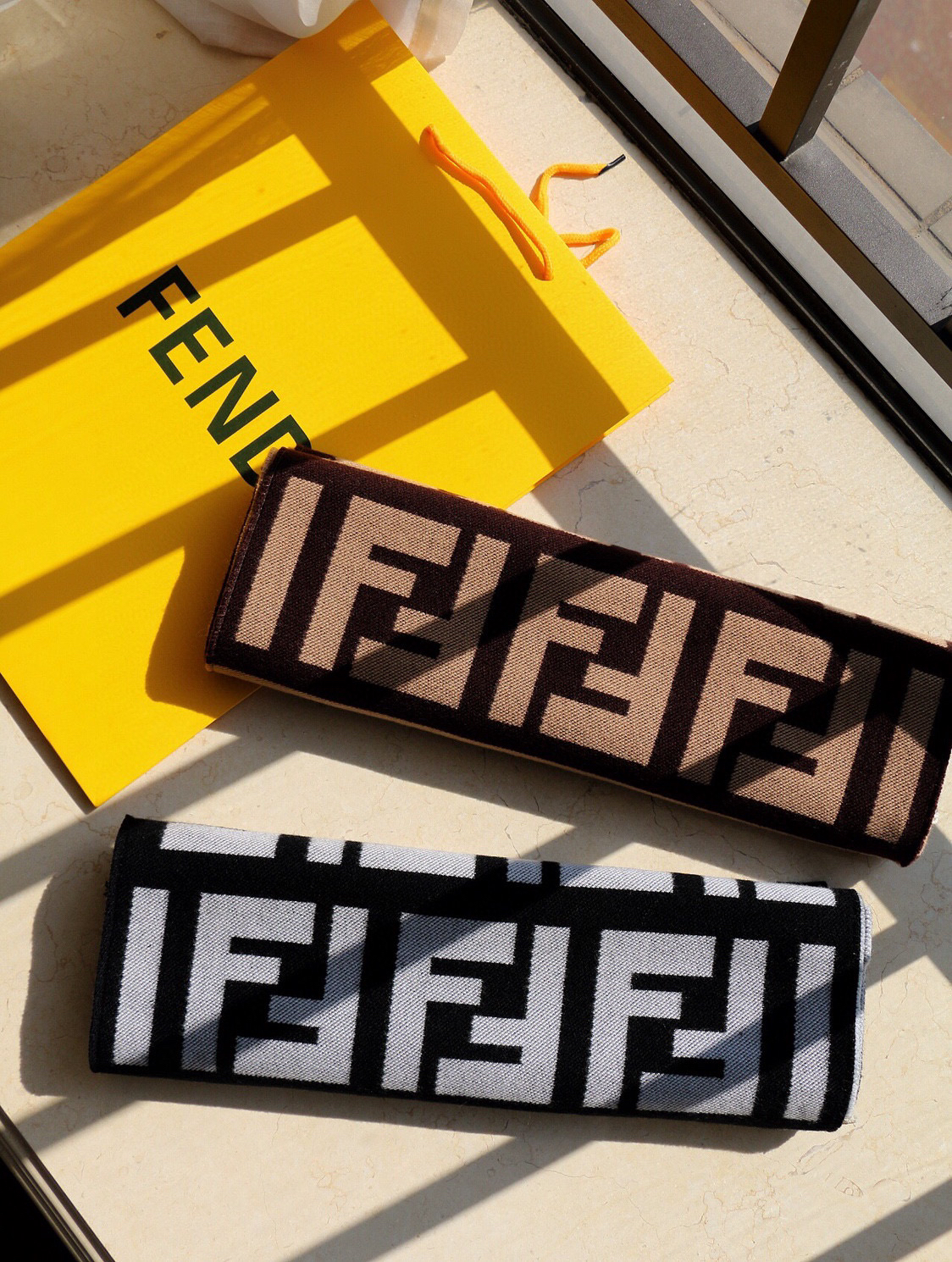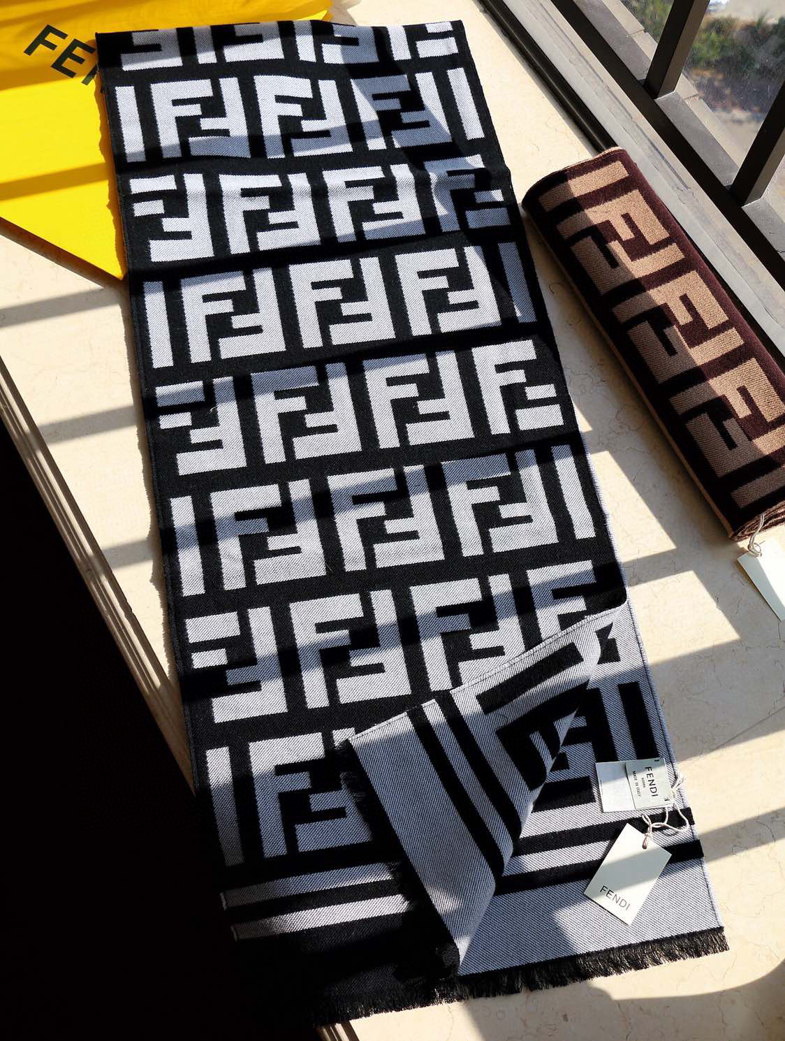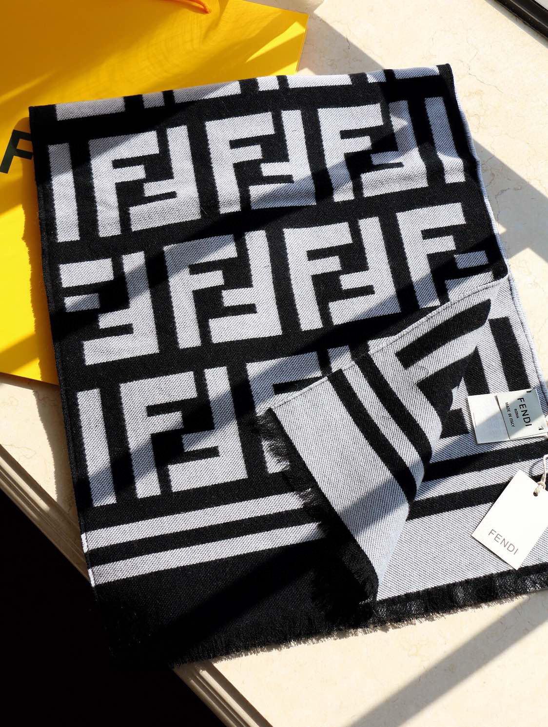 含布袋正品手提袋包邮,白色底,极品‼️Fendi今年最火的围巾🔥全世界都在抢的老花FF字母款🔥主打的限量大极品‼️专柜也是有钱也很难买到的好玩意儿‼️正儿八经的好东西,真材实料一模一样,这样的一条非常耗原料‼️据说目前很多专柜断货~~真的相当的百搭,上身气质UpUp❗️😘有正品的拉出来再对比下我们的,简直一模一样,标签编号吊牌主标什么的都是一模一样‼️代购卖+,买到偷着乐吧,这是一个香港公司的出口订单‼️总之是惊喜。不要嫌少,这种规格越来越少且珍惜。上身效果气场非常强大!纯手工精梳处理。绝对是重磅!不同于希望的围巾组织构造,这款围巾的效果很特别,手感柔软成色有质感,纱线细致分明,版型更是非常有型,用手机拍出来都能惊艳全场‼️高密度精工细作❗️大牌的东西真的非常考究,匠心之作。规格:95%羊毛+5%真丝【原版面料❗️】 35*180cm…2个色。