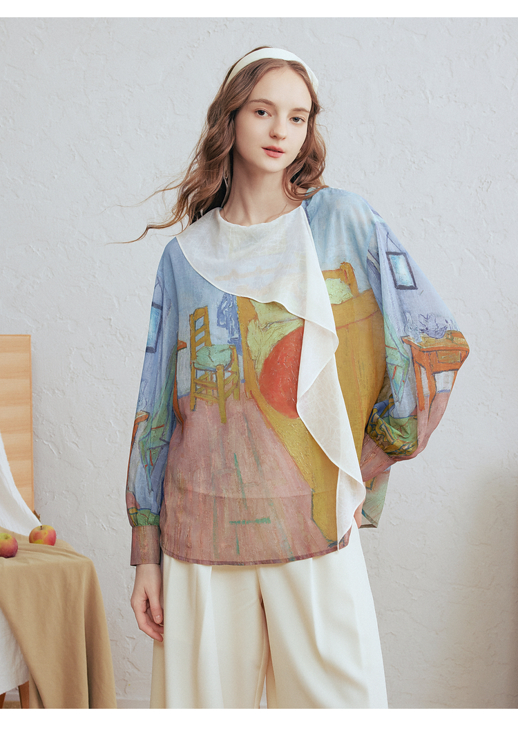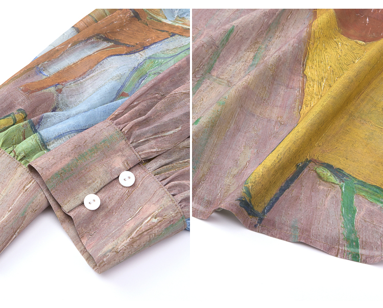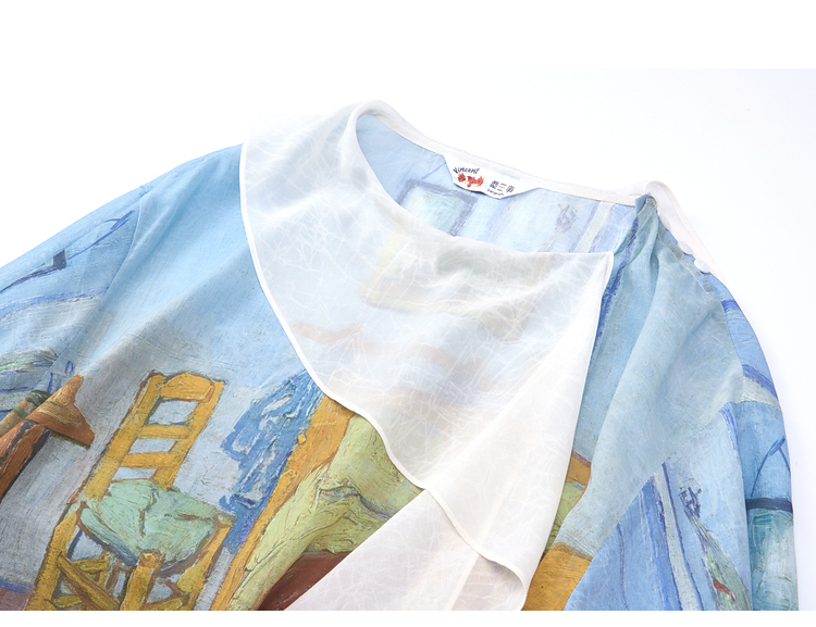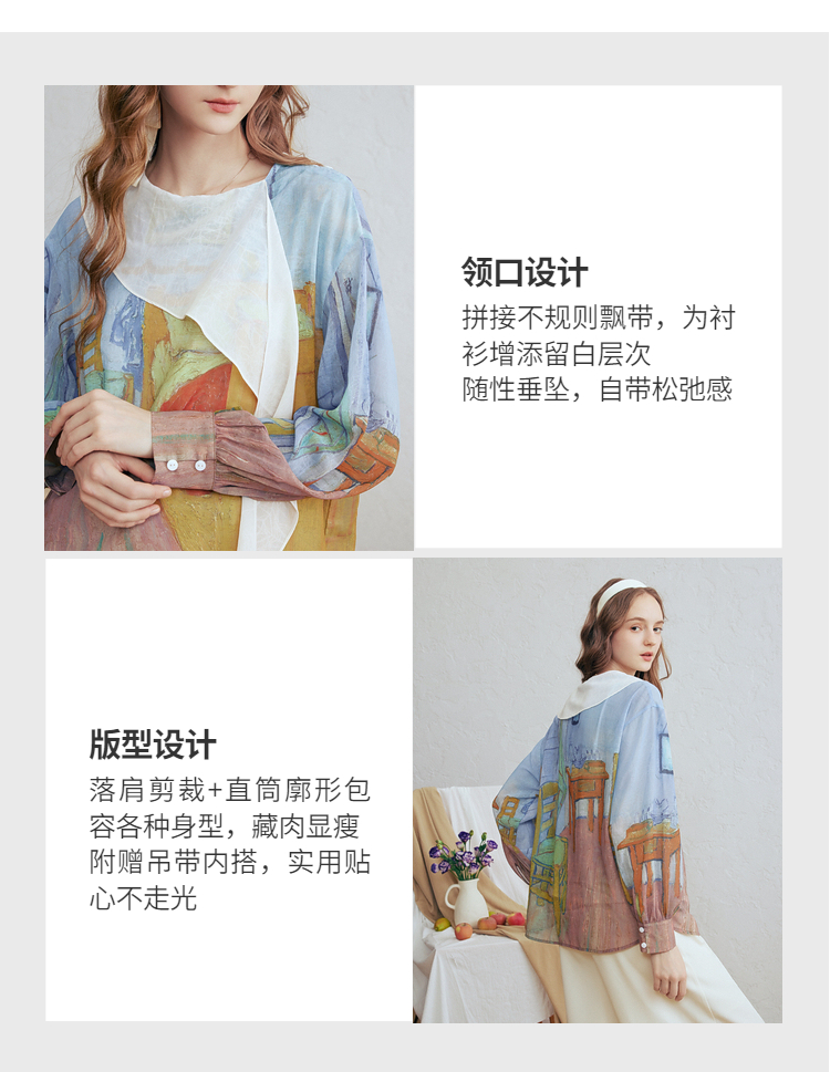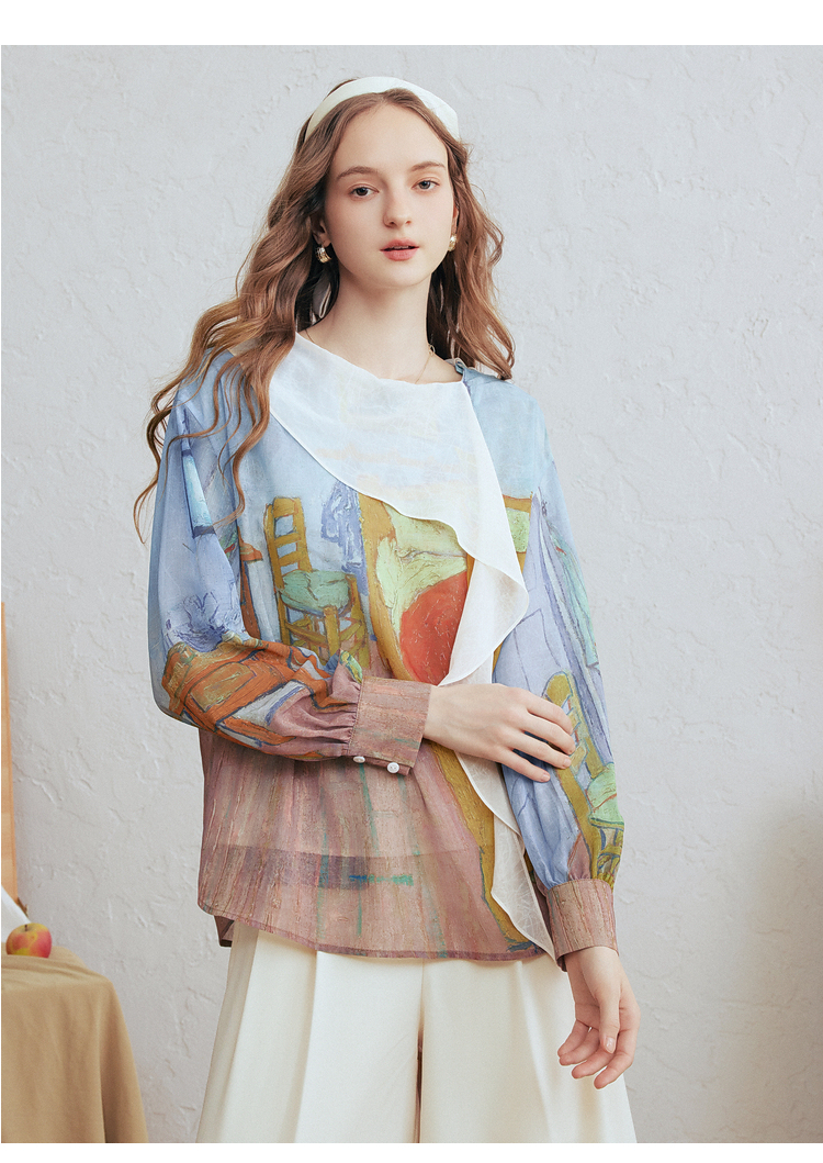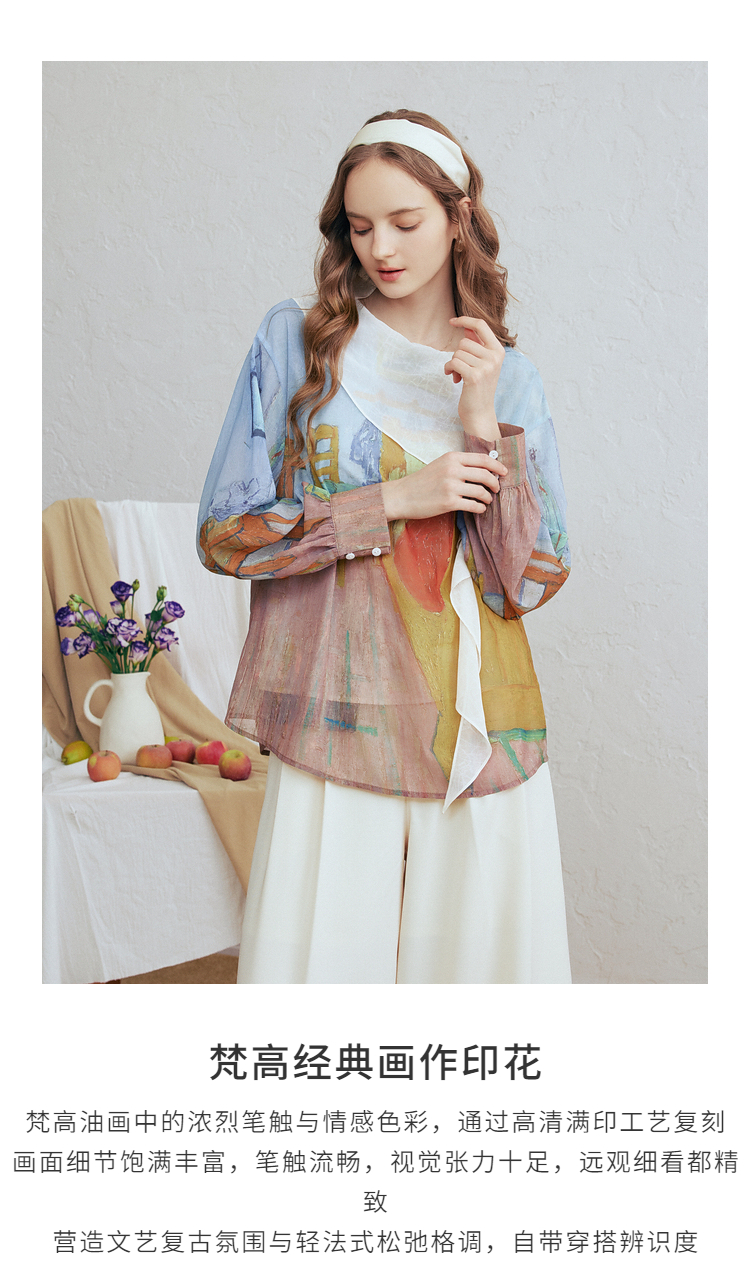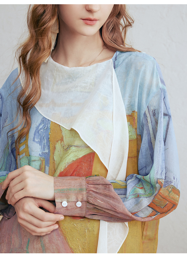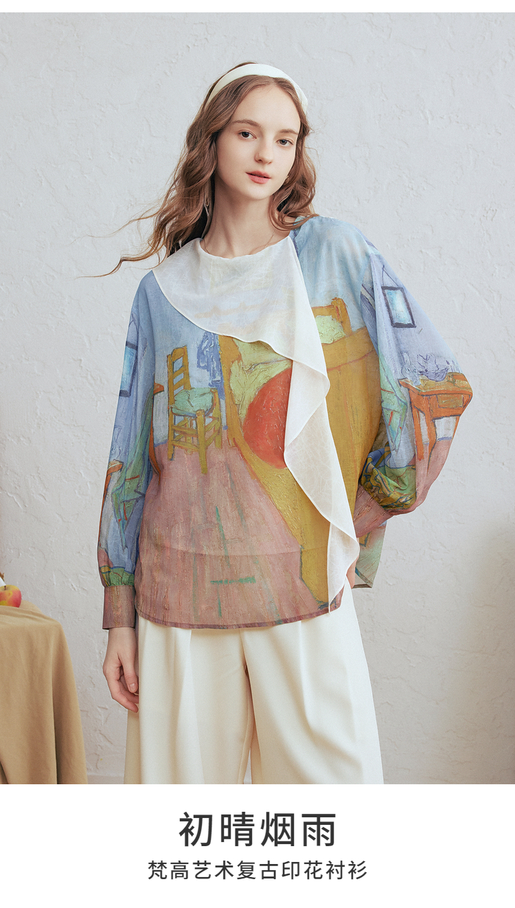 两三事梵高文艺 初晴烟雨 2026春季新款飘带拼接两件套印花衬衫女