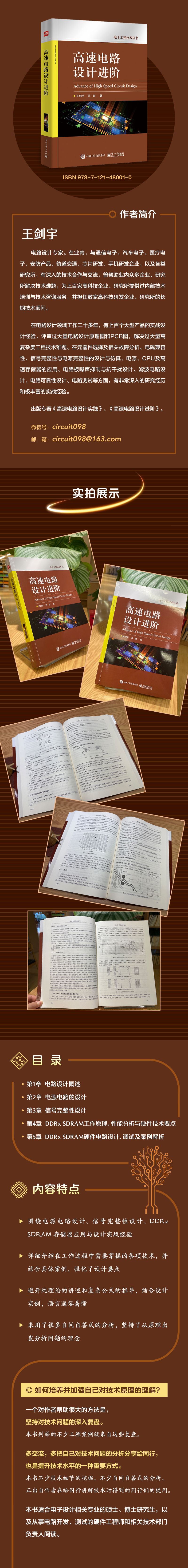 王剑宇,电路设计专家。在业内,与通信电子、汽车电子、医疗电子、安防产品、轨道交通、芯片研发、手机研发企业,以及各类研究所,有深入的技术合作与交流,曾帮助业内众多企业、研究所解决技术难题,为上百家高科技企业、研究所提供过内部技术培训与技术咨询服务,并担任数家高科技研发企业、研究所的长期技术顾问。在电路设计领域工作二十多年,有上百个大型产品的实战设计经验,评审过大量电路设计原理图和PCB图,解决过大量高复杂度工程技术难题。在元器件选择及相关故障分析、电磁兼容性、信号完整性与电源完整性的设计与仿真、电源、CPU及高速存储器的应用、电路板噪声抑制与抗干扰设计、滤波电路设计、电路可靠性设计、电路测试等方面,有非常深入的研究经历和极丰富的实战经验。出版专著《高速电路设计实践》、《高速电路设计进阶》。