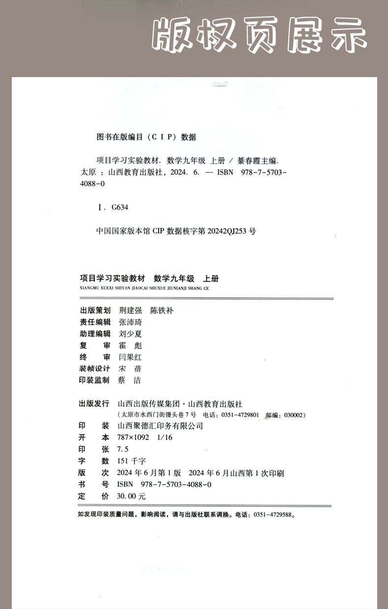 正版 项目学习实验教材 数学 九年级上册 綦春霞主编 山西教育出版社出版