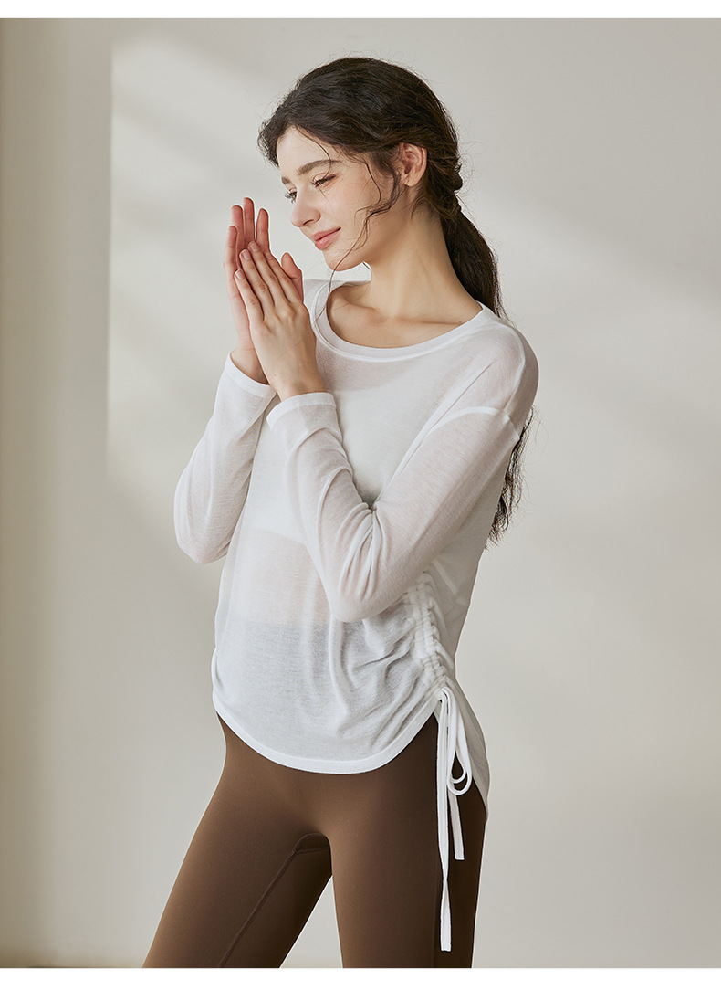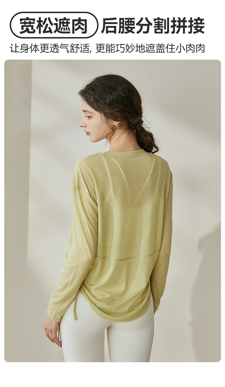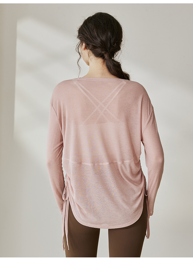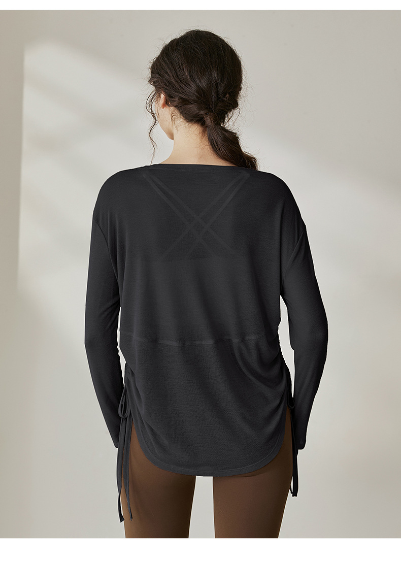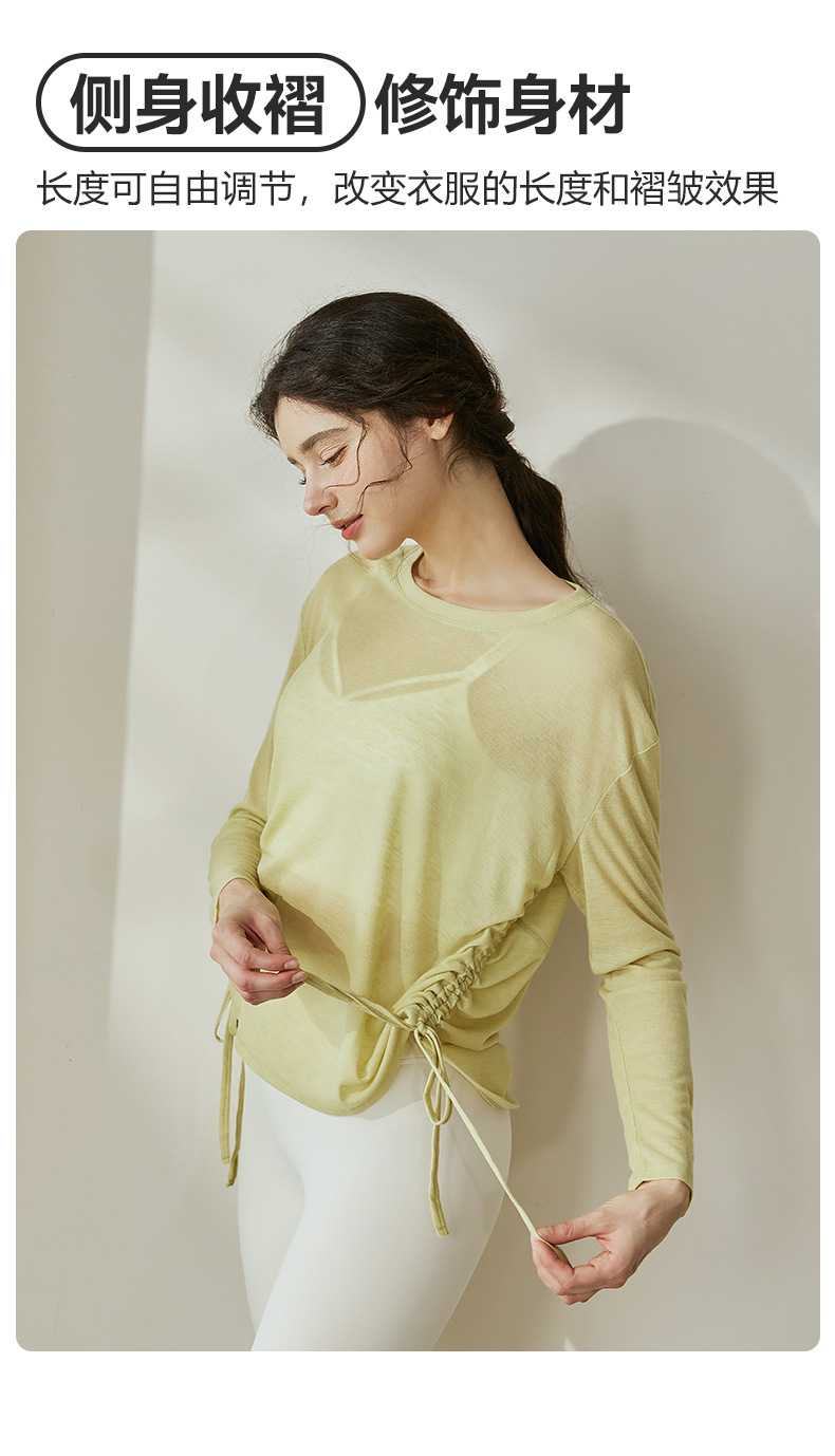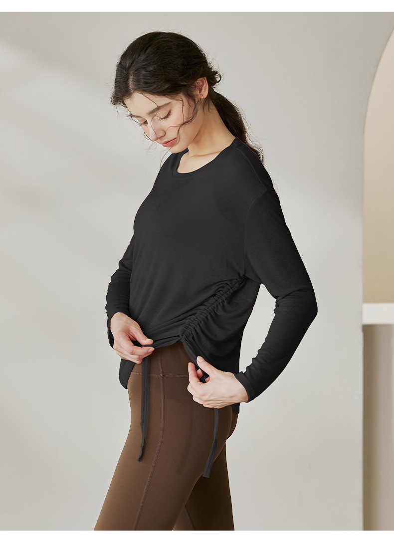 瑜伽服女夏季新款遮臀褶皱抽绳长袖t恤运动户外宽松休闲健身罩衫