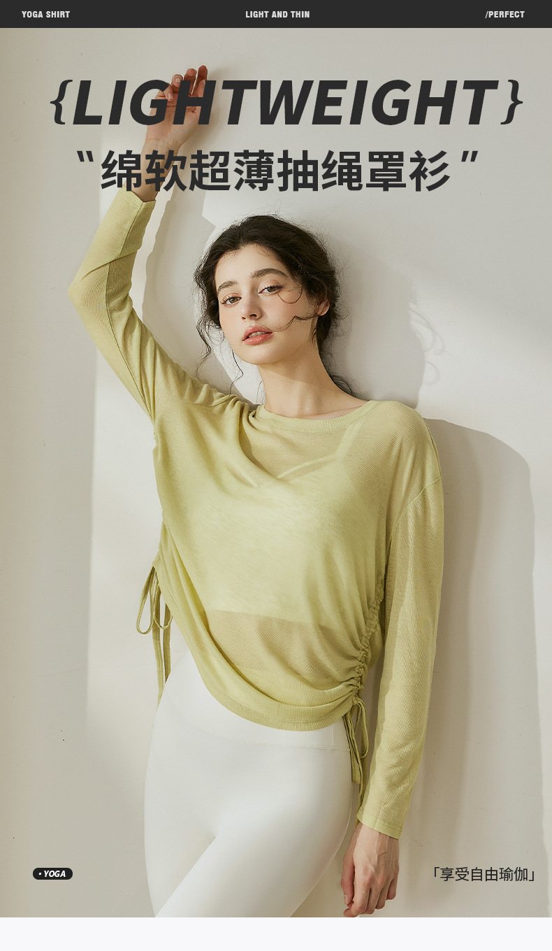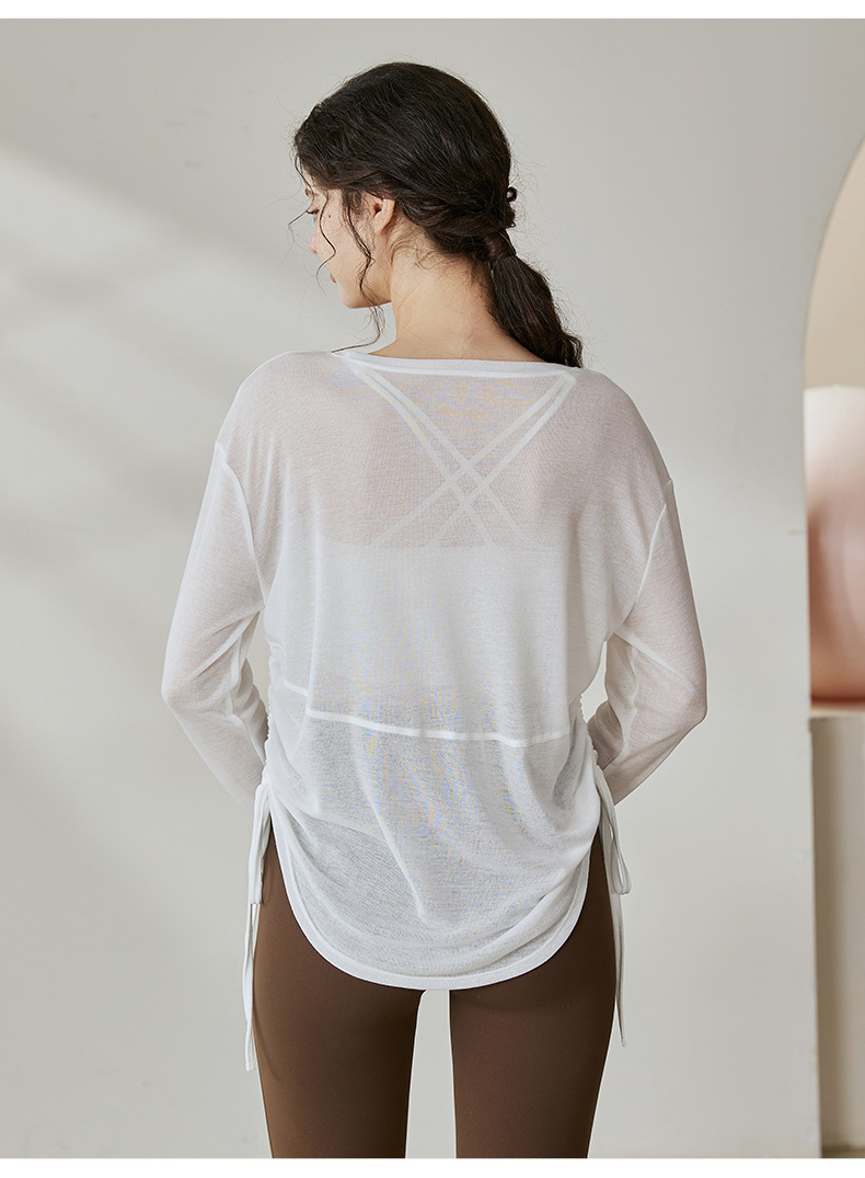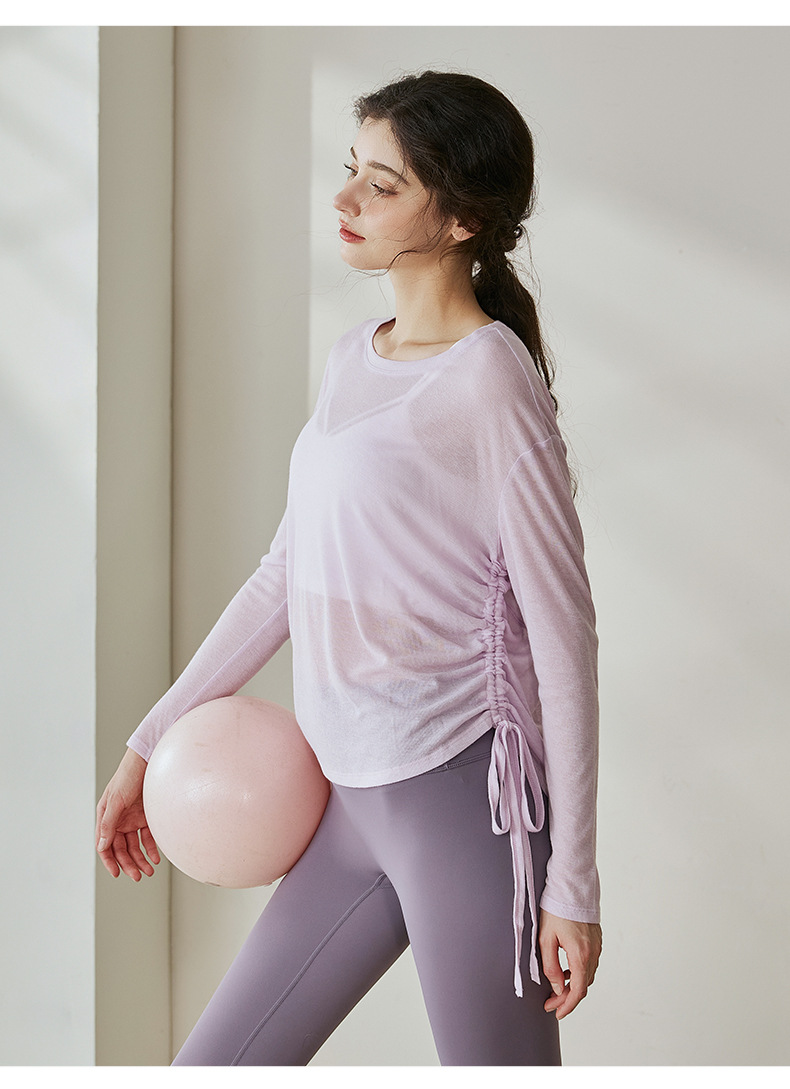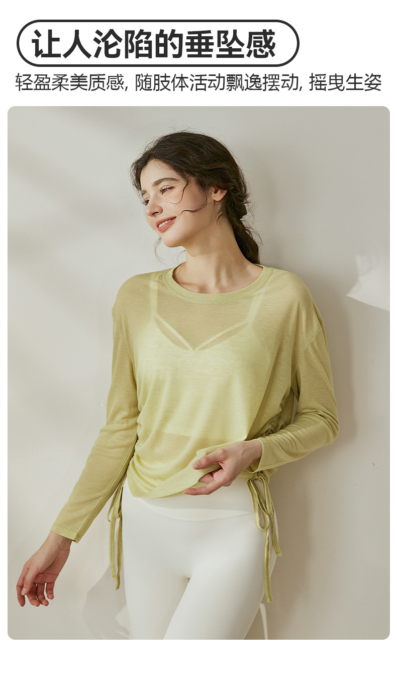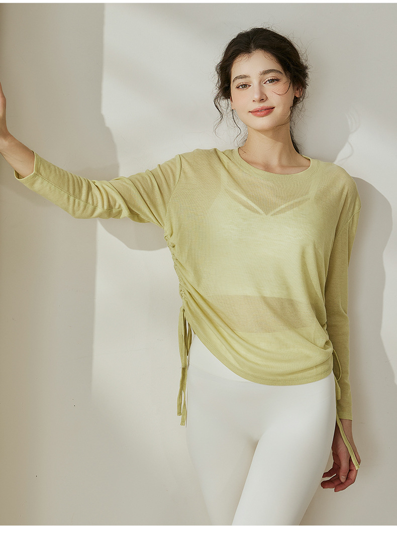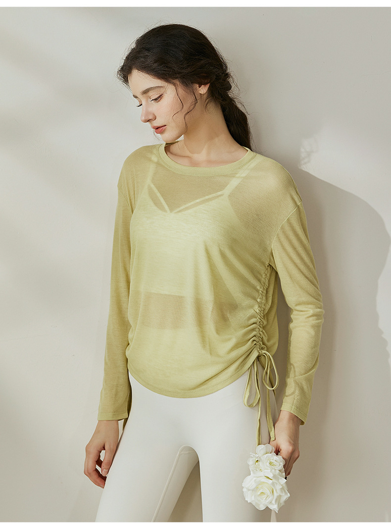 瑜伽服女夏季新款遮臀褶皱抽绳长袖t恤运动户外宽松休闲健身罩衫