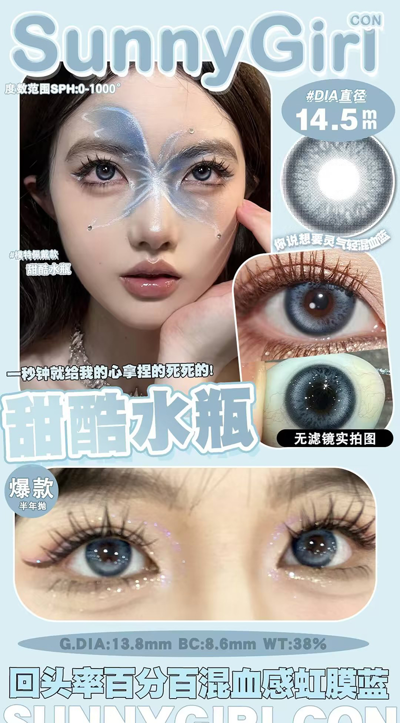 Sunny Girl 甜酷水瓶 半年抛 两片 14.5mm 参考着色13.8mm 基弧8.6 含水38% 新锐国货