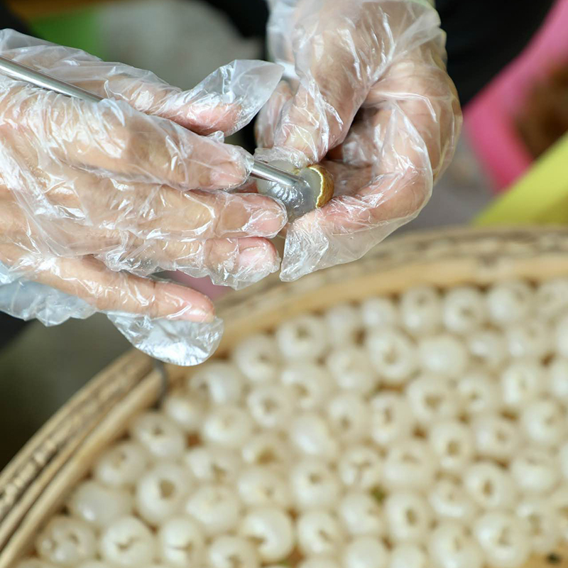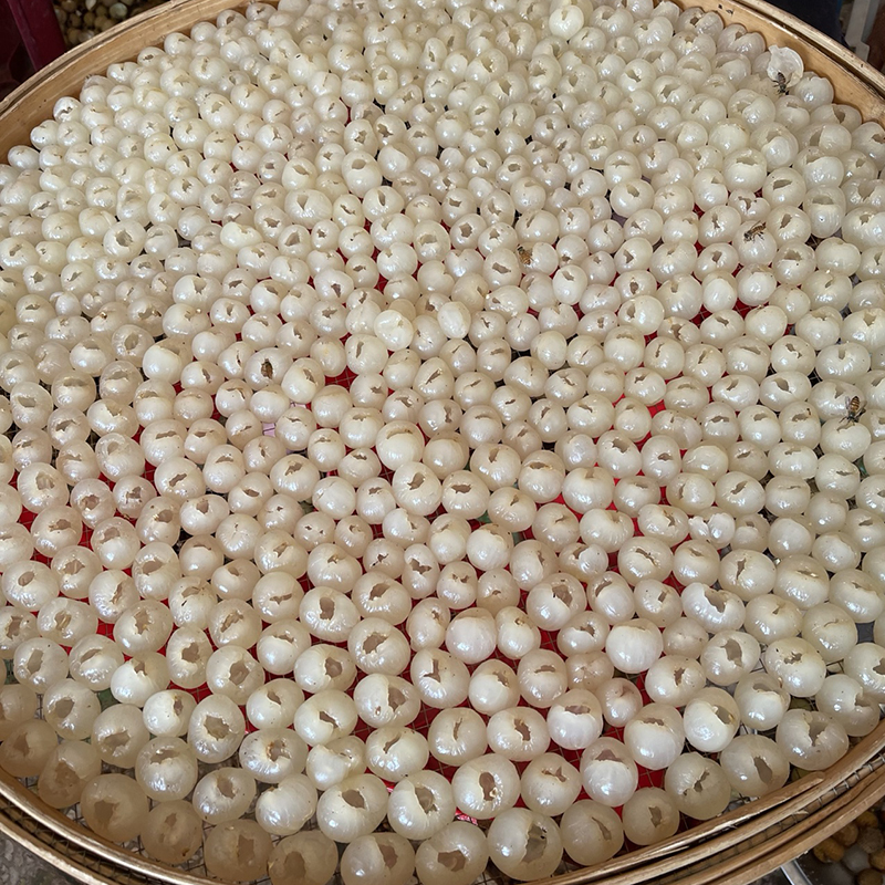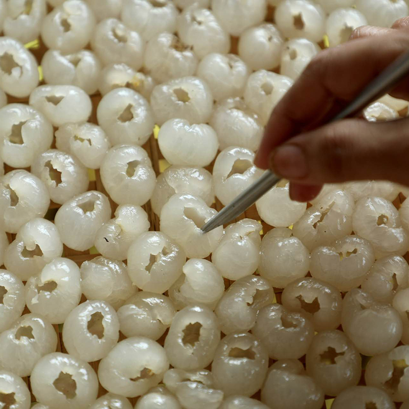 每一个都是手工去壳、去核,精细讲究。剥掉果皮,采用圆筒去核刀,取出果核,果肉呈灯笼状整齐摆放。