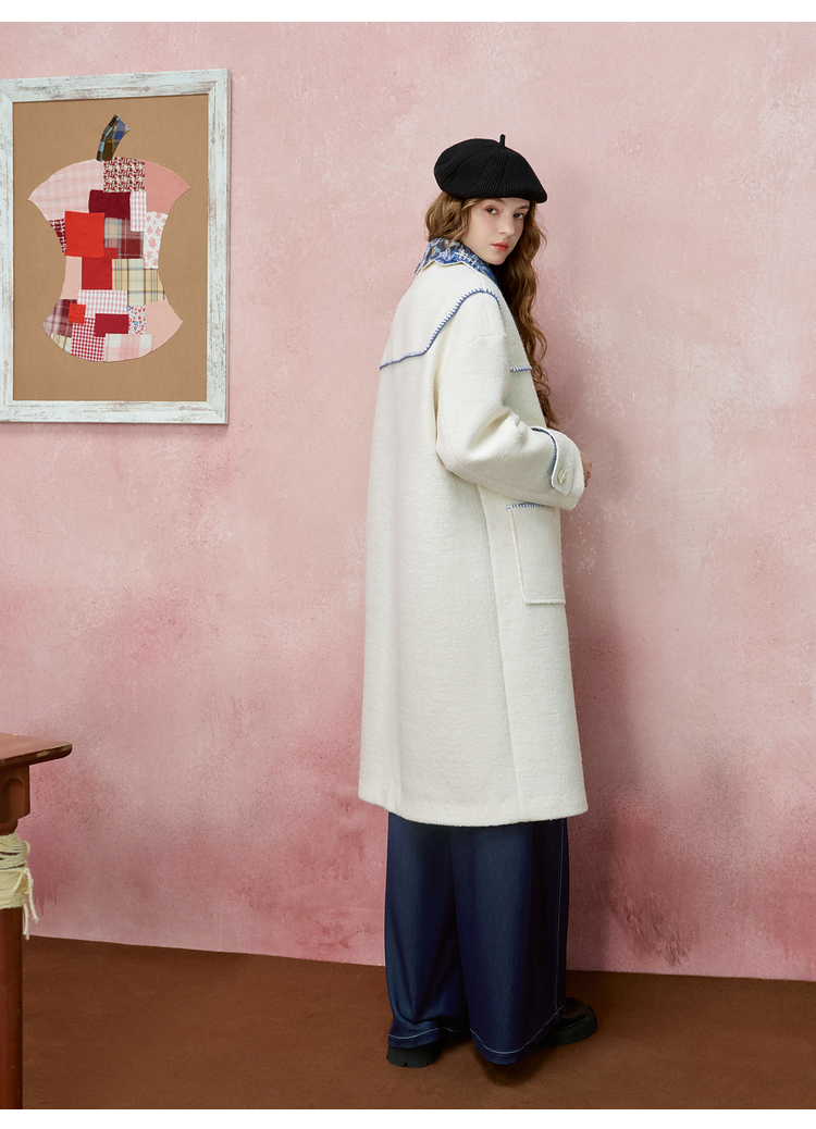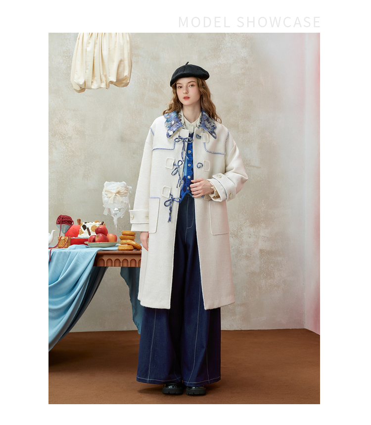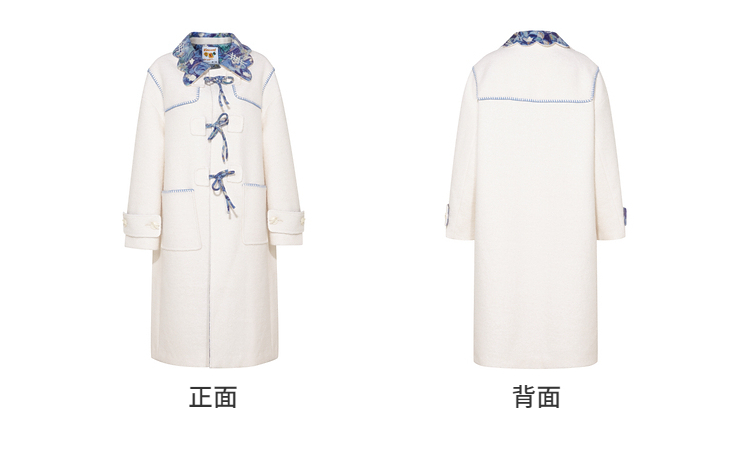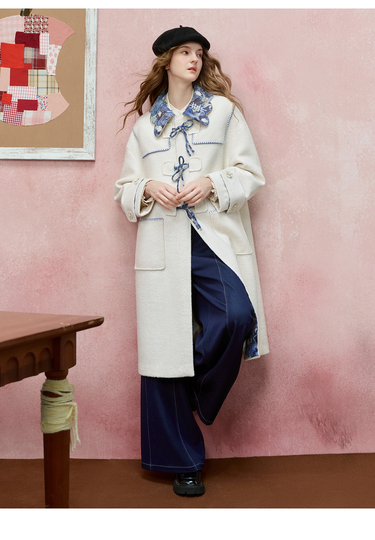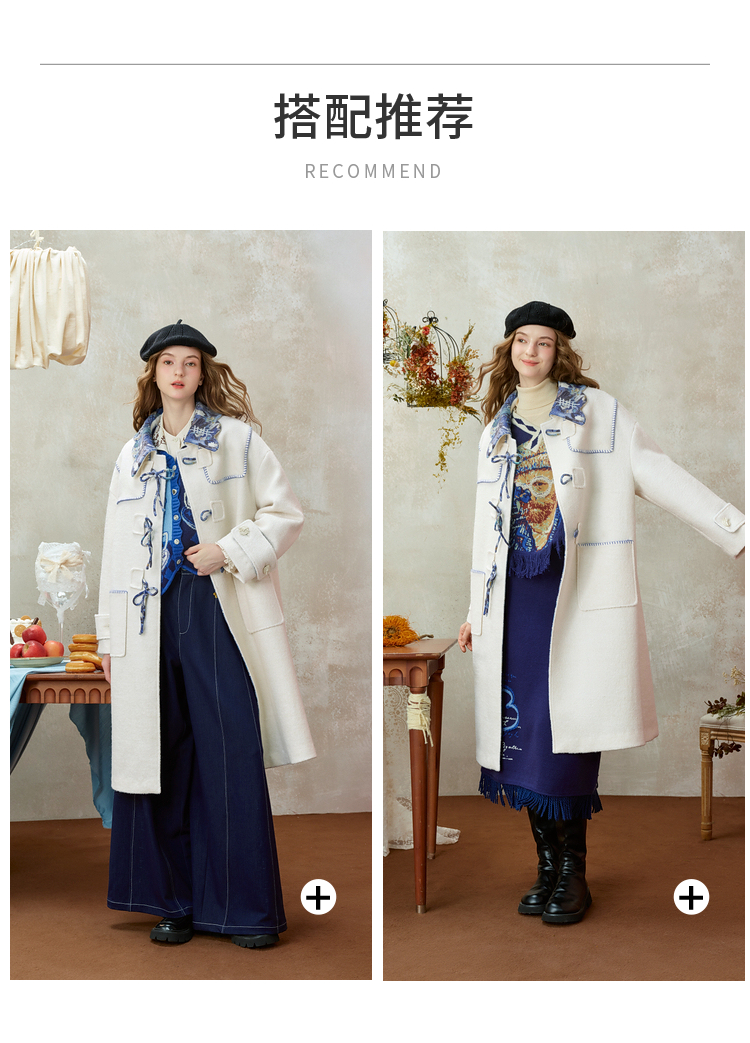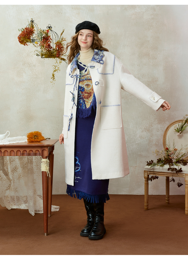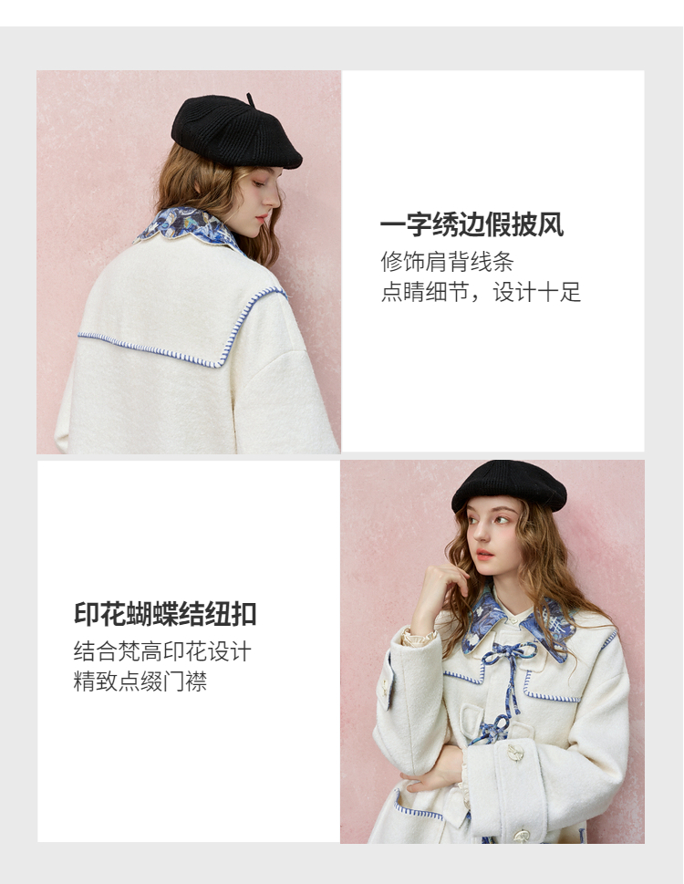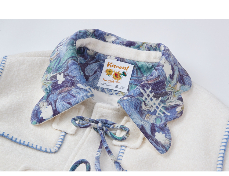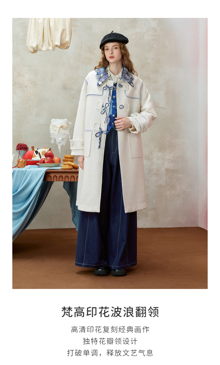 【暖冬内购】两三事梵高文艺鸢语花意2025冬季新款复古印花翻领绑带毛呢外套女