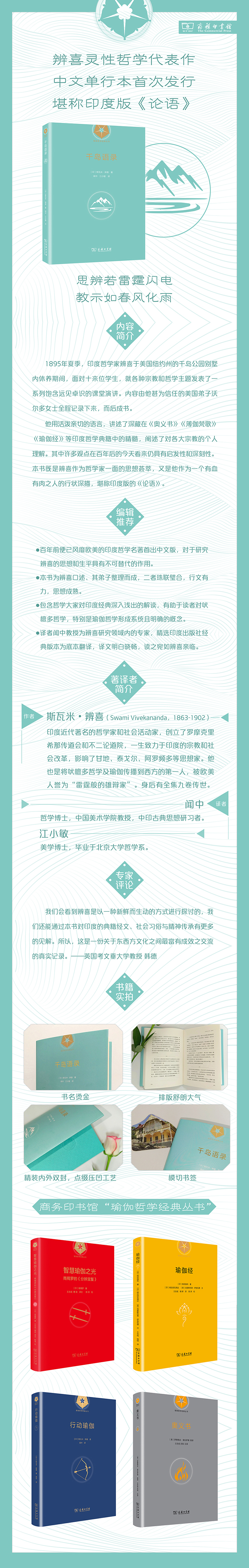 我们会看到辨喜是以一种新鲜而生动的方式进行探讨的,我们还能通过本书对印度的典籍经文、社会习俗与精神传承有更多的见解。所以,这是一份关于东西方文化之间最富有成效之交流的真实记录。