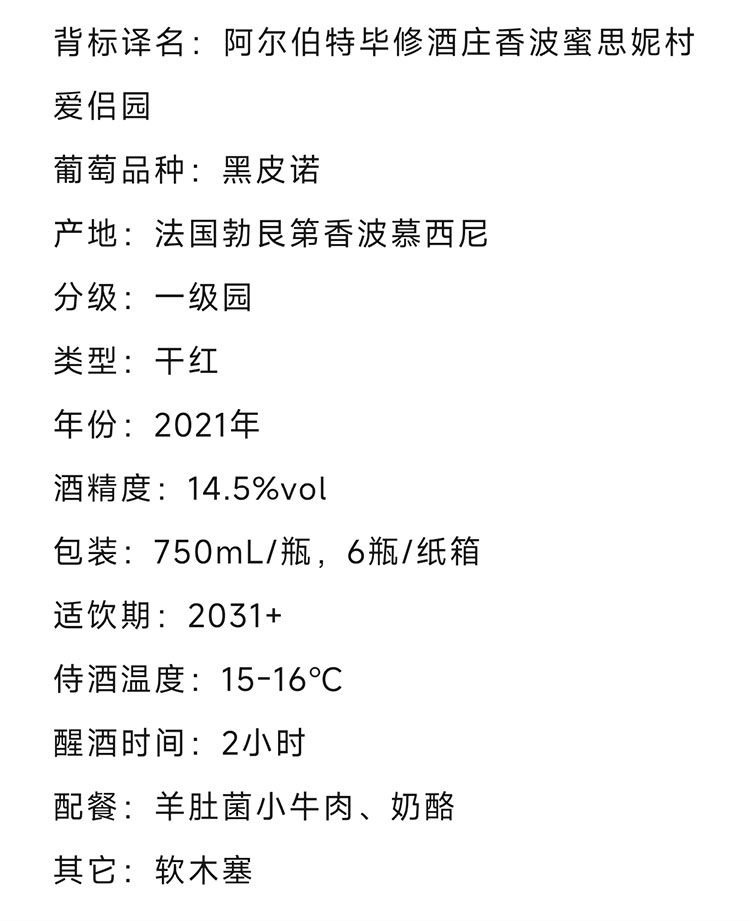 【售完无补】2021年亚伯必修酒庄香波慕西尼爱侣一级园黑皮诺干红