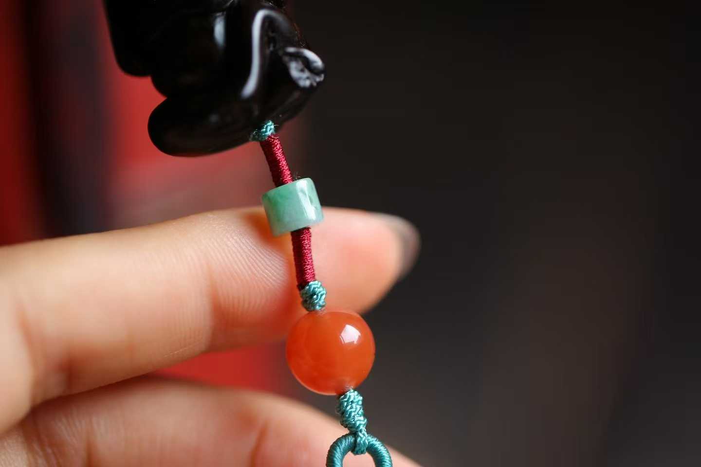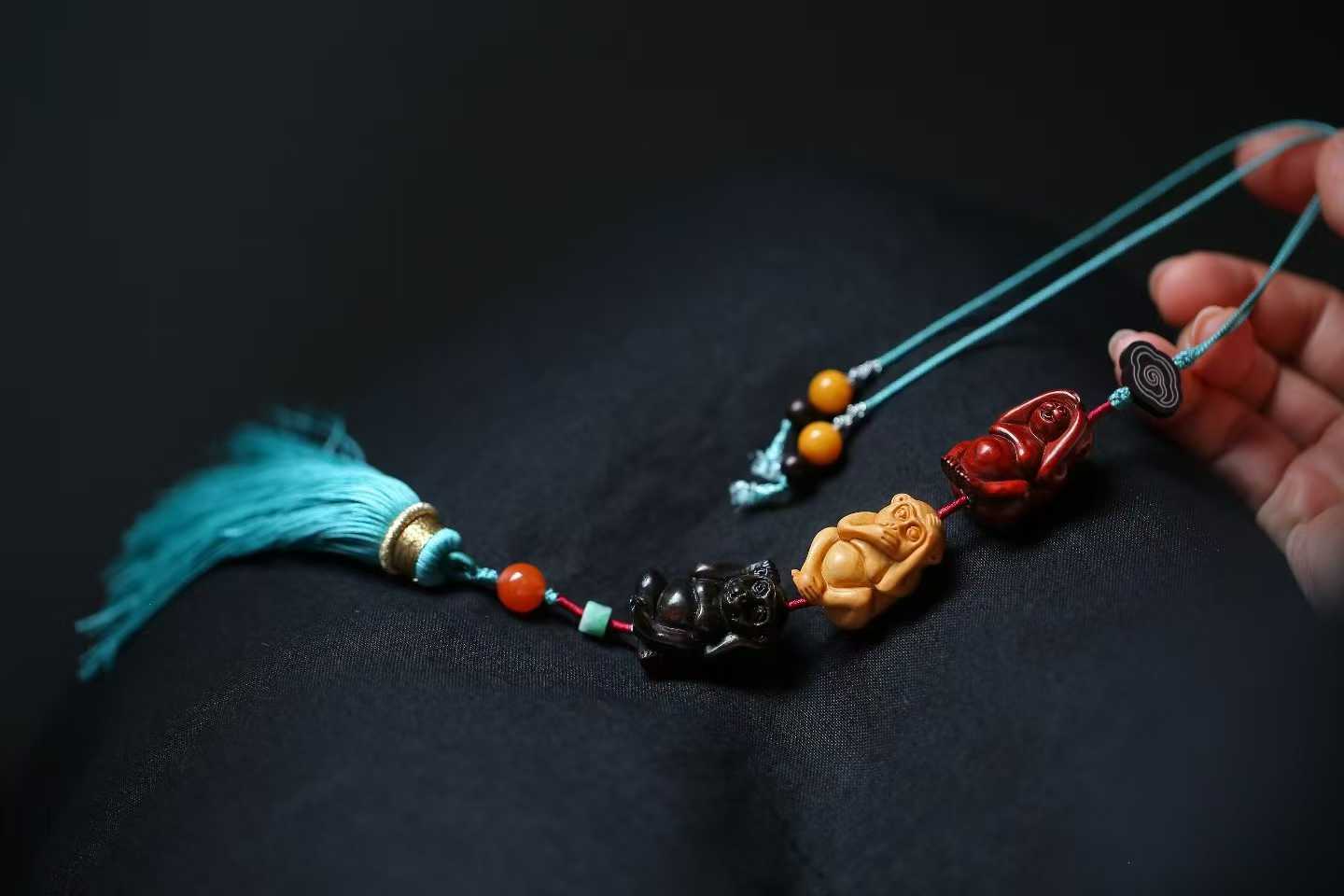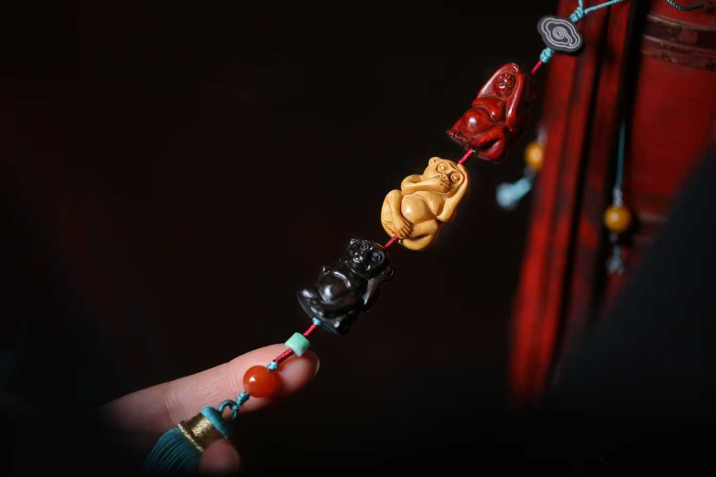 三只猴子自上而下呈悬挂姿势的竖形挂件,模样俏皮可爱;