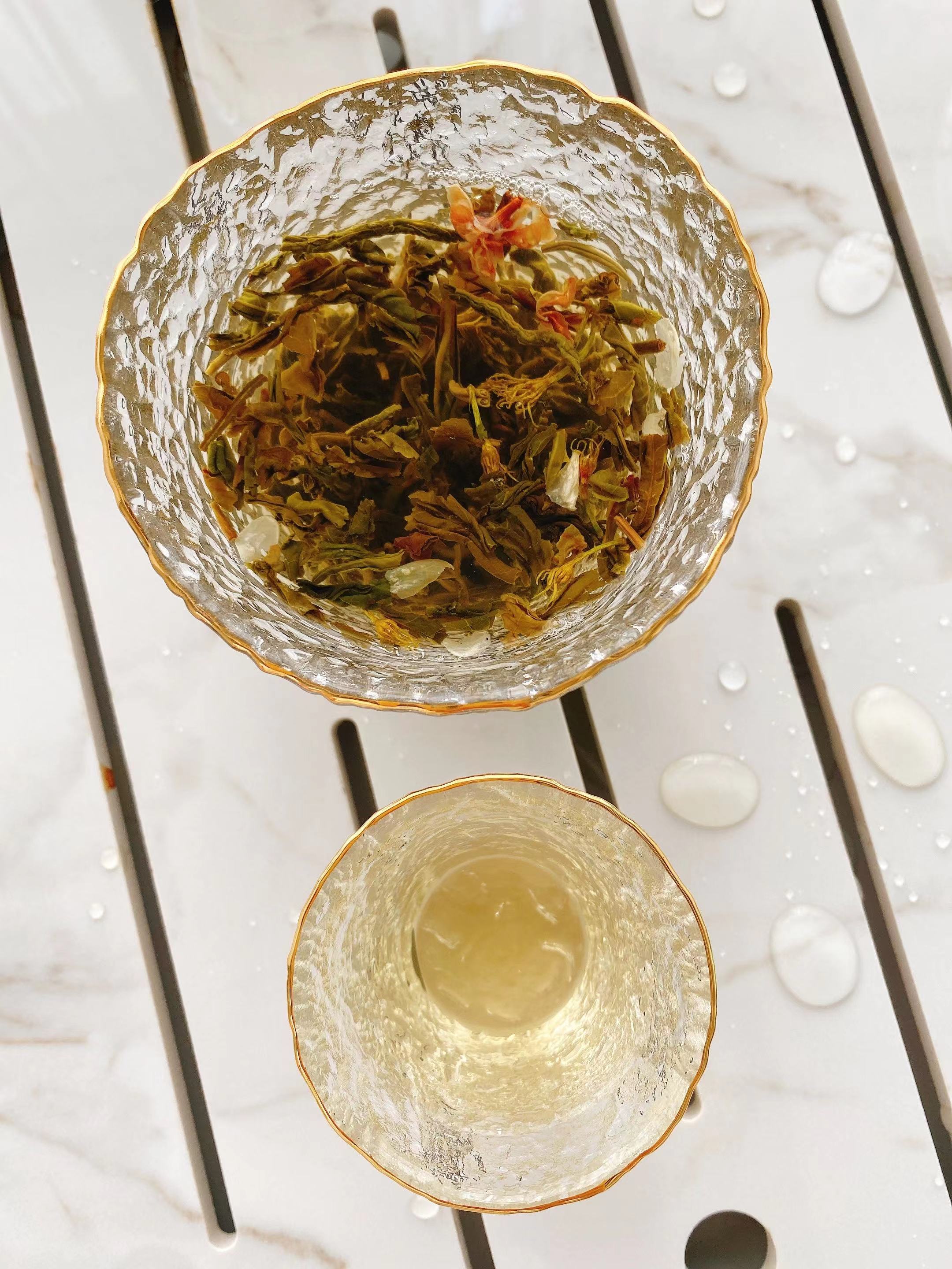 茉莉花茶汤色黄绿明亮,花香透过茶汤弥散