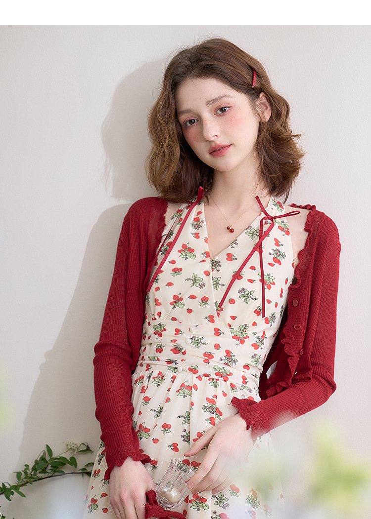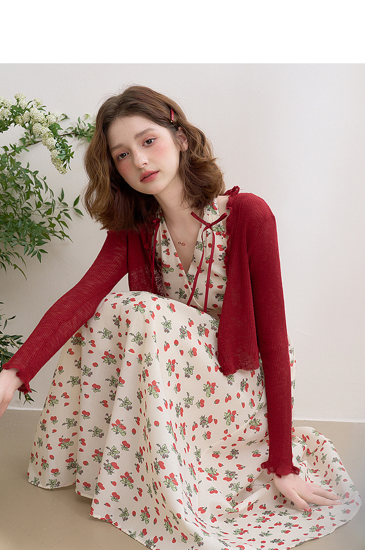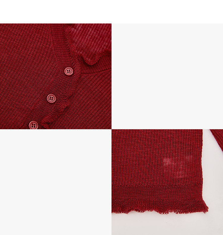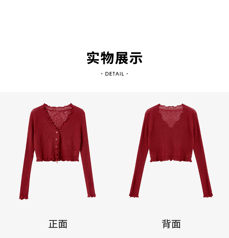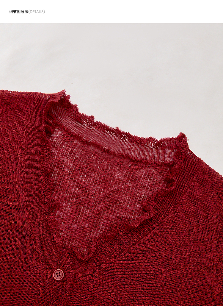 西遇薄款针织开衫女夏季新款木耳边红色短款外搭空调衫上衣D0050484