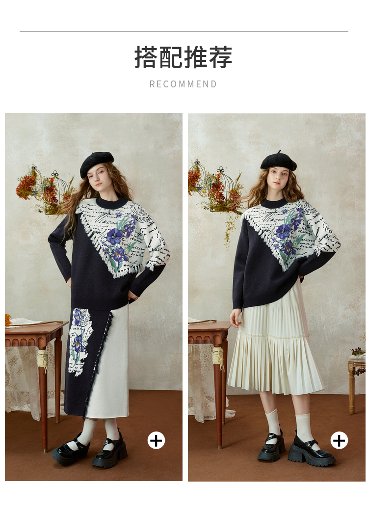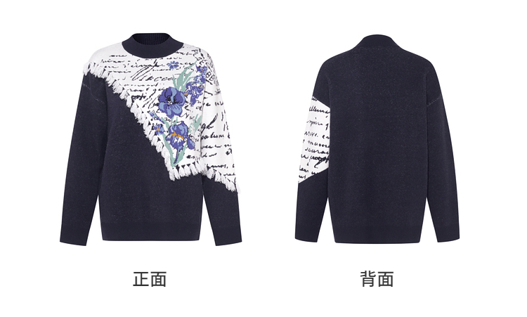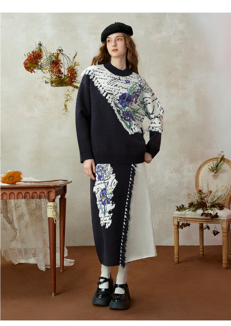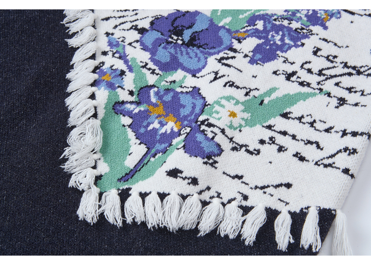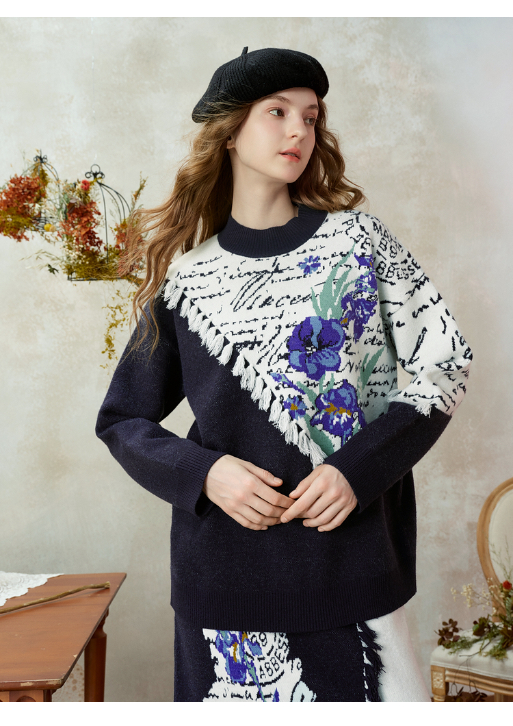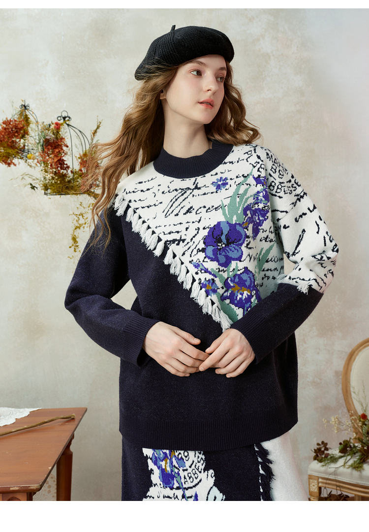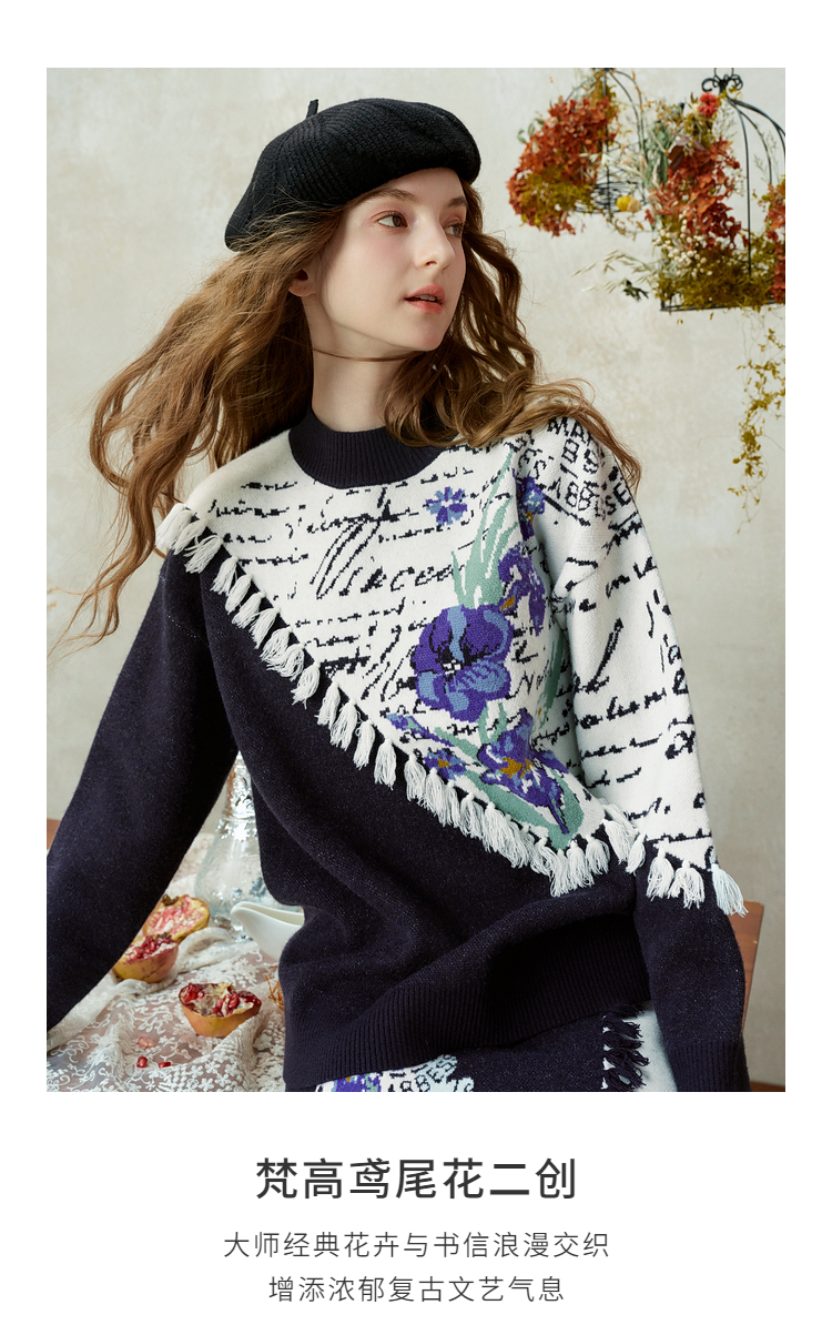 两三事梵高文艺三行情诗2025冬季新款花卉提花拼色流苏套头毛衣女