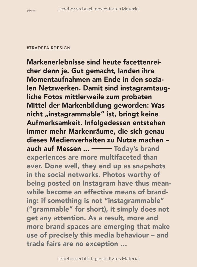 Current brand communication is increasingly moving towards real-digital narratives. The storytelling trend plays a major role in this, as well as the type of communication, in times of complete digitization. Particularly at trade fairs, personal discussion is still the key aspect of every presentation. With this edition of the Trade Fair Design Annual, the authors present a series of successful examples of transmedia storytelling, attaching particular importance to the accomplished use of means of communication. What is decisive, however, is the exceptional design of the overall presentation, which can add communicative and therefore informative value for the exhibitor, as well as provide an emotional experience for the visitors."