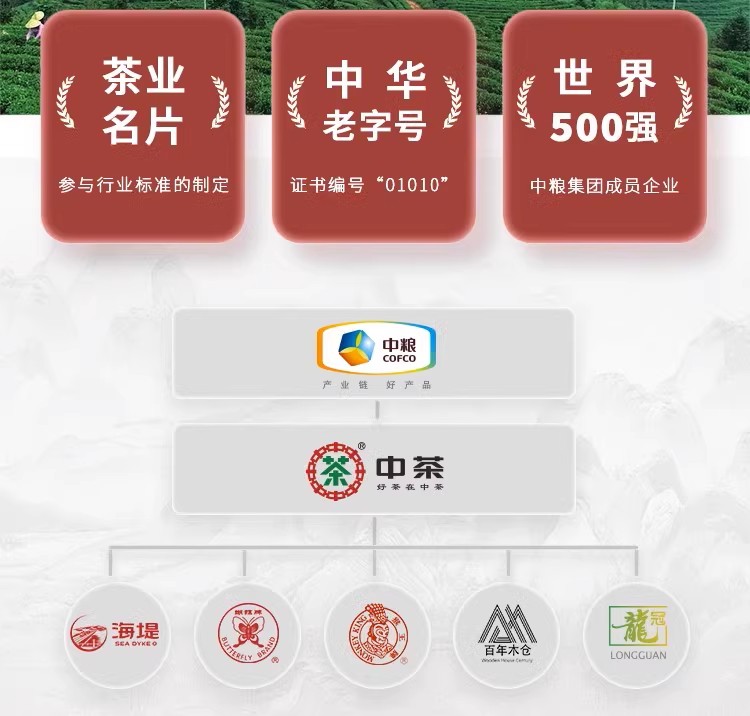 中茶是中粮集团十八个专业化公司之一和集团重点打造的十二条粮油食品产业链之一。中国茶叶以继承和发展中华传统茶文化为使命,秉承自然、生态、安全、健康的理念。
