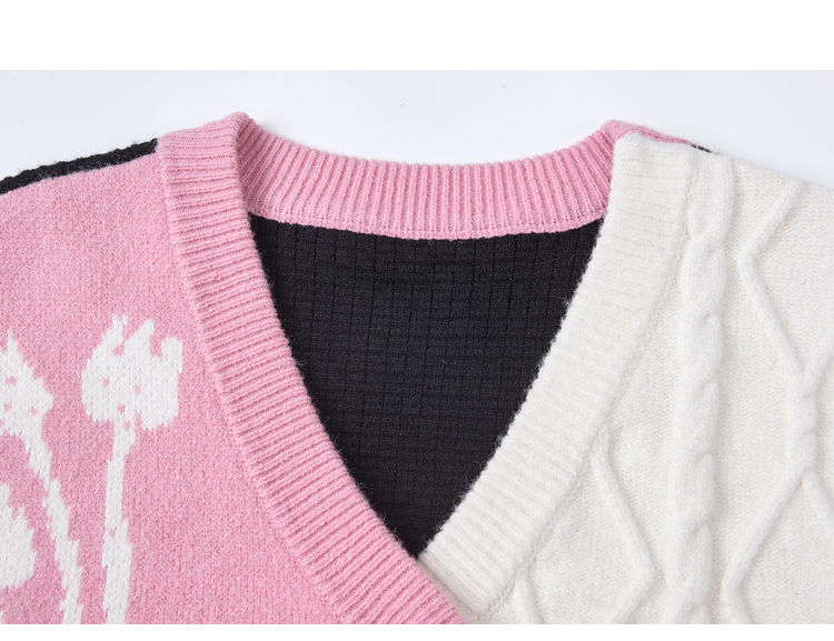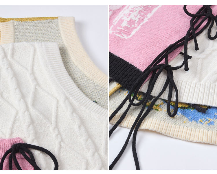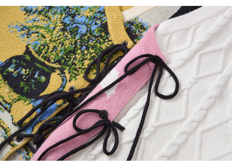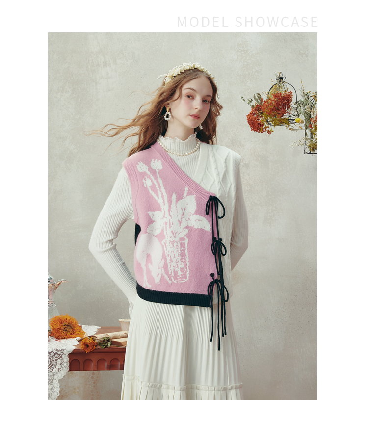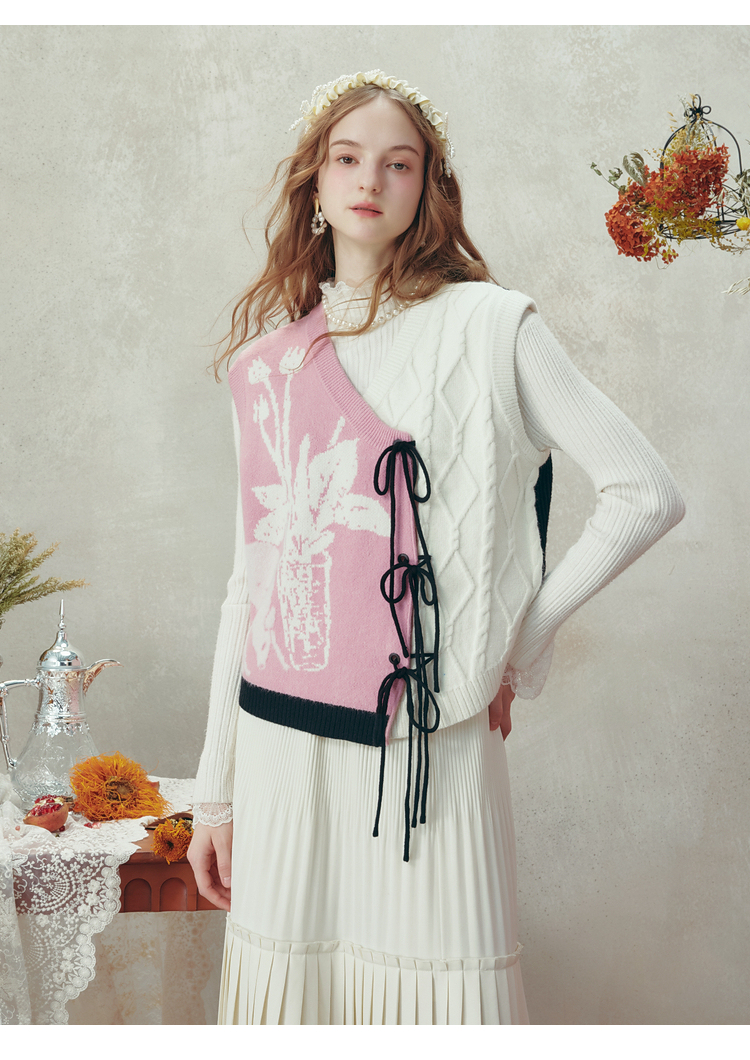 两三事梵高文艺微风情书2025冬季新款花卉图案斜边绑带毛织马甲女