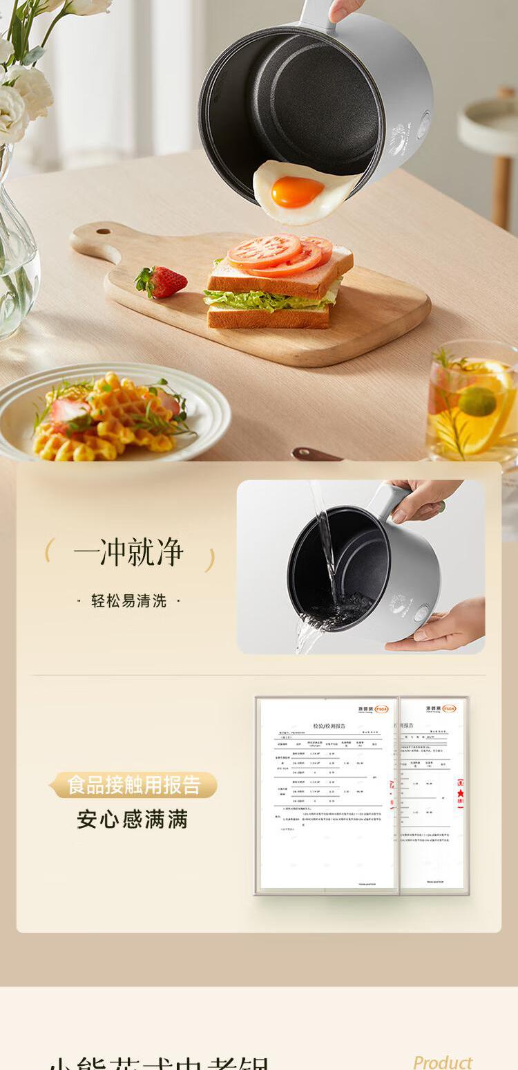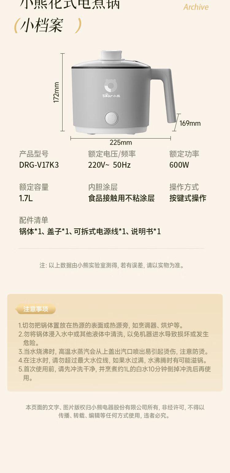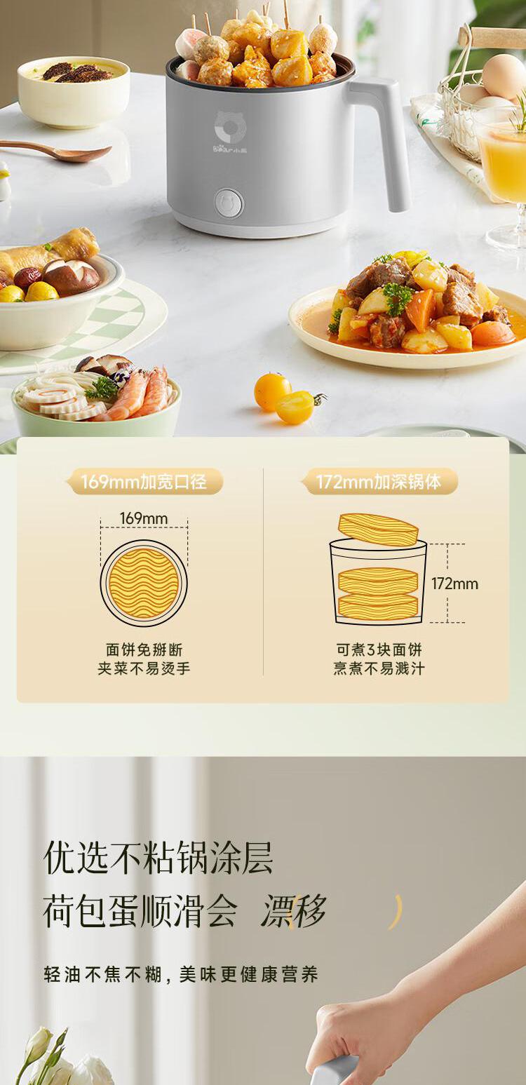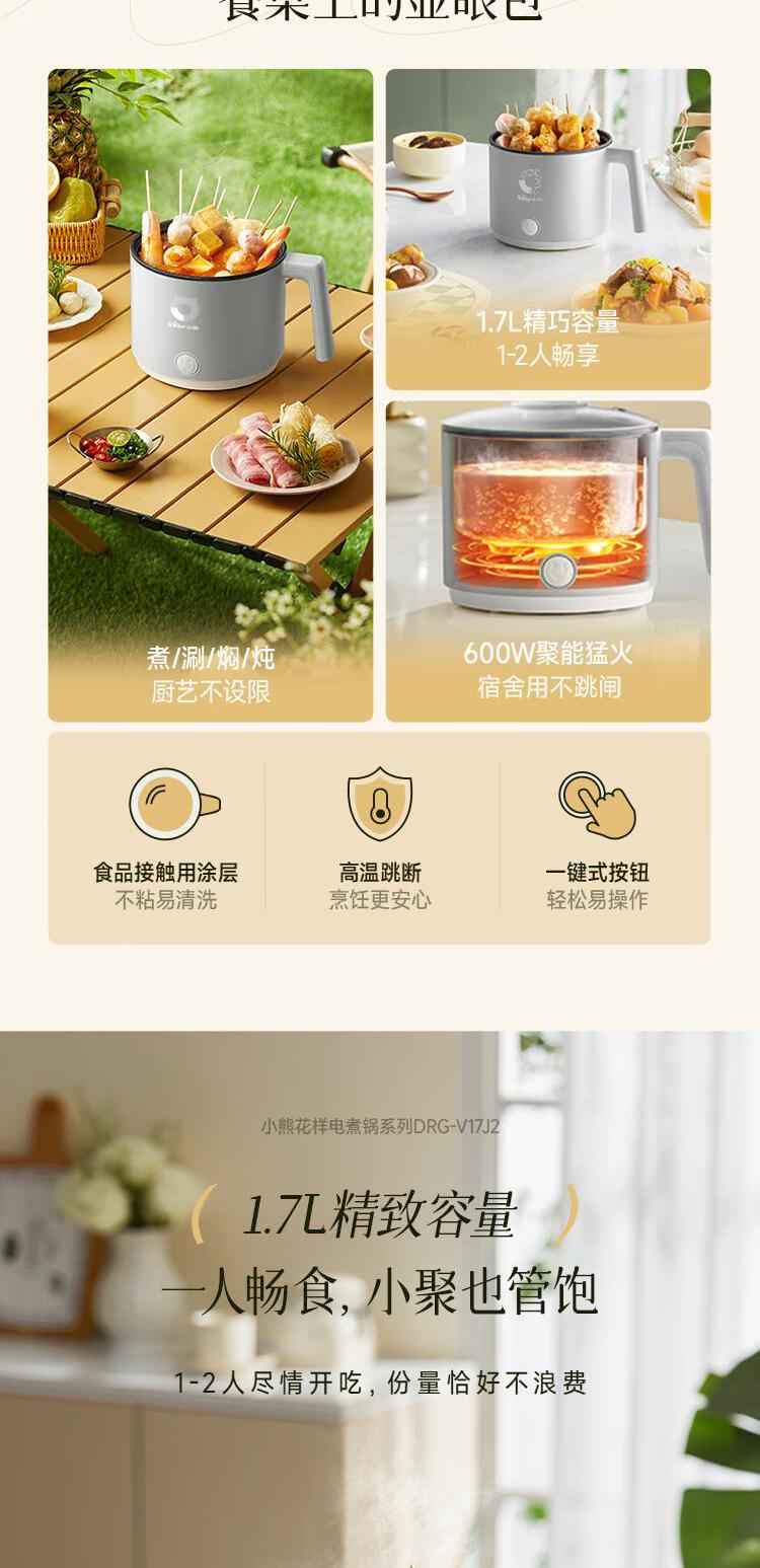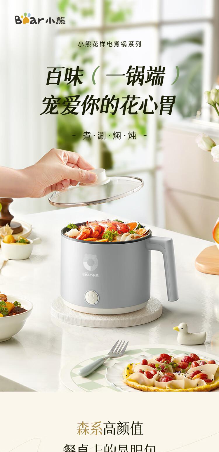 【自营】小熊(Bear)电煮锅 宿舍小电锅泡面小火锅 多用途锅多功能蒸煮一体 电蒸锅 电热锅 DRG-V17K3两档火力不粘内胆蒸笼款上蒸下煮学生神器
