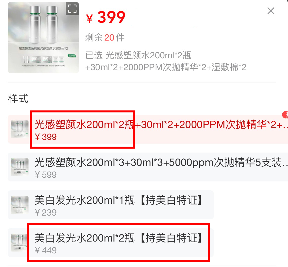 选规格的时候:同样是两瓶发光水,为什么有两个不同价格?