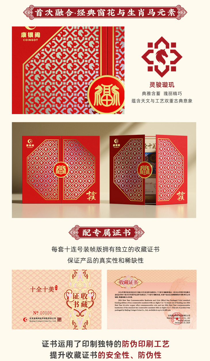 【康银阁】2026贺岁纪念钞(标准无4、7十连号)纪念币盲盒装帧版 ·《十全十美》