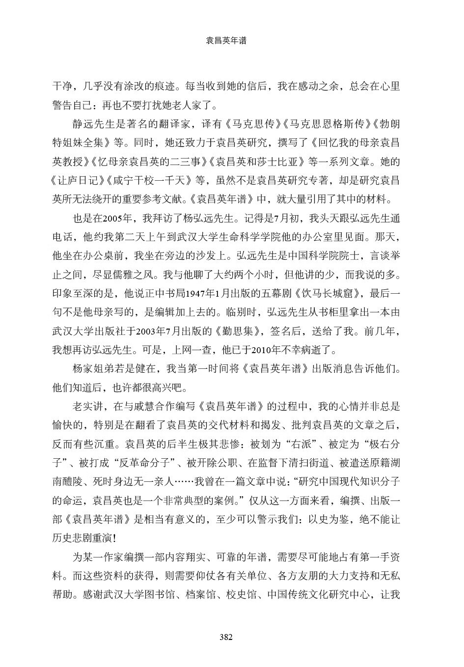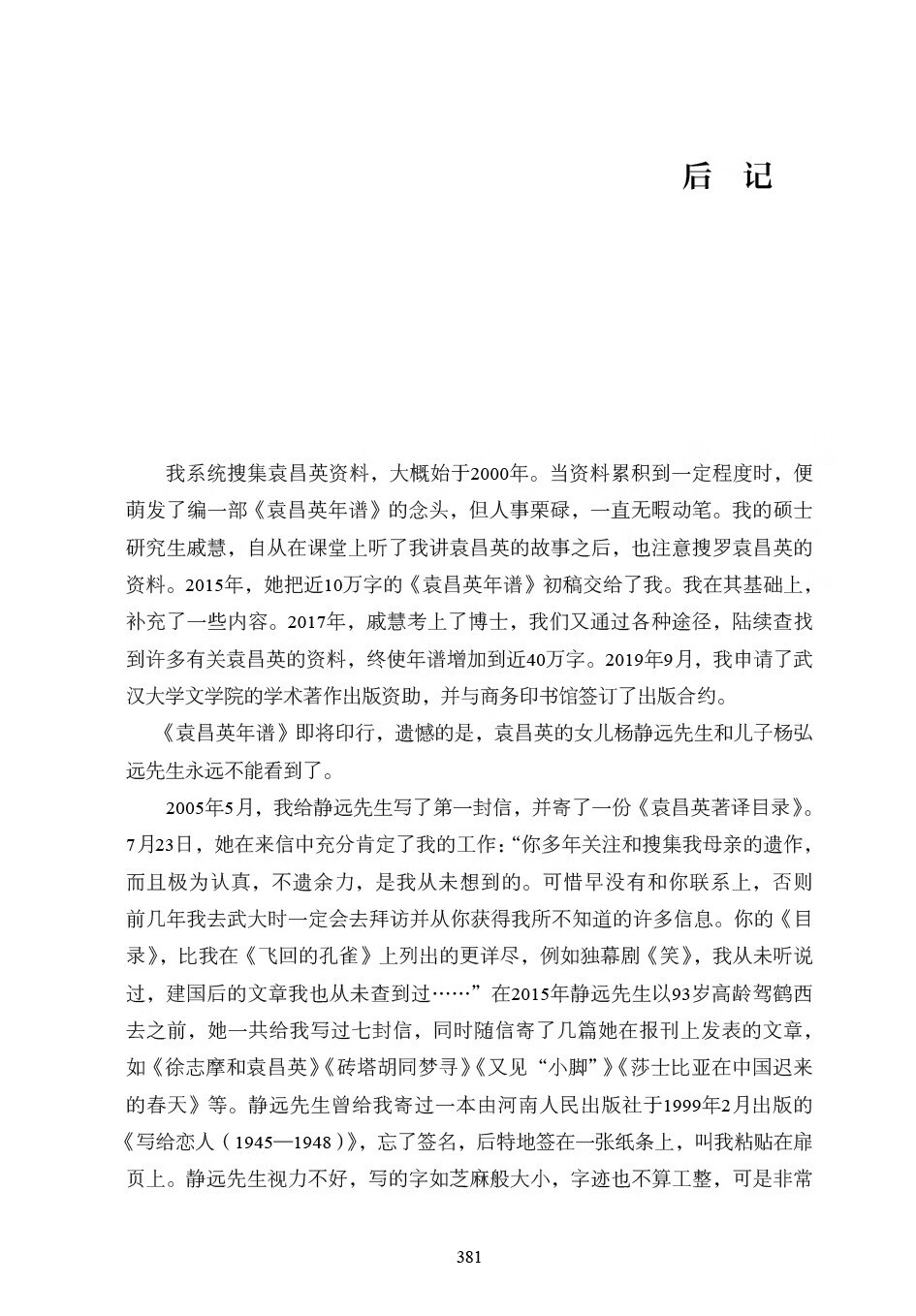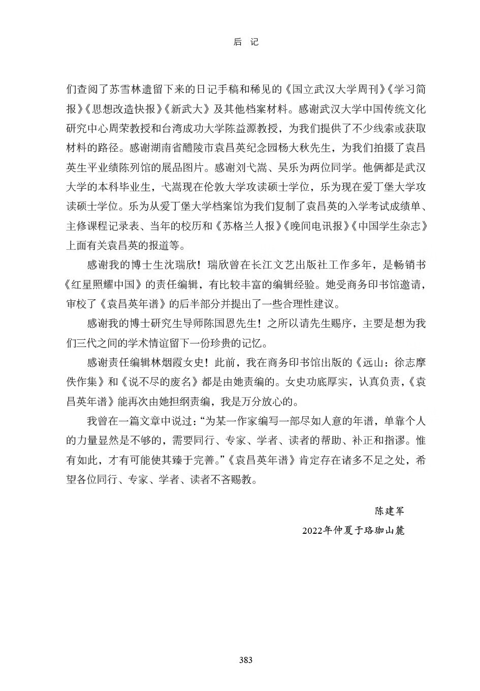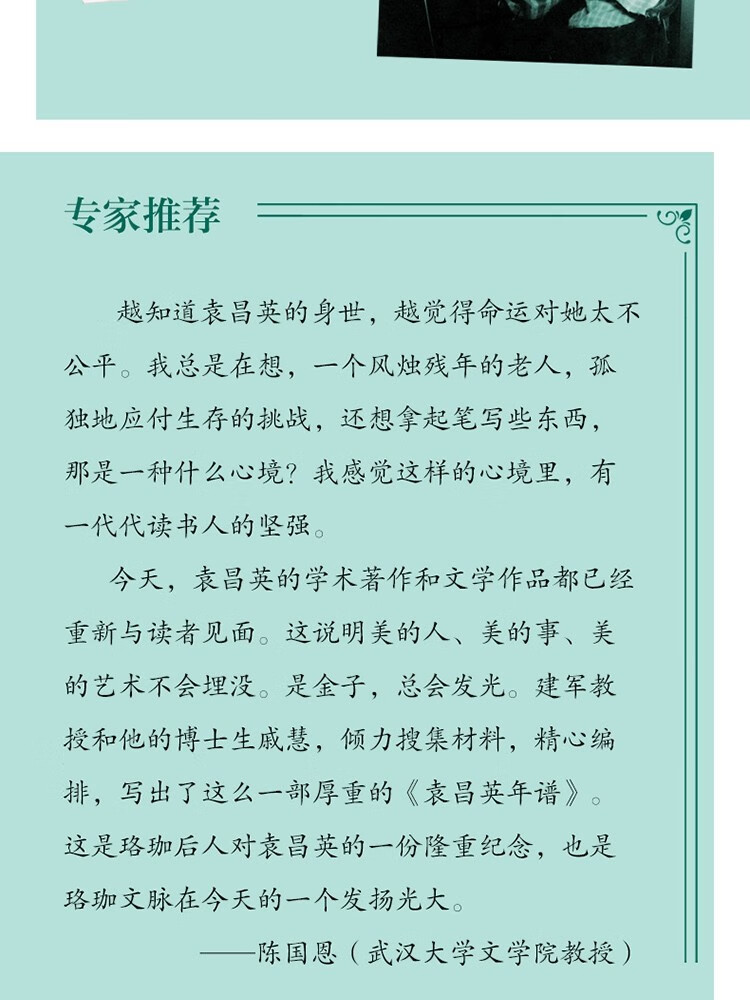 今天,袁昌英的学术著作和文学作品都已经重新与读者见面。这说明美的人、美的事、美的艺术不会埋没。是金子,总会发光。建军教授和他的博士生戚慧,倾力搜集材料,精心编排,写出了这么一部厚重的《袁昌英年谱》。这是珞珈后人对袁昌英的一份隆重纪念,也是珞珈文脉在今天的一个发扬光大。