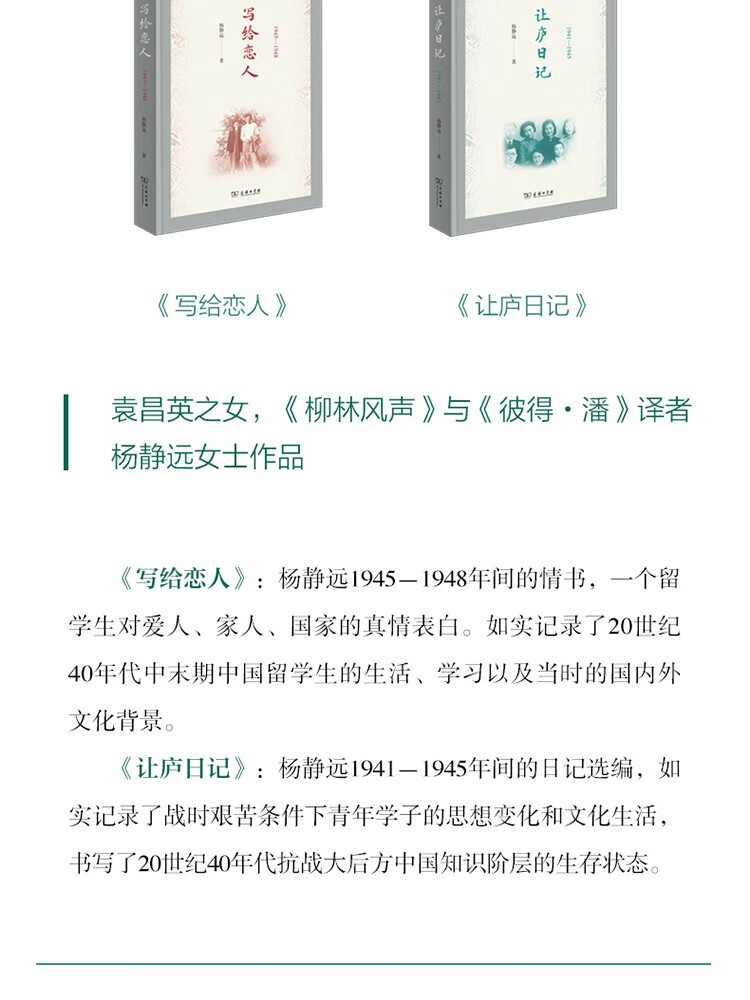 :杨静远1945—1948年间的情书,一个20世纪40年代的留学生对爱人、家人、国家的真情表白。如实记录了20世纪40年代中末期中国留学生的生活、学习以及当时的国内外文化背景。