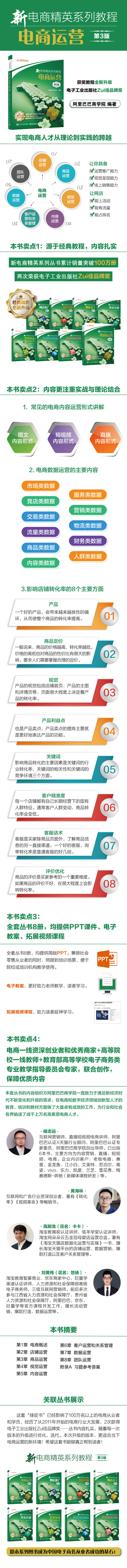 "电商精英系列教程”自2011年问世以来,伴随电子商务大潮在国内的兴起,已经热销100多万册,两次荣获电子工业出版社*牌奖,成为全国范围内颇具影响力的电子商务系列教程,是几代电商人和院校学员学习的"绿色记忆”,中间经过几个版本的更新迭代。2023年,"新电商精英系列教程”第3版问世! 本套丛书均配有PPT课件,由阿里巴巴商学院召集多位*秀电商讲师和电商领域的专家学者编写,丛书包括8本:《网店推广(第3版)》《电商直播》《电商运营(第3版)》《网店美工(第3版)》《网店客服(第3版)》《跨境电商物流》《跨境电商营销》《跨境电商独立站运营》。 《电商运营(第3版)》全面且深入的介绍了电商运营的知识和技能,从电商概述的基础知识开始介绍,进而深度阐述了店铺运营、商品运营、视觉运营、内容运营、客户运营和关系管理、数据运营和团队运营等电商运营相关工作内容。本书通过丰富的实战案例,让读者迅速掌握电商运营的相关知识和核心工具的使用,具有很强的可操作性。