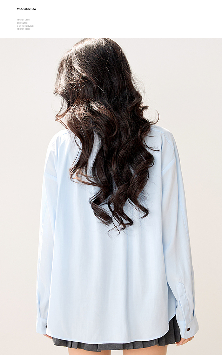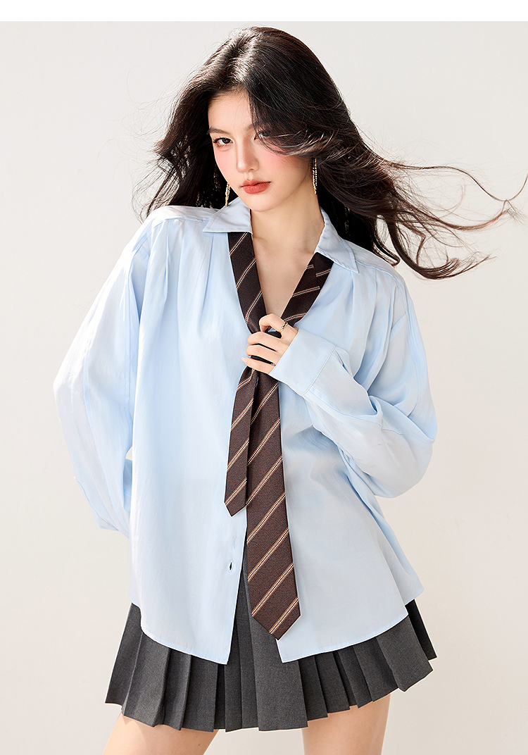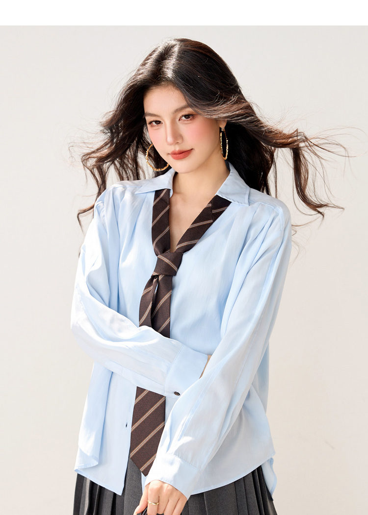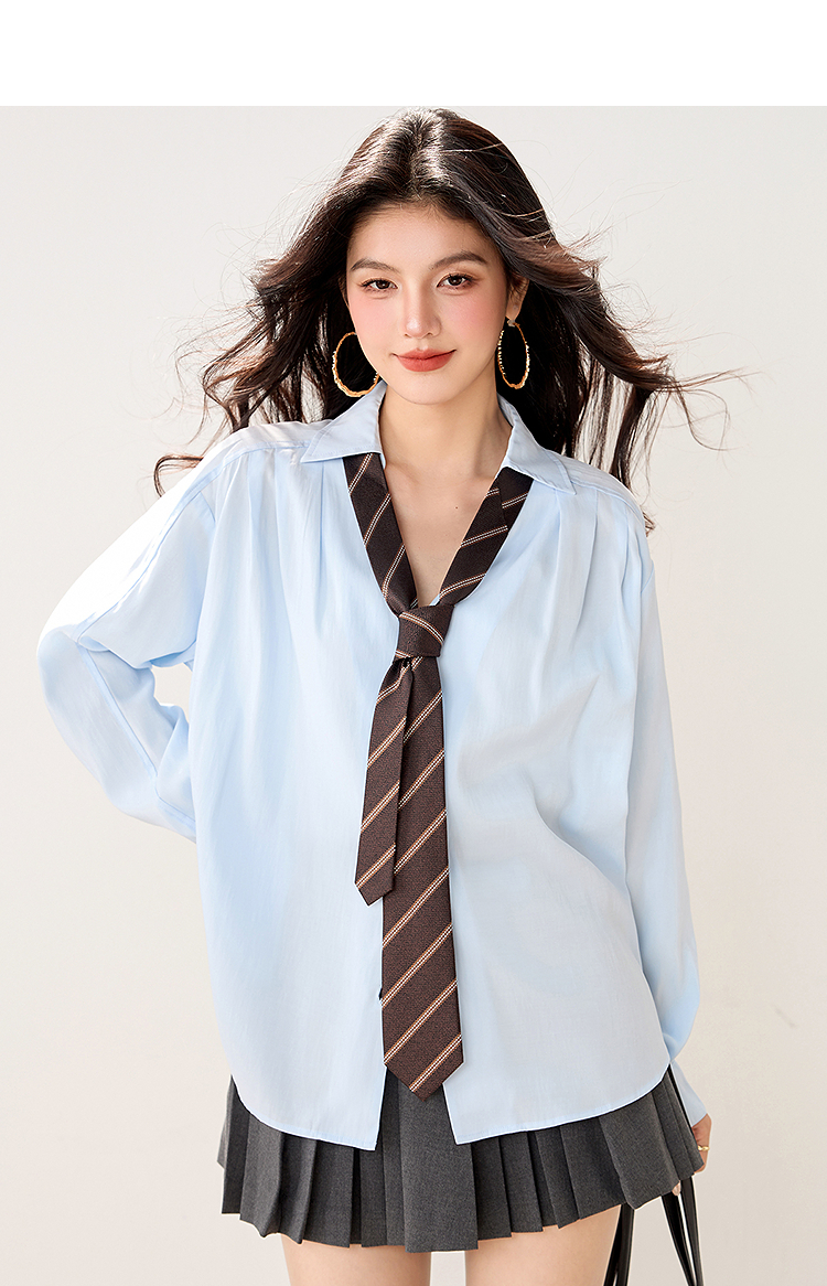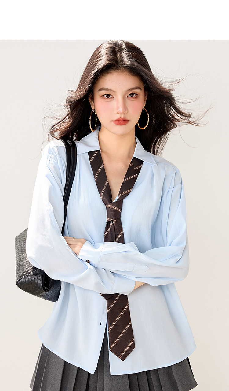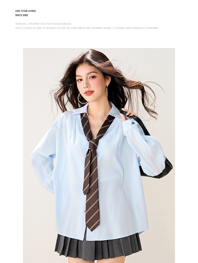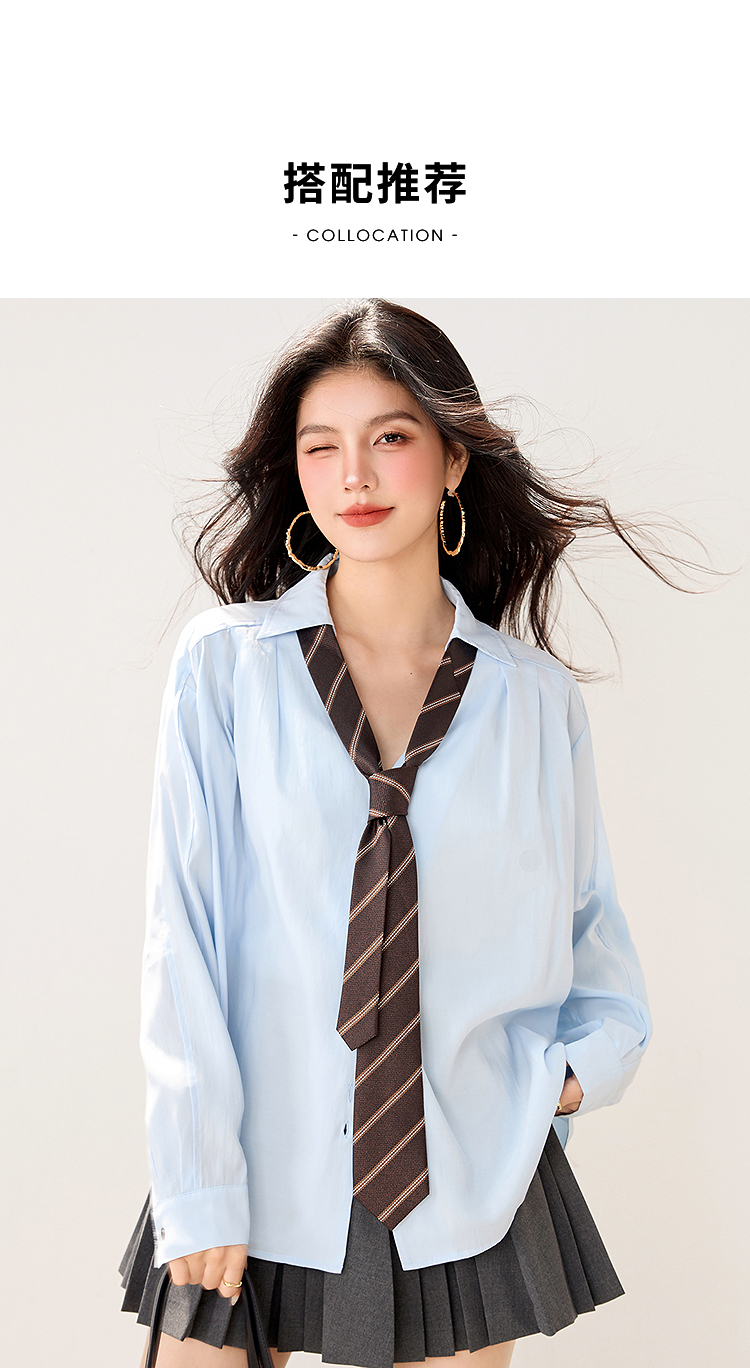 西遇POLO领配领带长袖衬衫女2026年春季新款宽松学院风蓝色衬衣SS060157