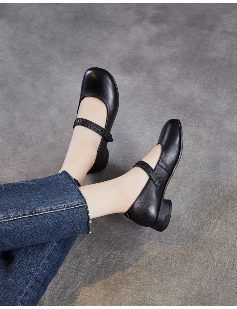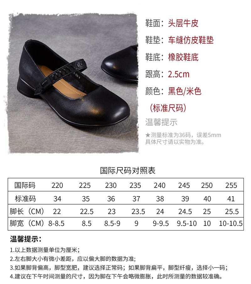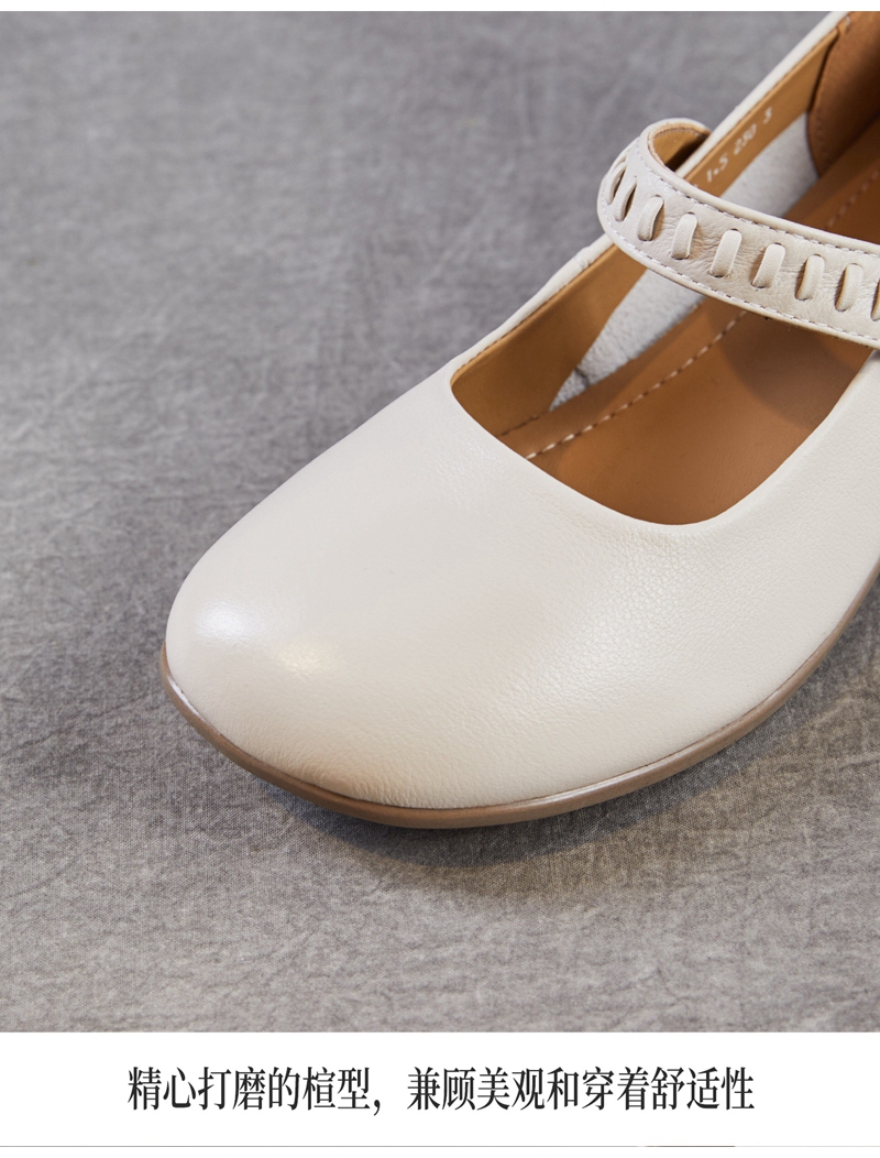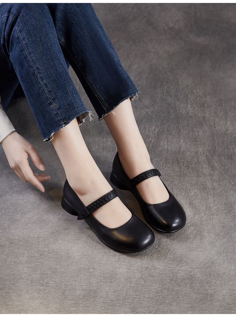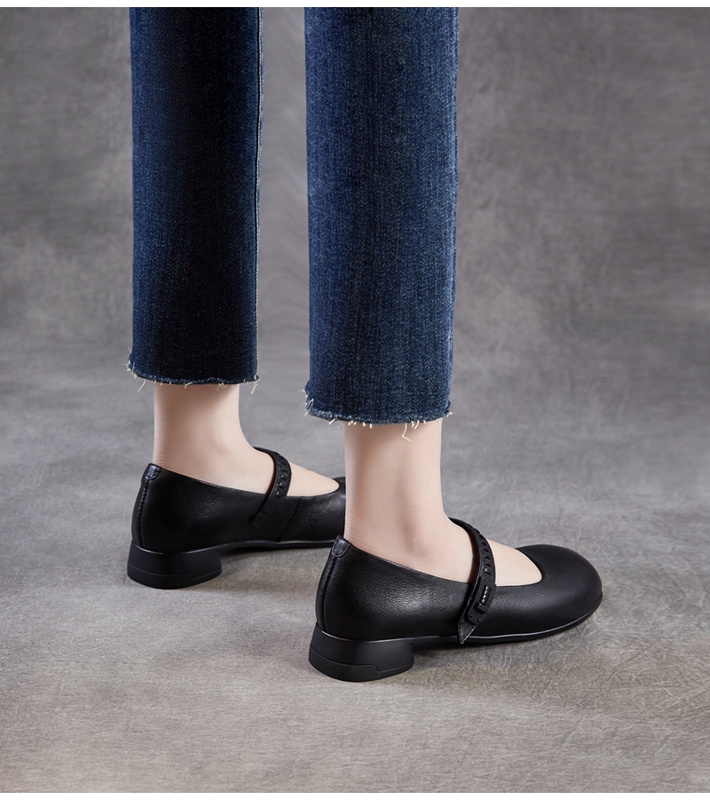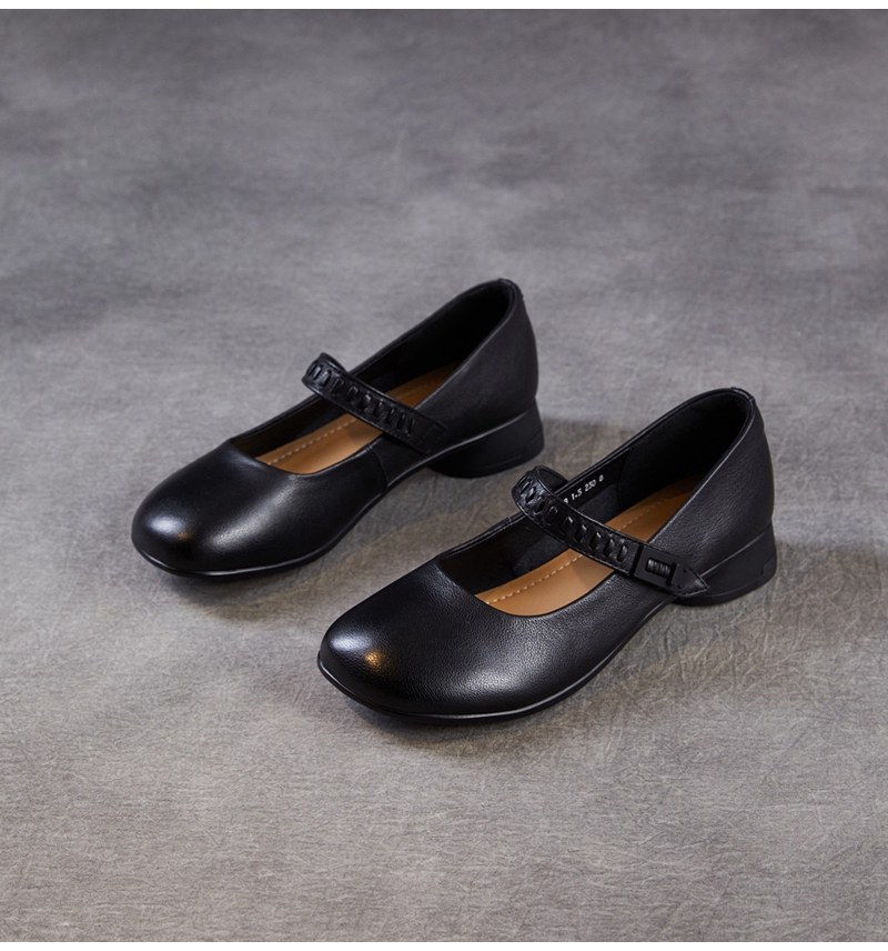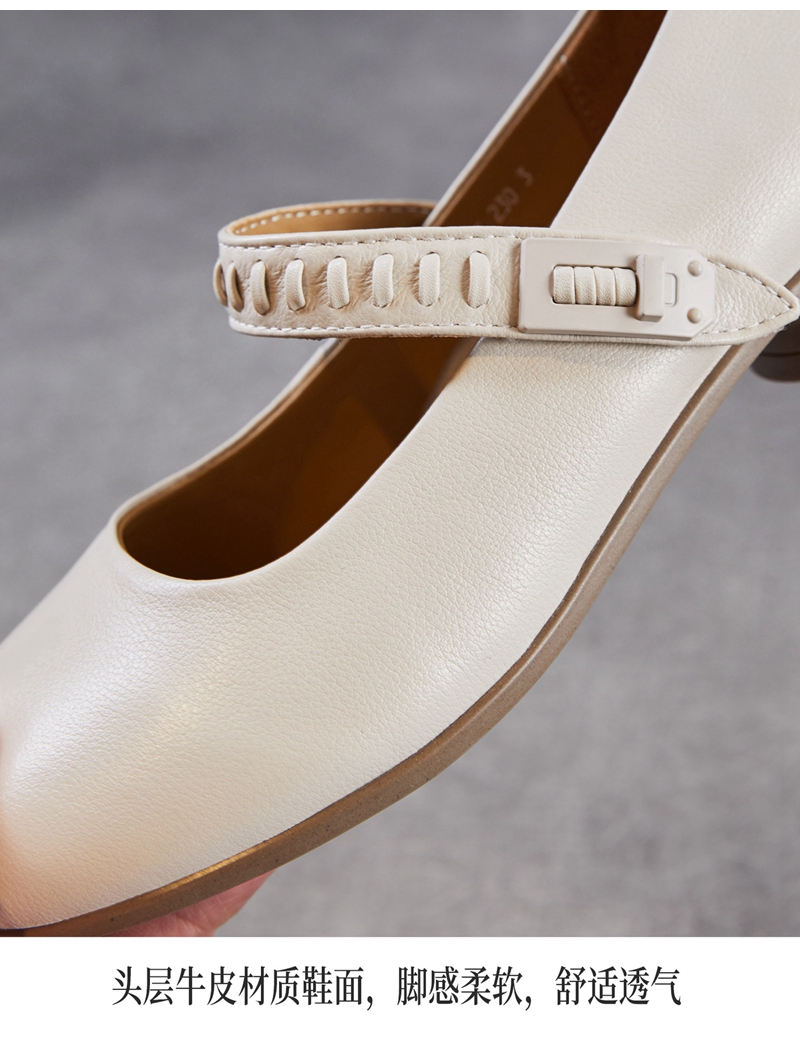 头层牛皮圆头浅口一字带粗跟中跟玛丽珍鞋