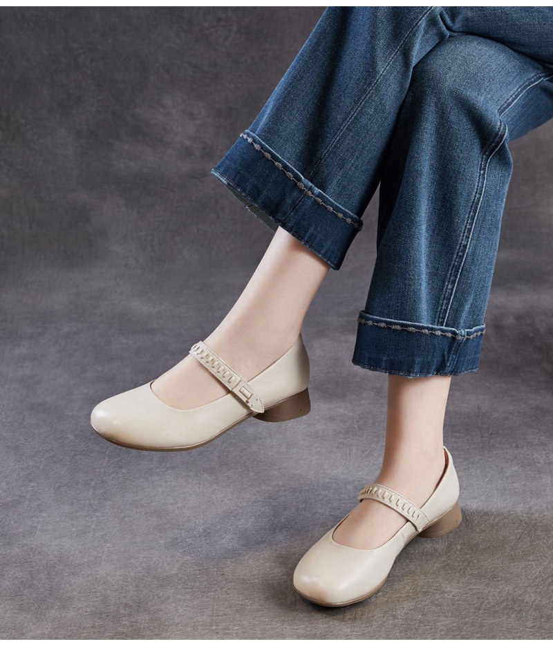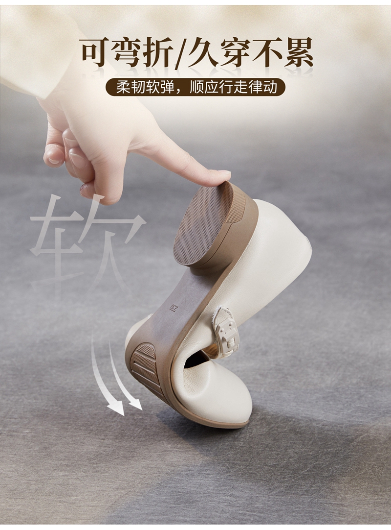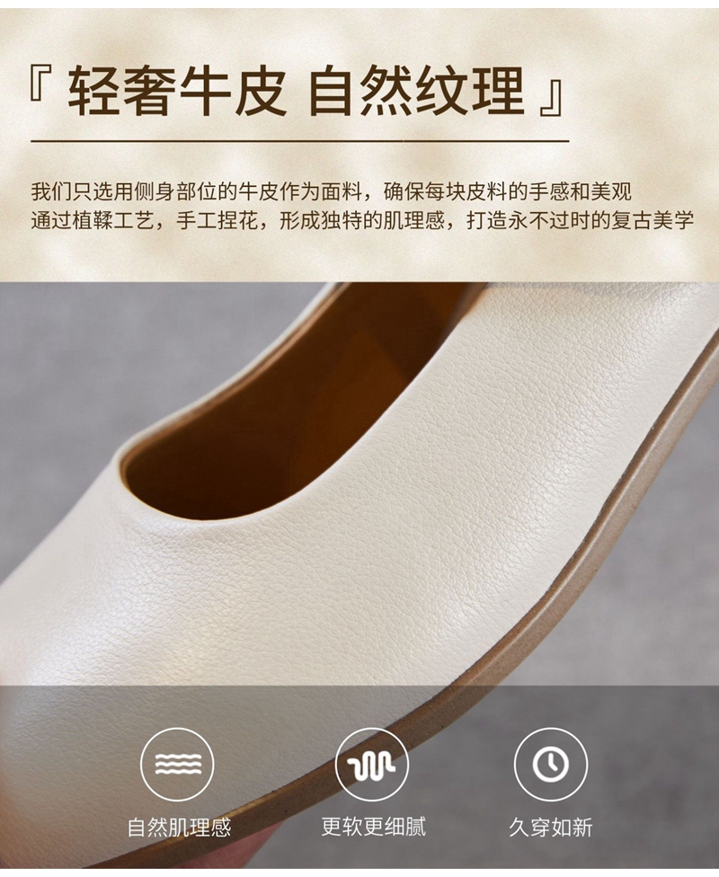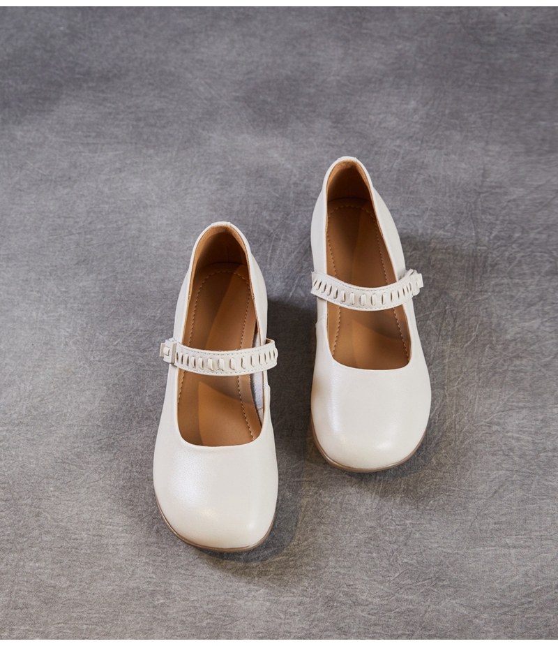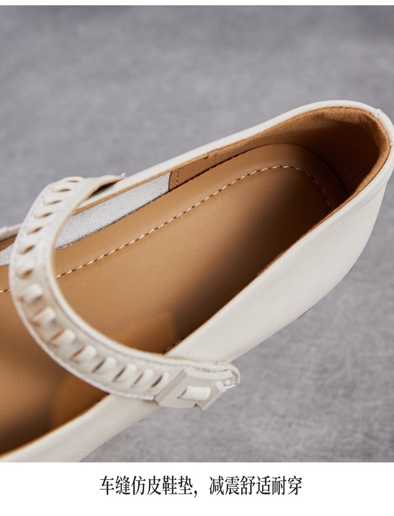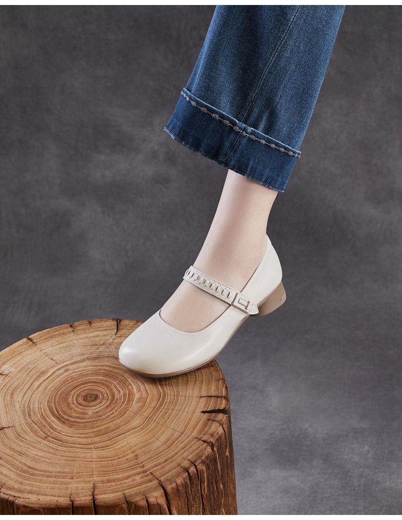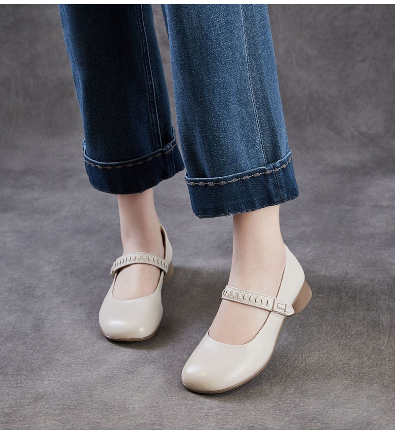头层牛皮圆头浅口一字带粗跟中跟玛丽珍鞋