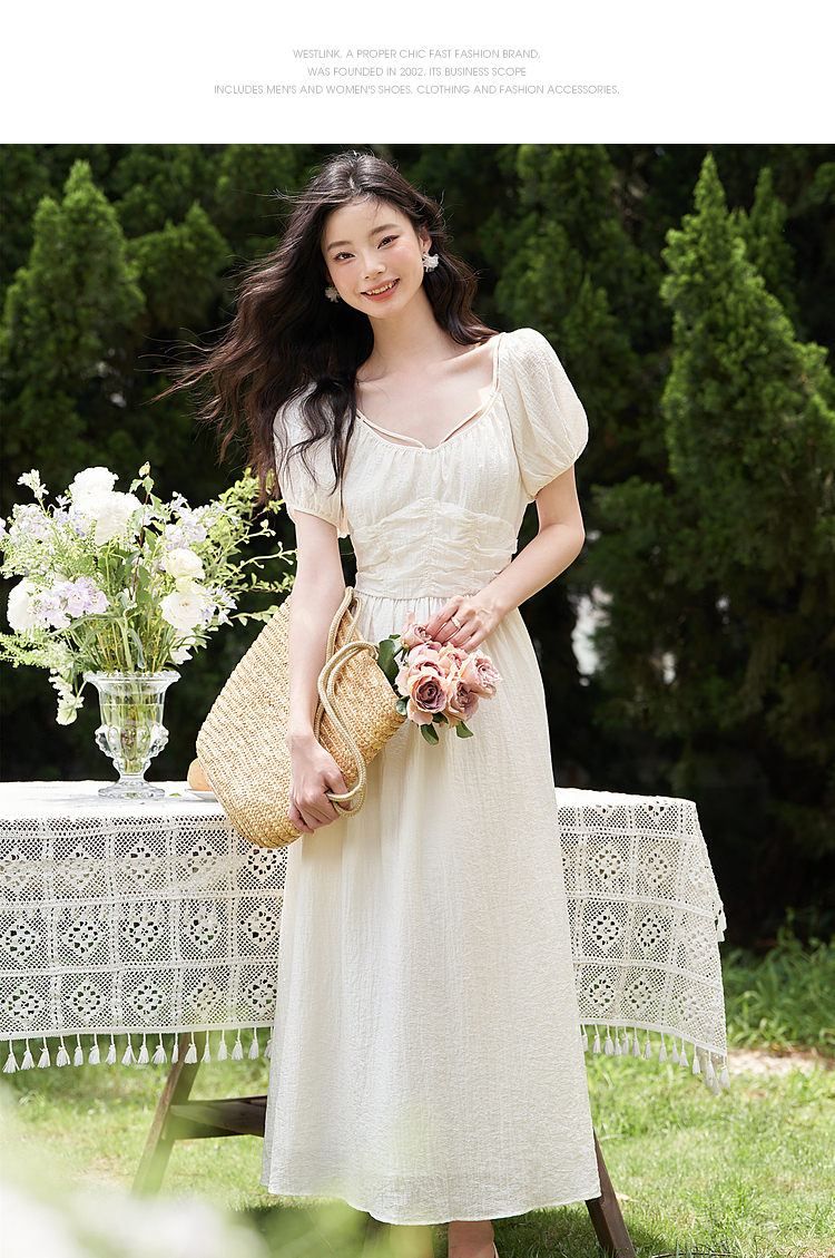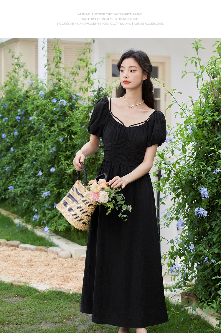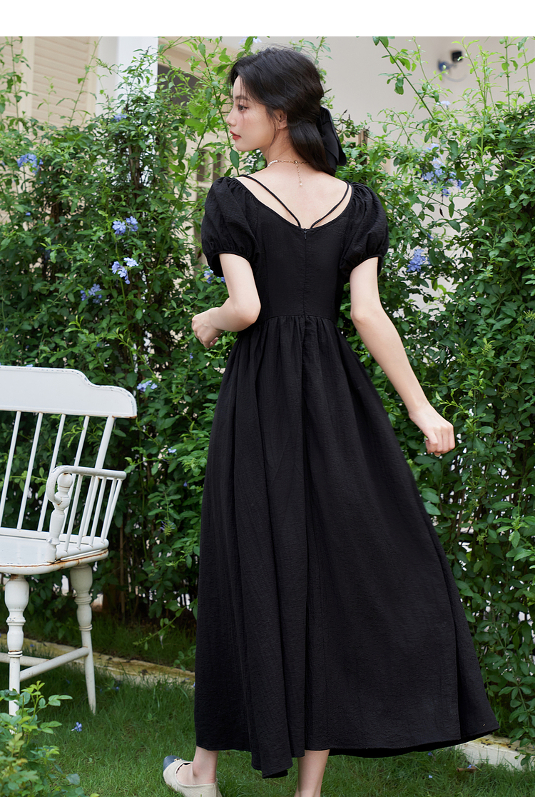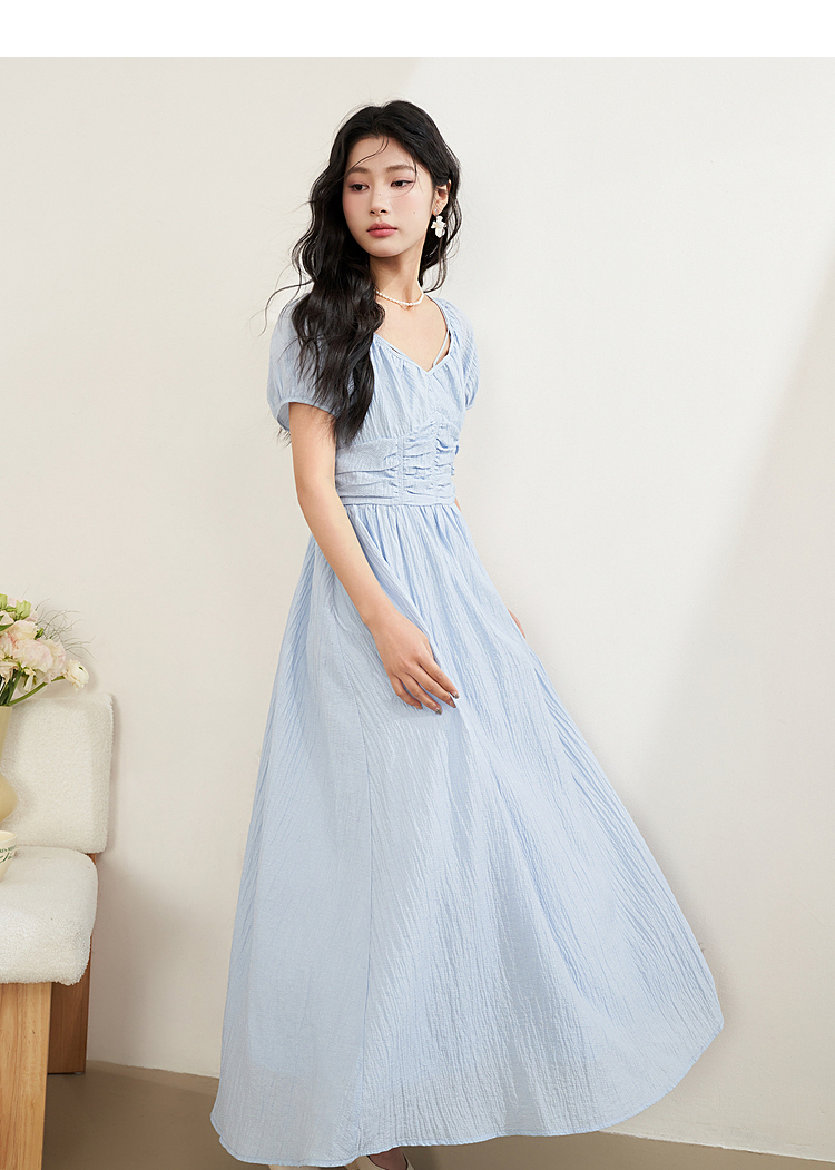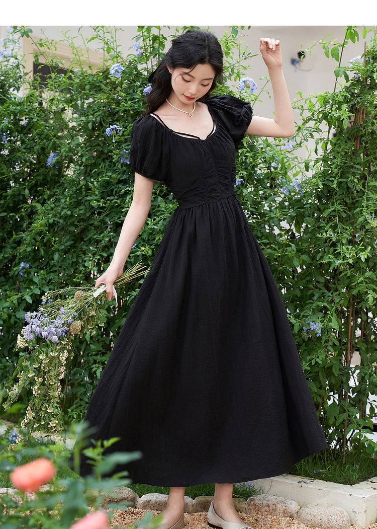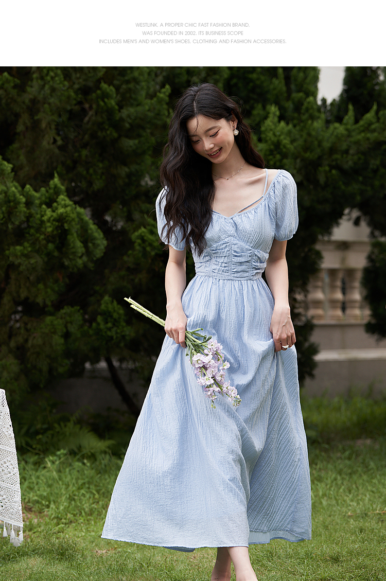 西遇V领泡泡袖茶歇连衣裙女新款褶皱高腰显瘦A摆裙子D0640507