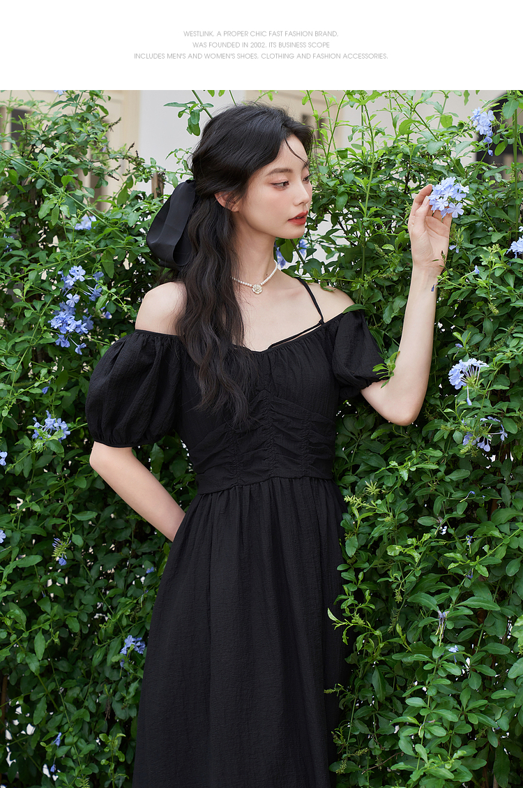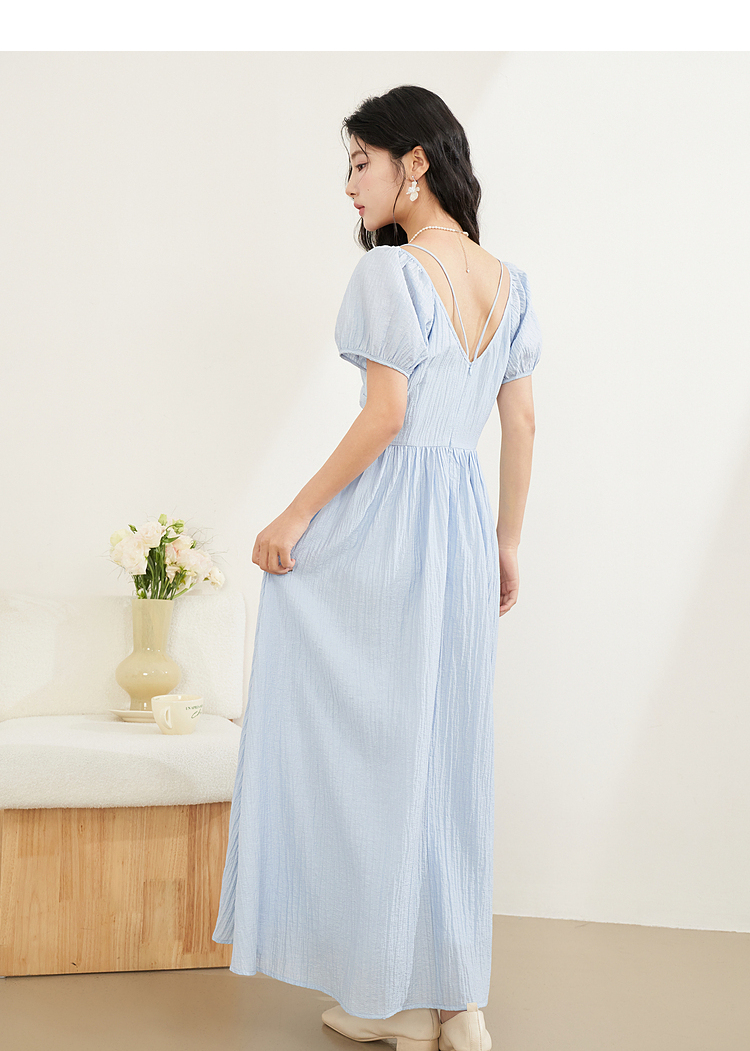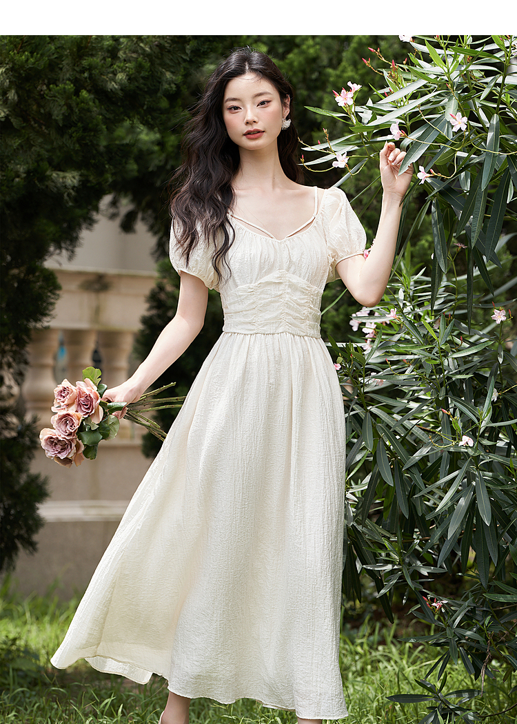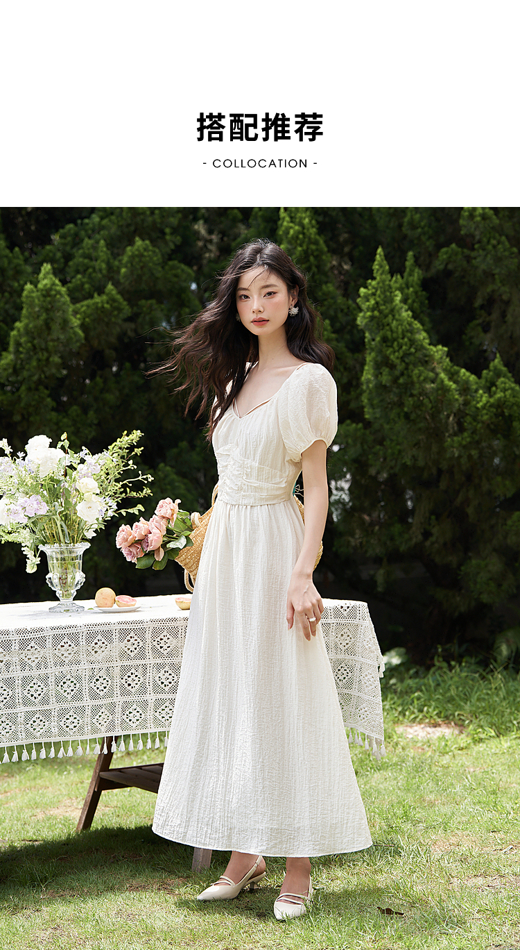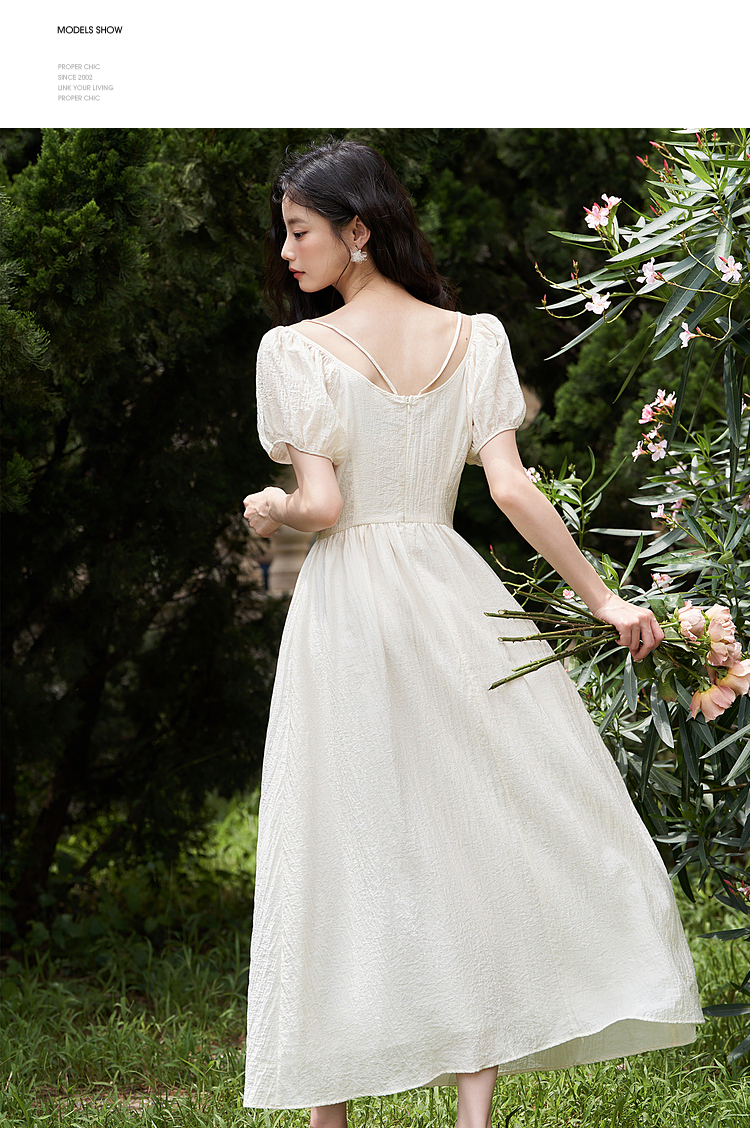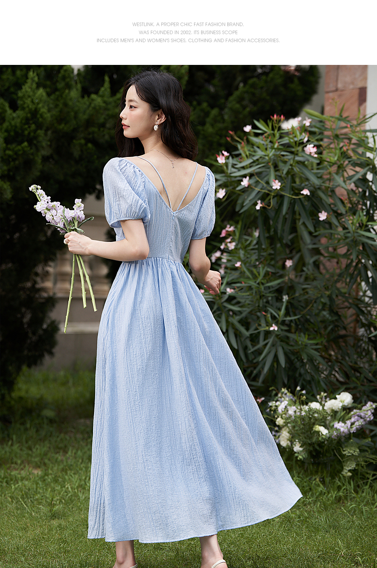 西遇V领泡泡袖茶歇连衣裙女新款褶皱高腰显瘦A摆裙子D0640507