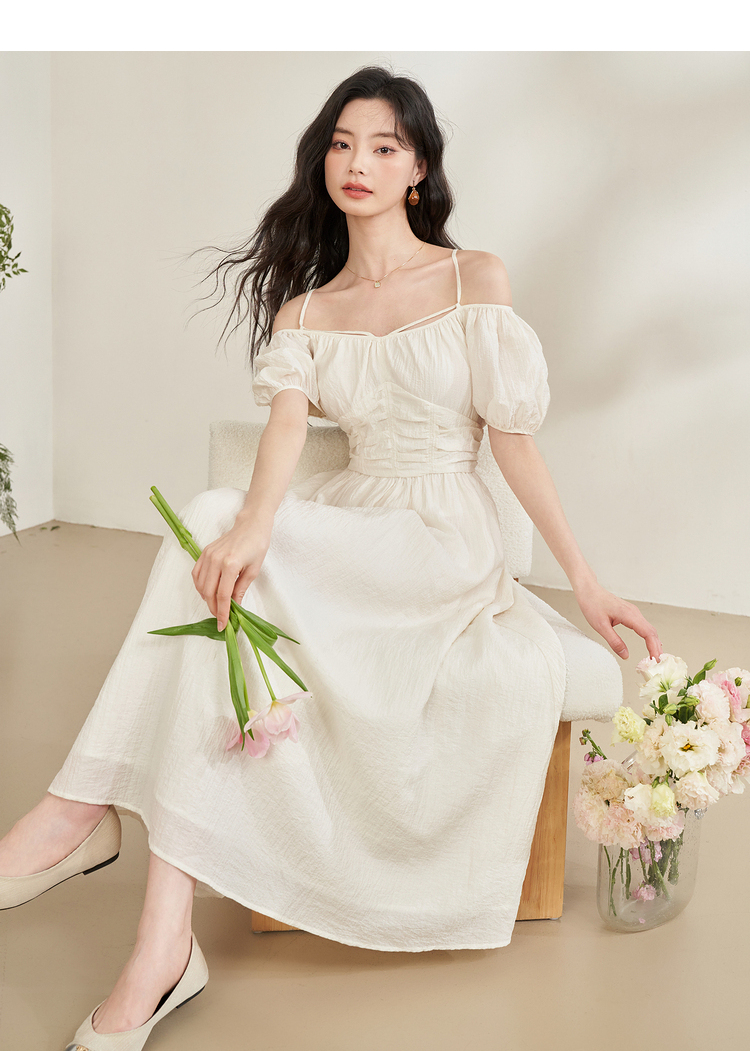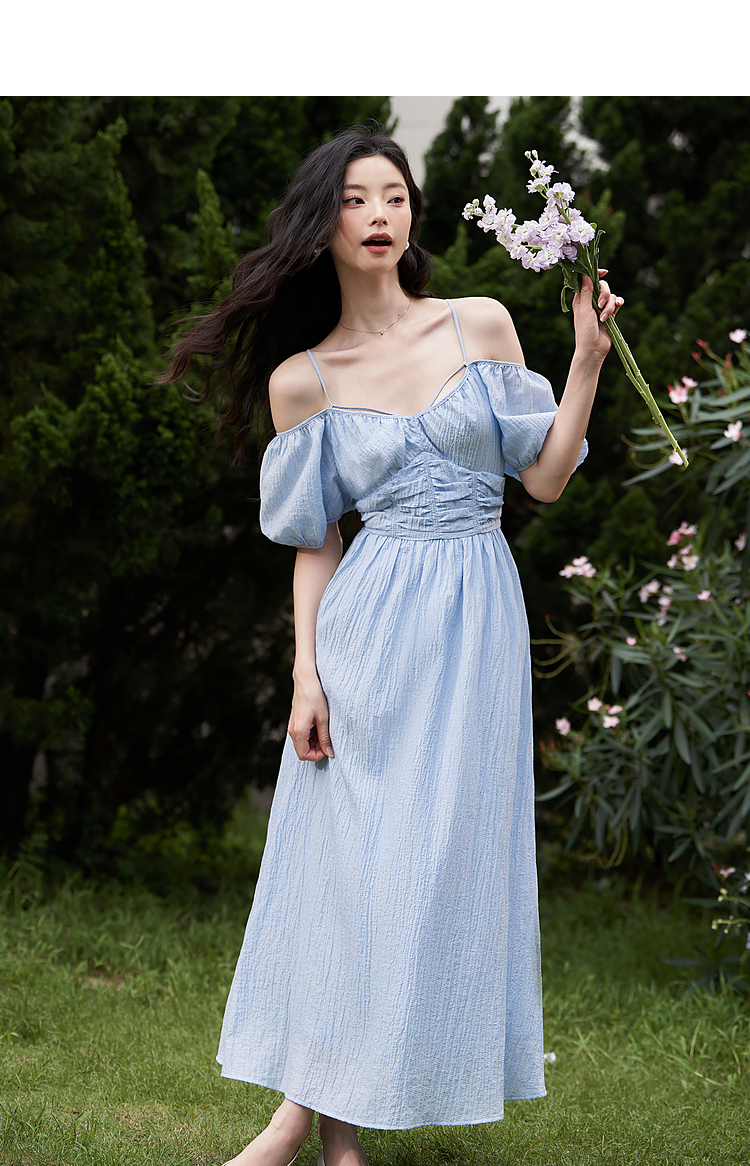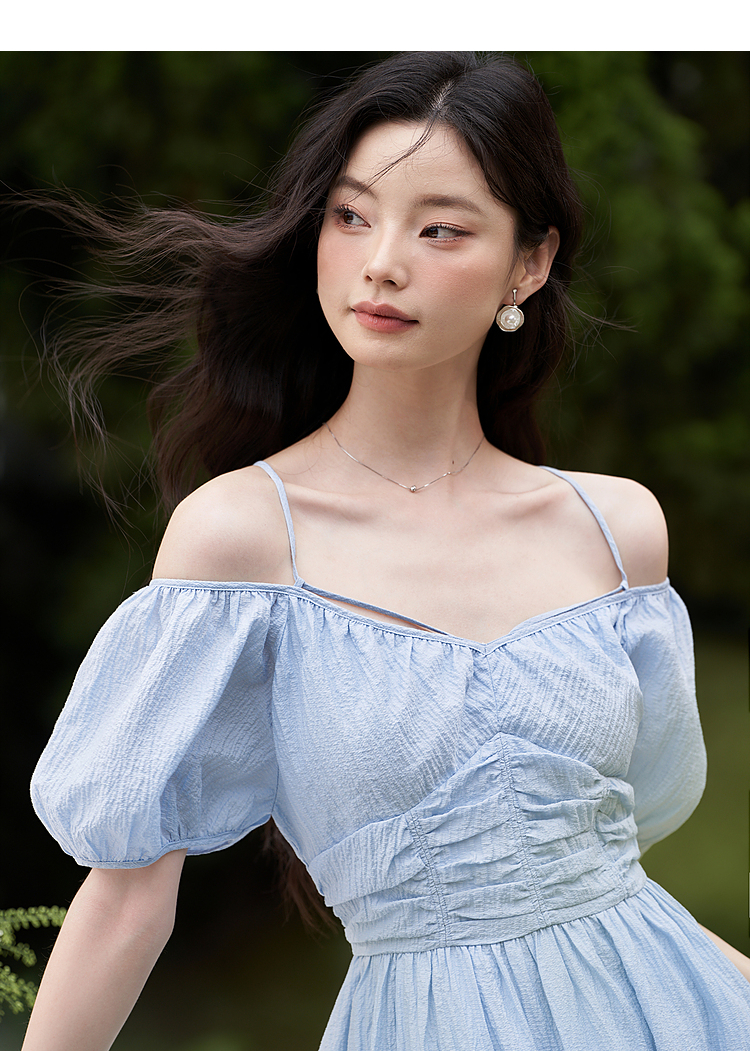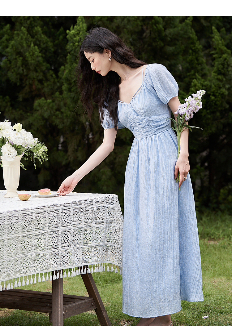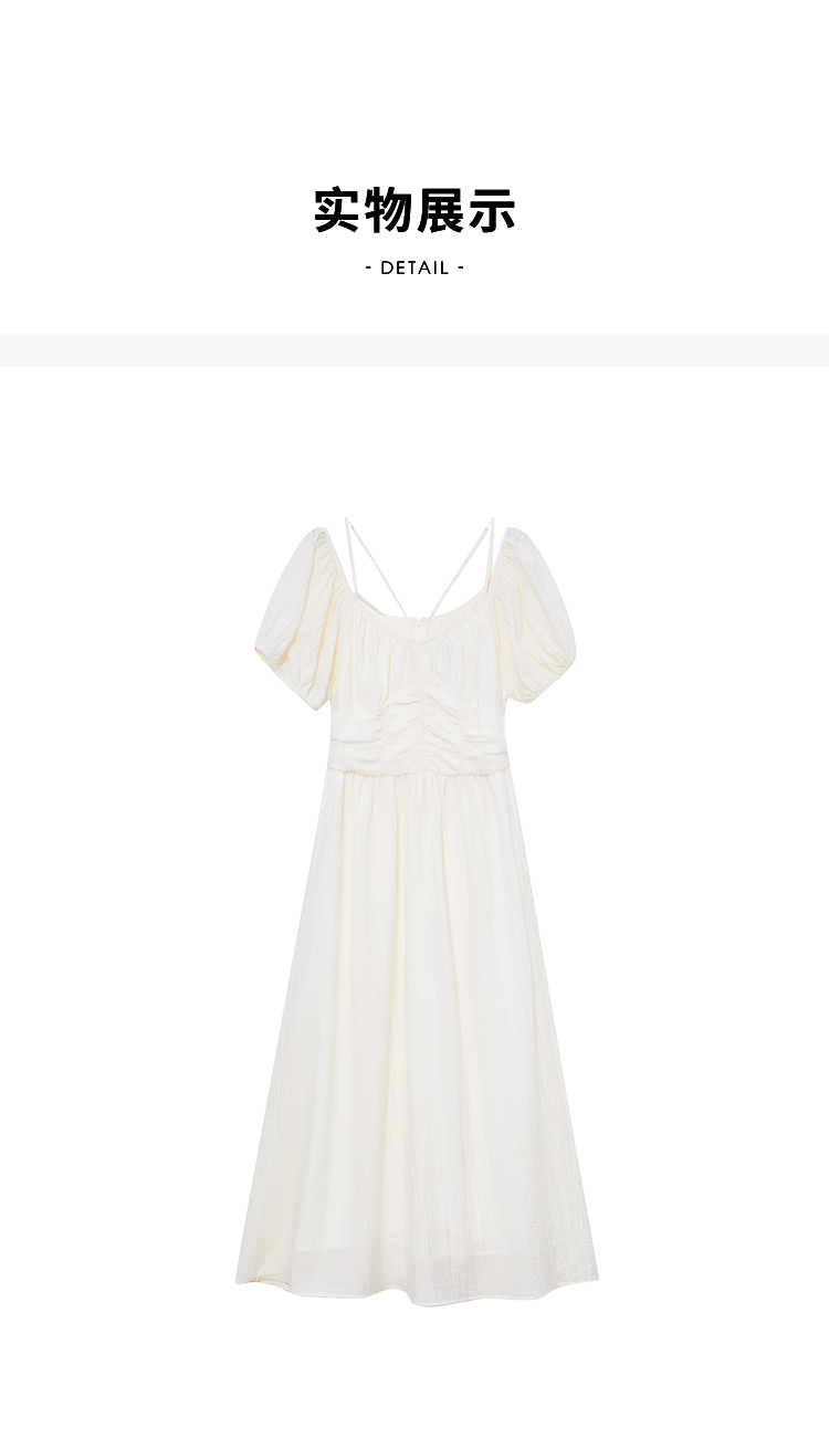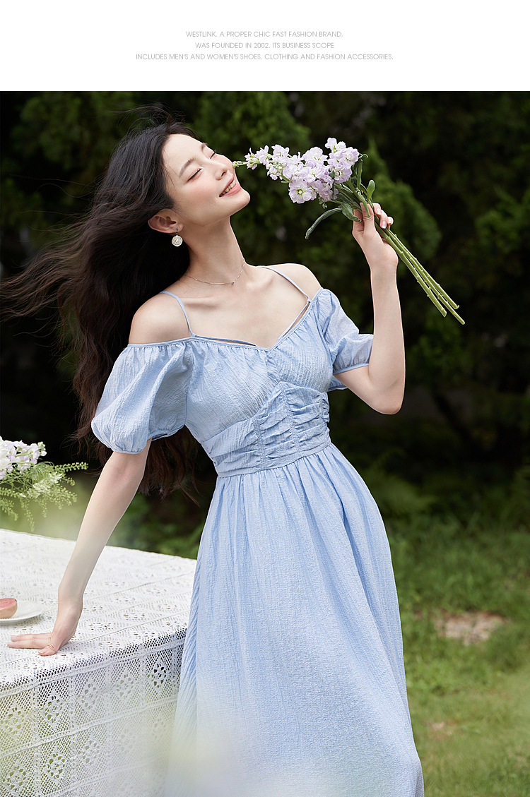 西遇V领泡泡袖茶歇连衣裙女新款褶皱高腰显瘦A摆裙子D0640507