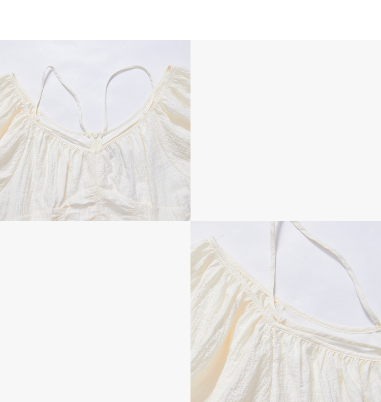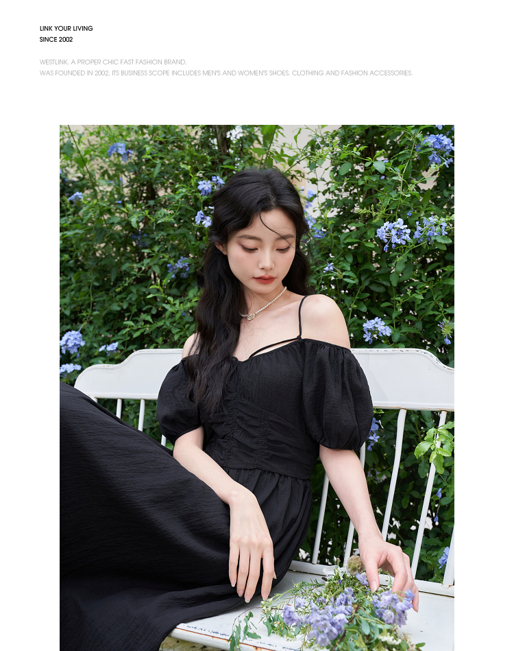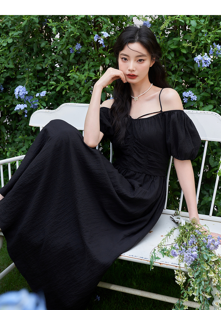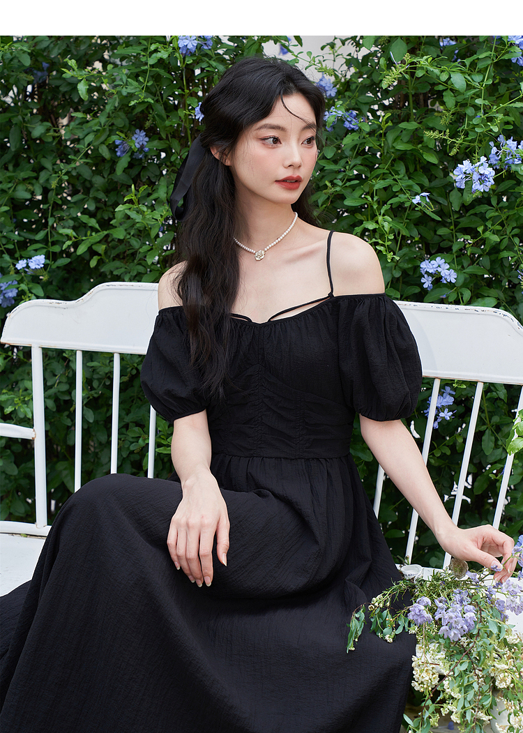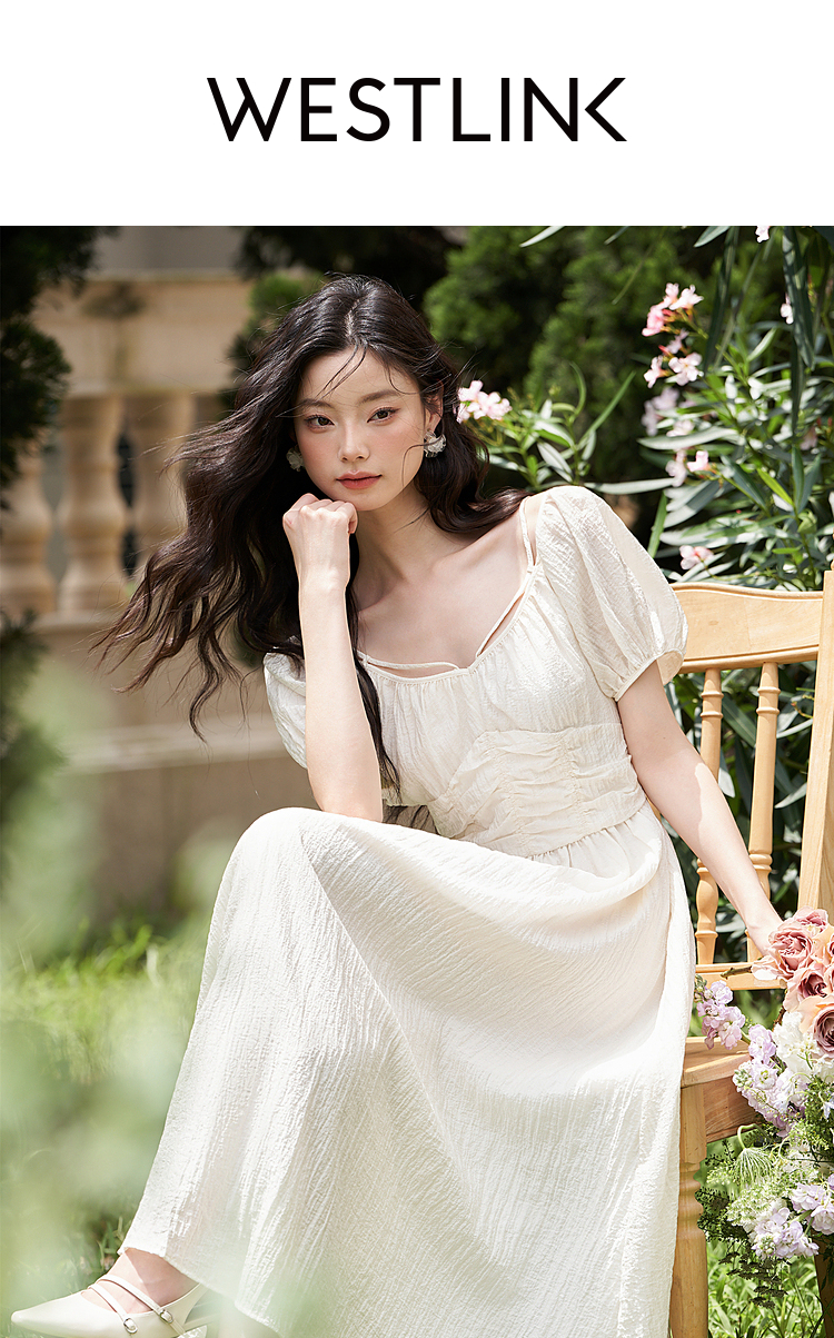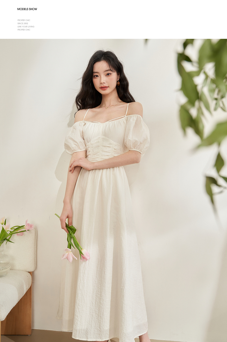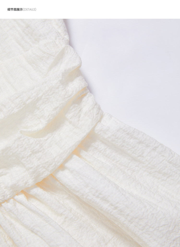 西遇V领泡泡袖茶歇连衣裙女新款褶皱高腰显瘦A摆裙子D0640507