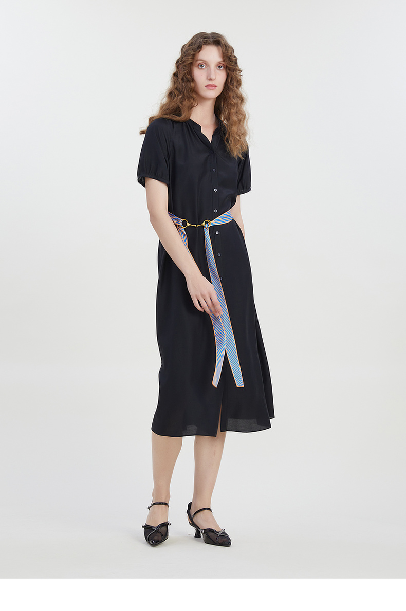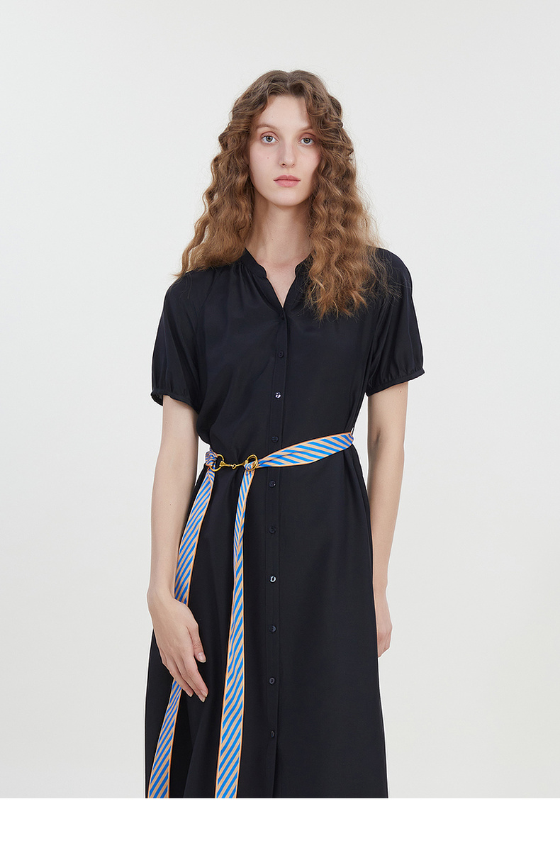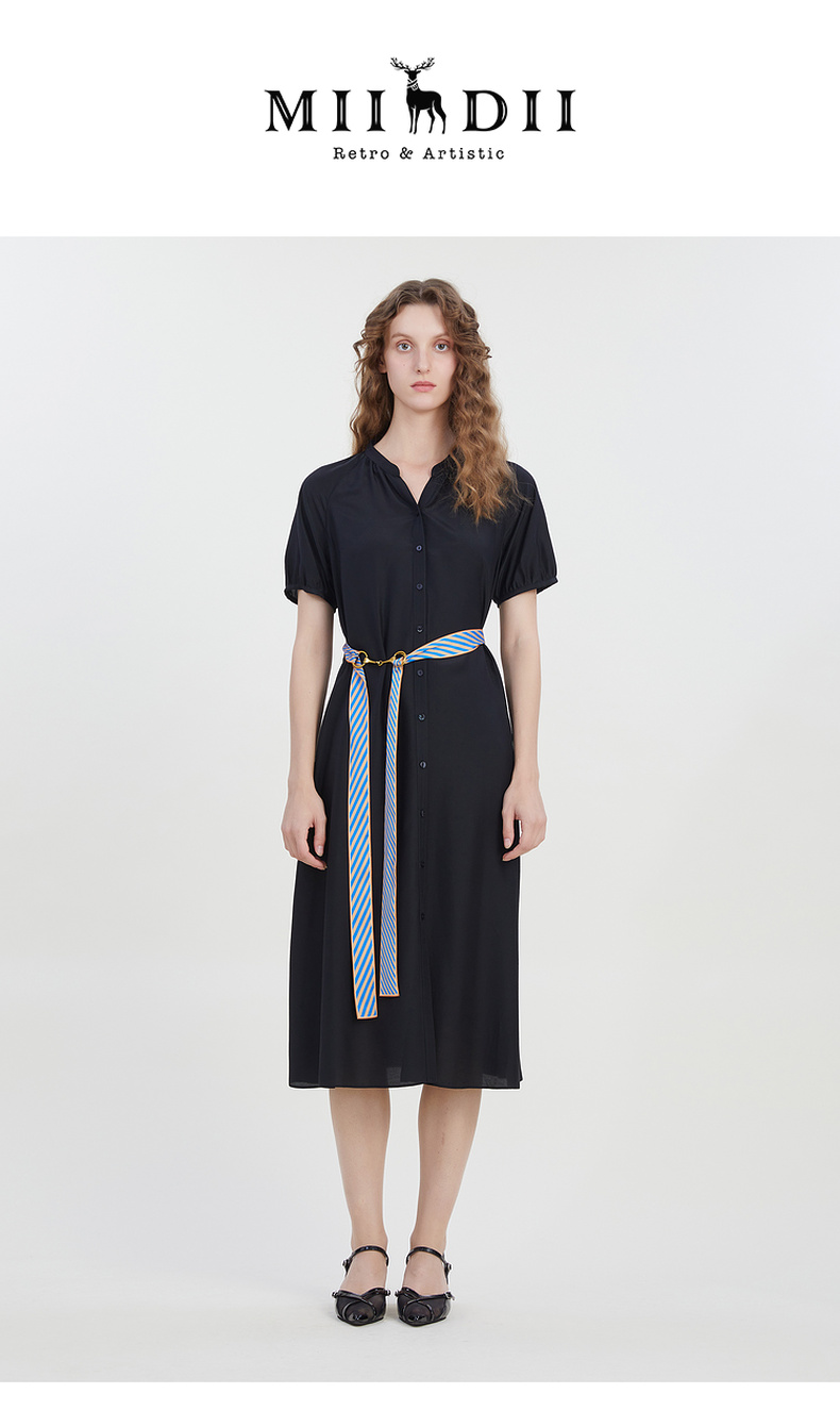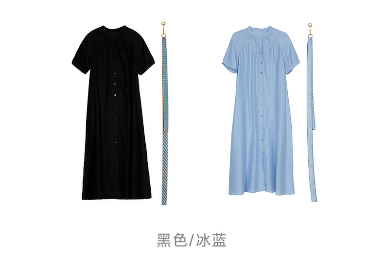 谜底时尚圆领A型连衣裙短袖2023夏新款通勤风长裙配腰带232ML0633