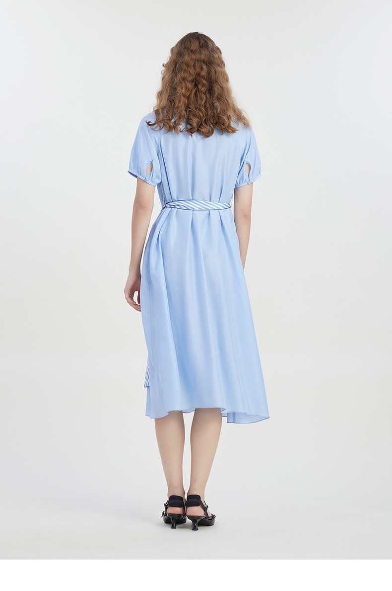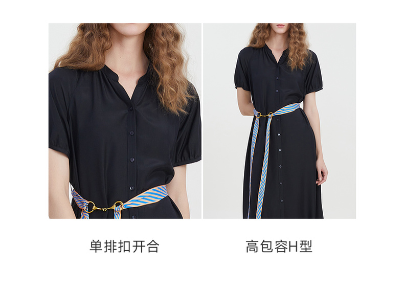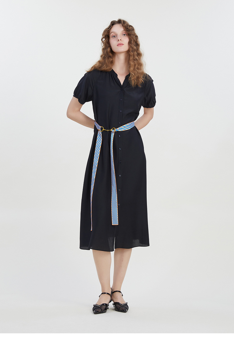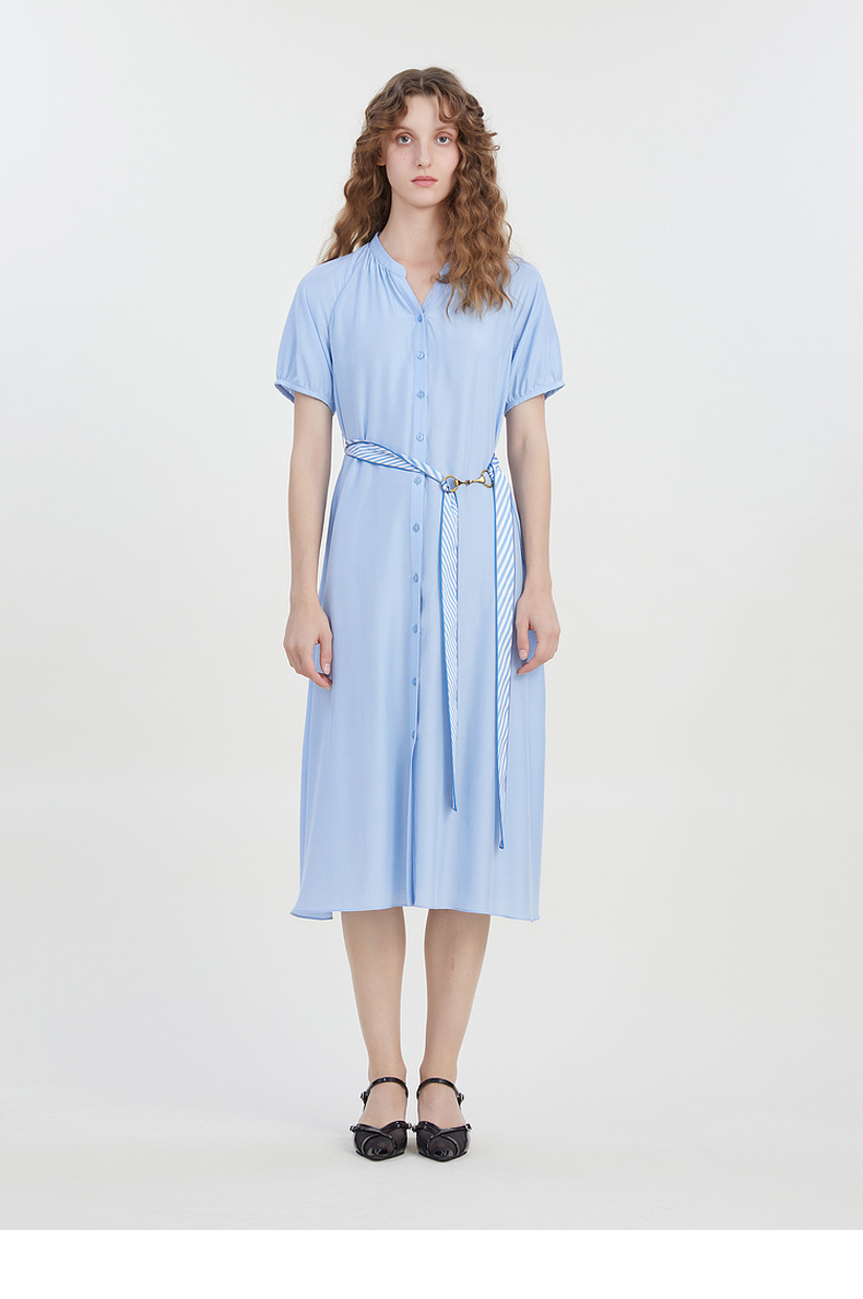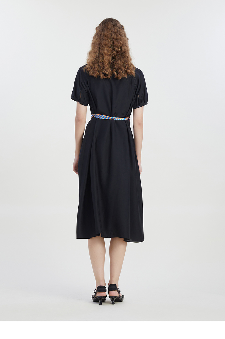 谜底时尚圆领A型连衣裙短袖2023夏新款通勤风长裙配腰带232ML0633