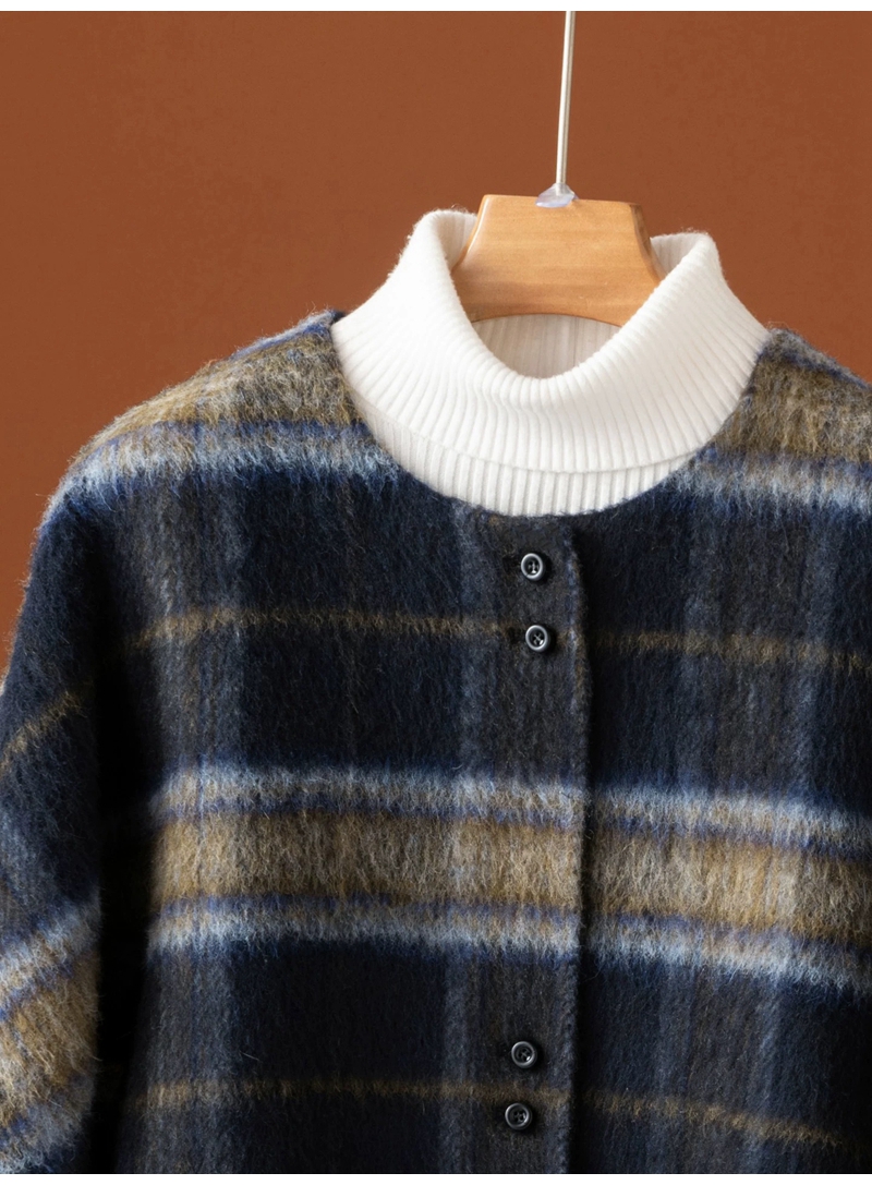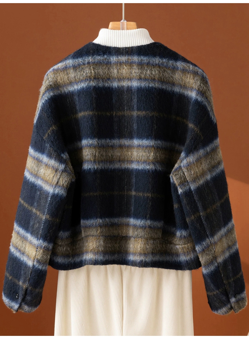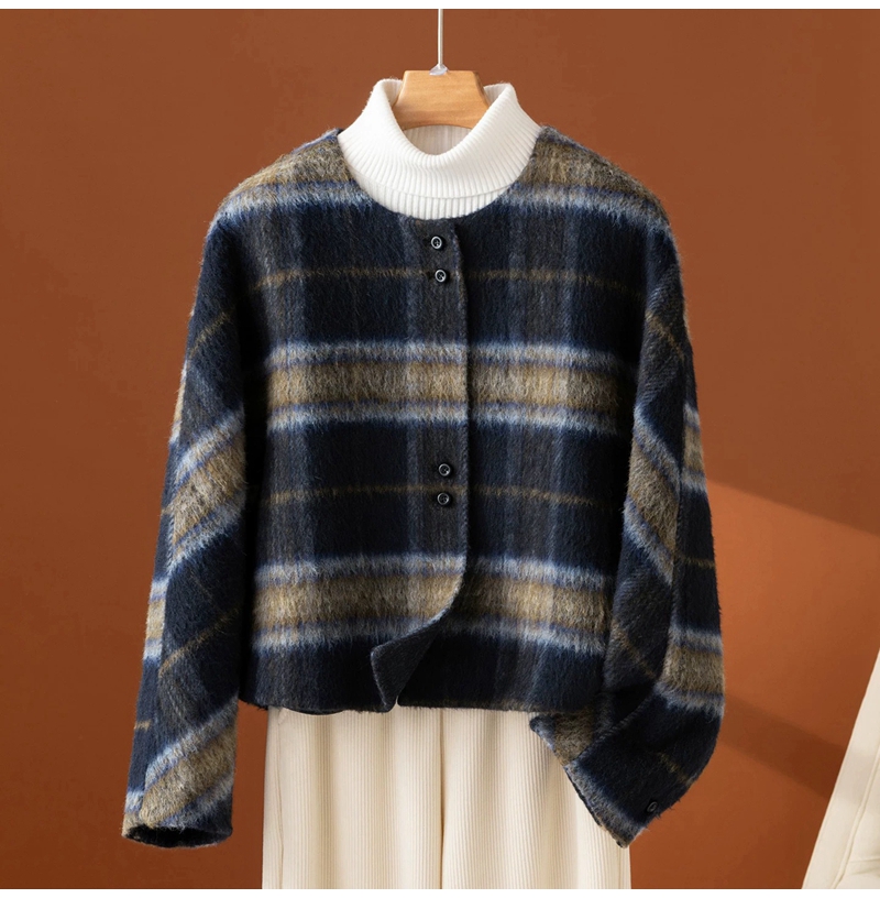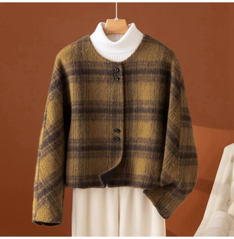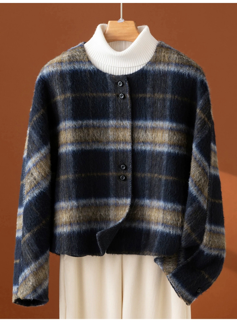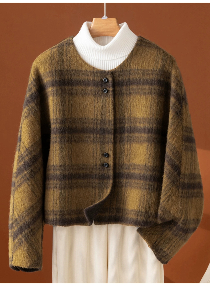 复古撞色圆领长袖单排扣格纹毛呢外套