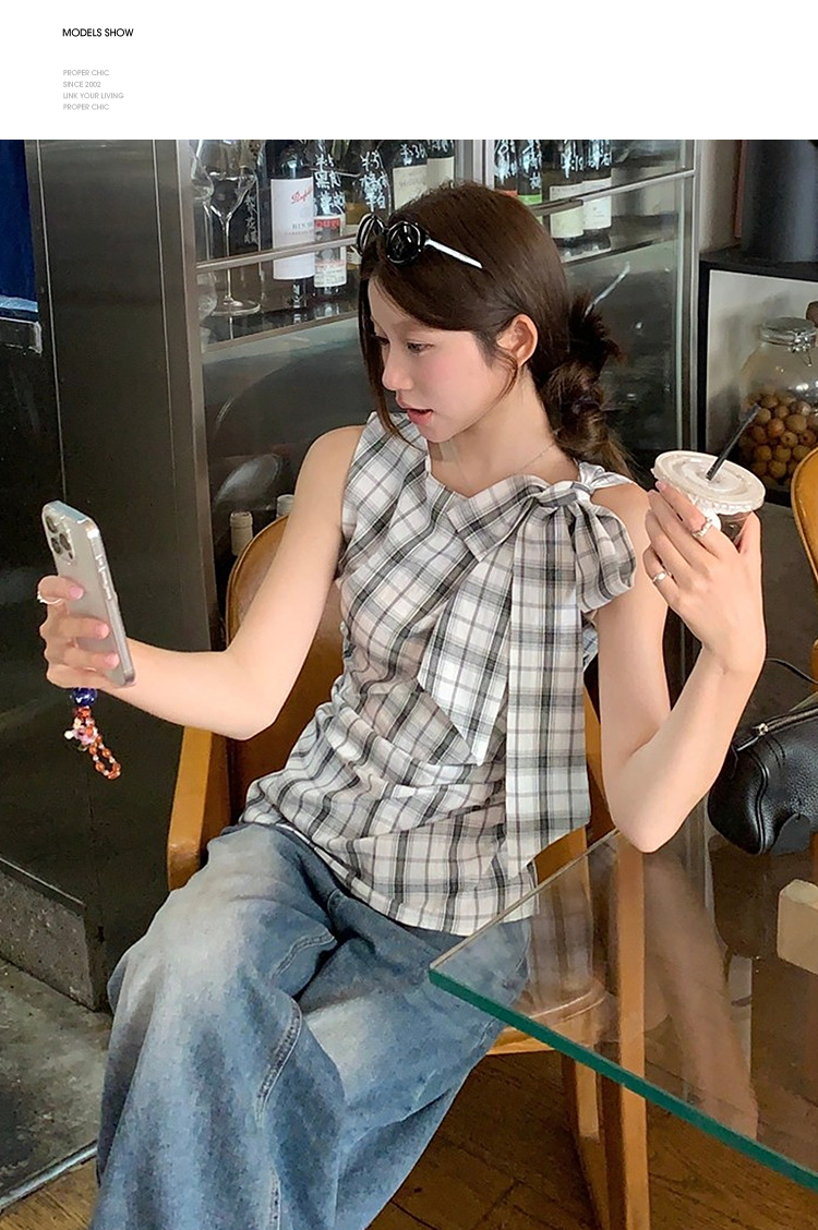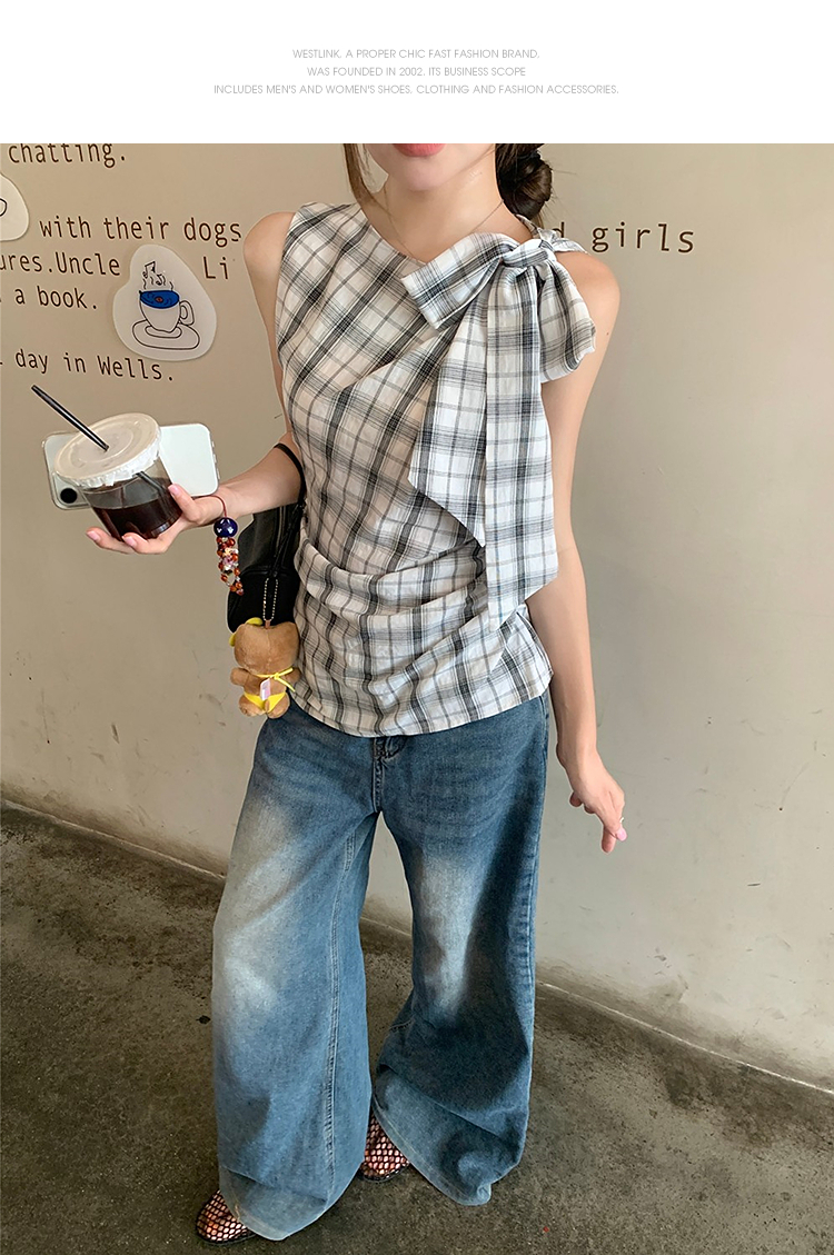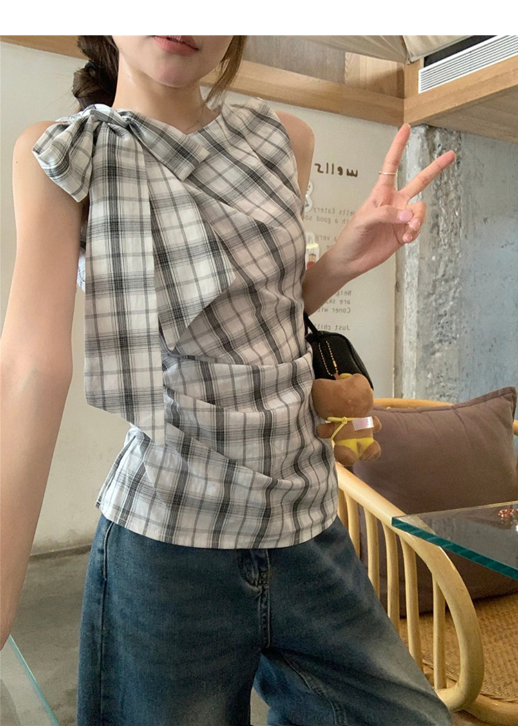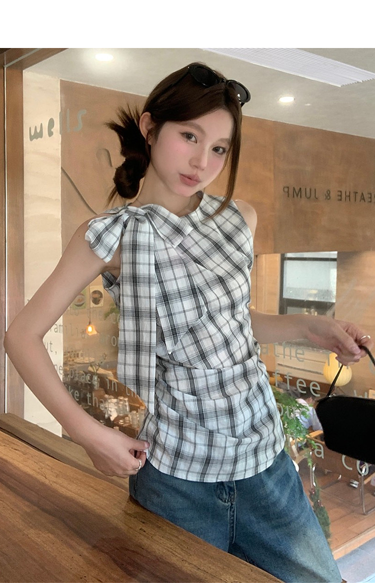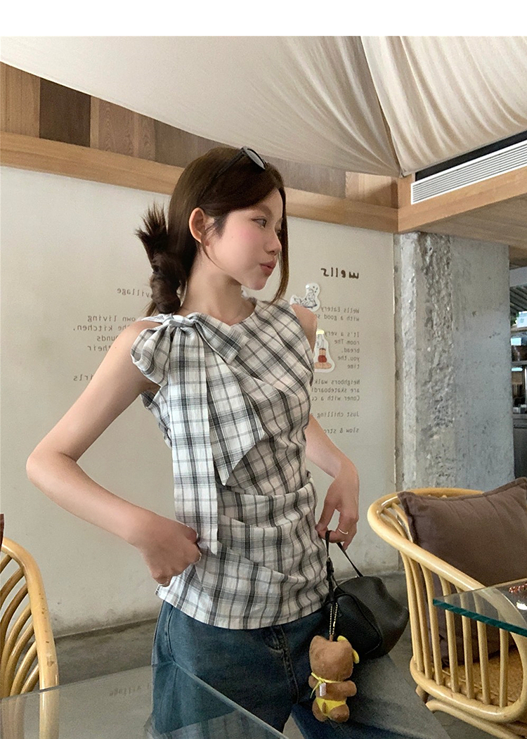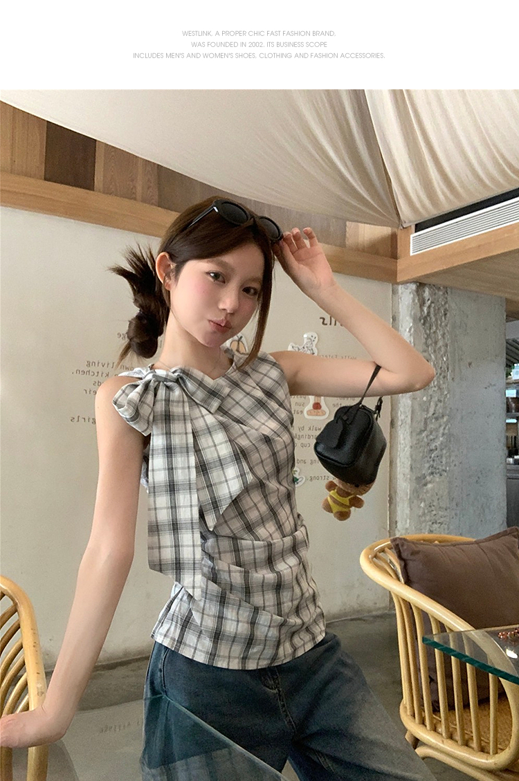 西遇格子无袖上衣女2025年夏季新款设计感蝴蝶结系带褶皱格纹背心SS050759