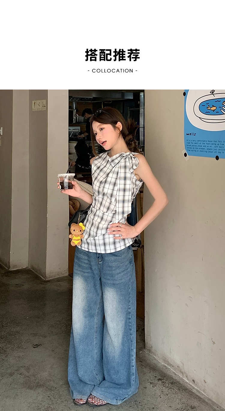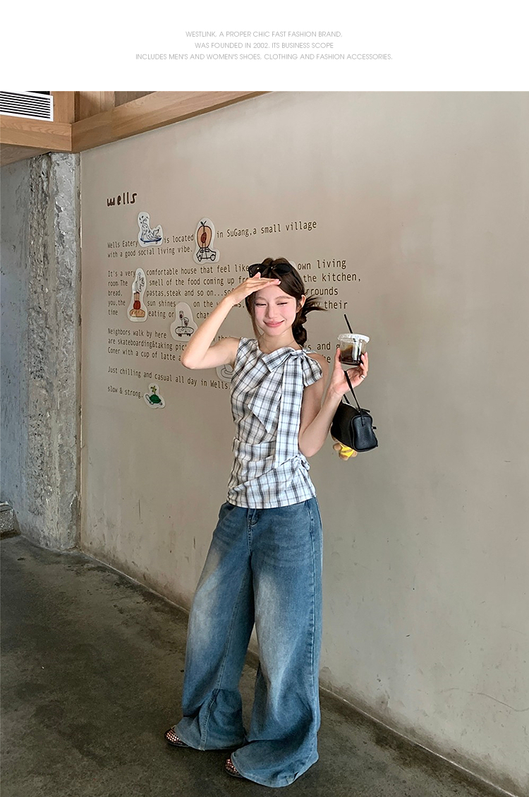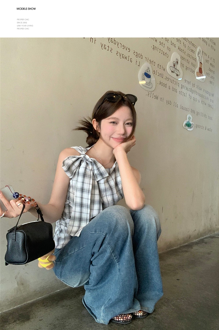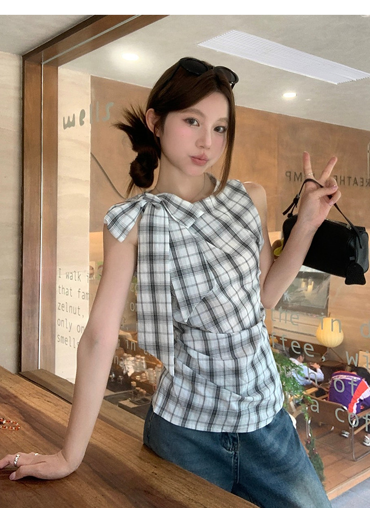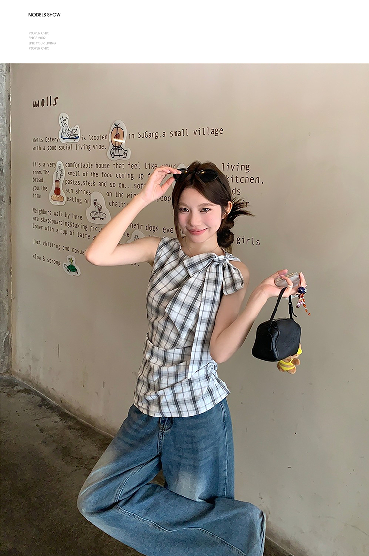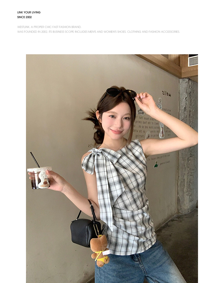 西遇格子无袖上衣女2025年夏季新款设计感蝴蝶结系带褶皱格纹背心SS050759