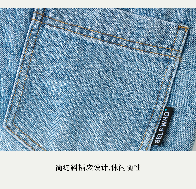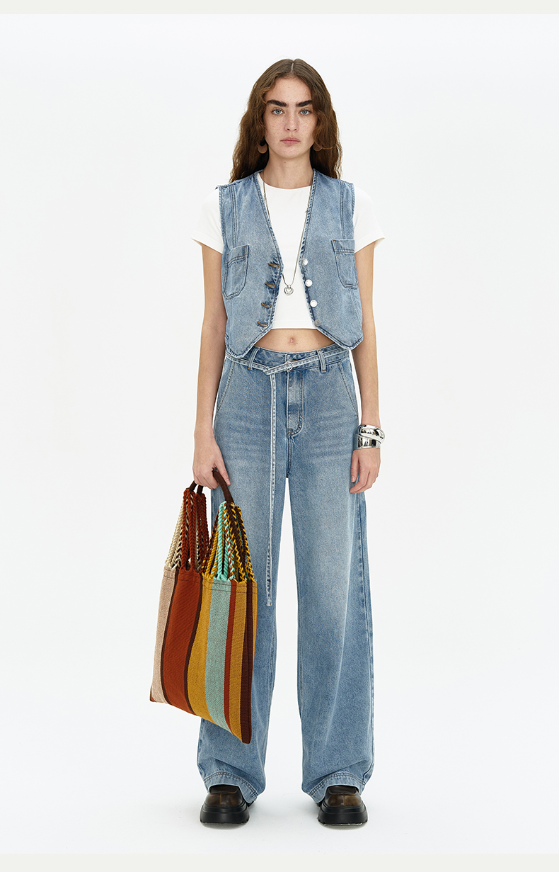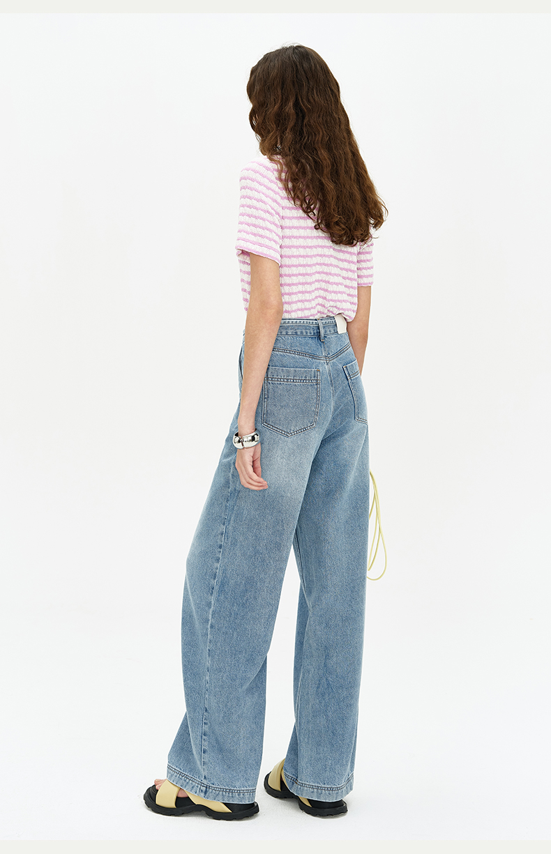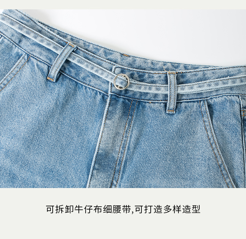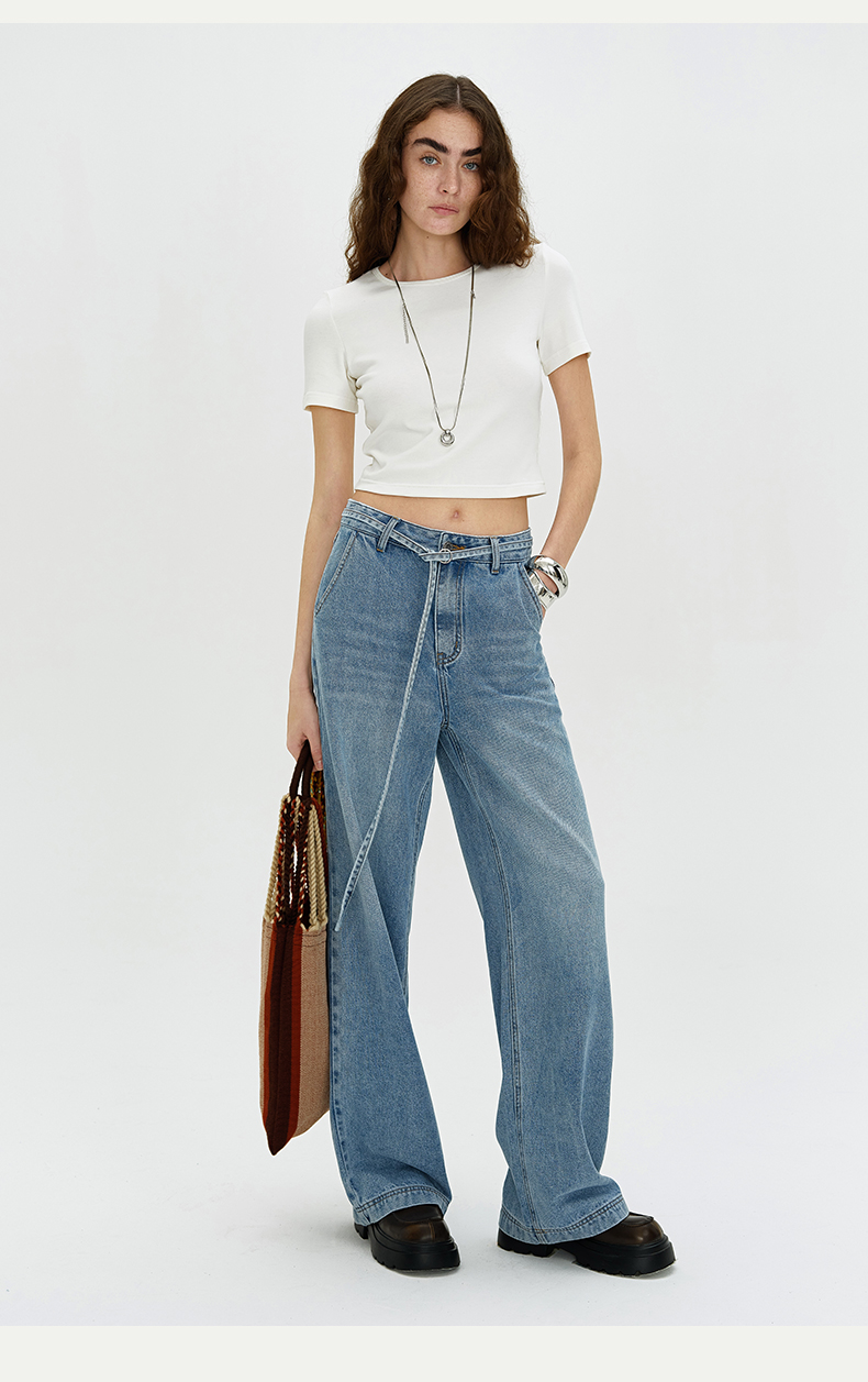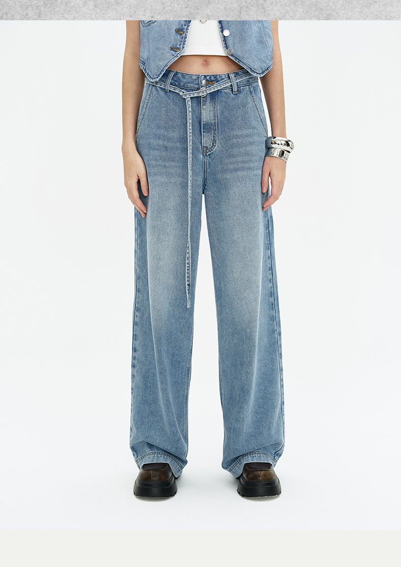 SELFWHO浅蓝色牛仔裤女夏2024新款复古洗水百搭显瘦腰带直筒长裤