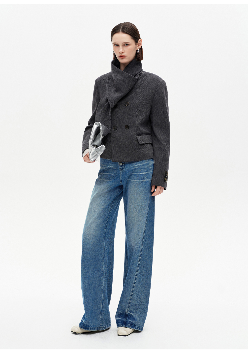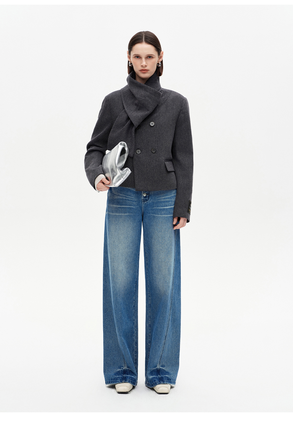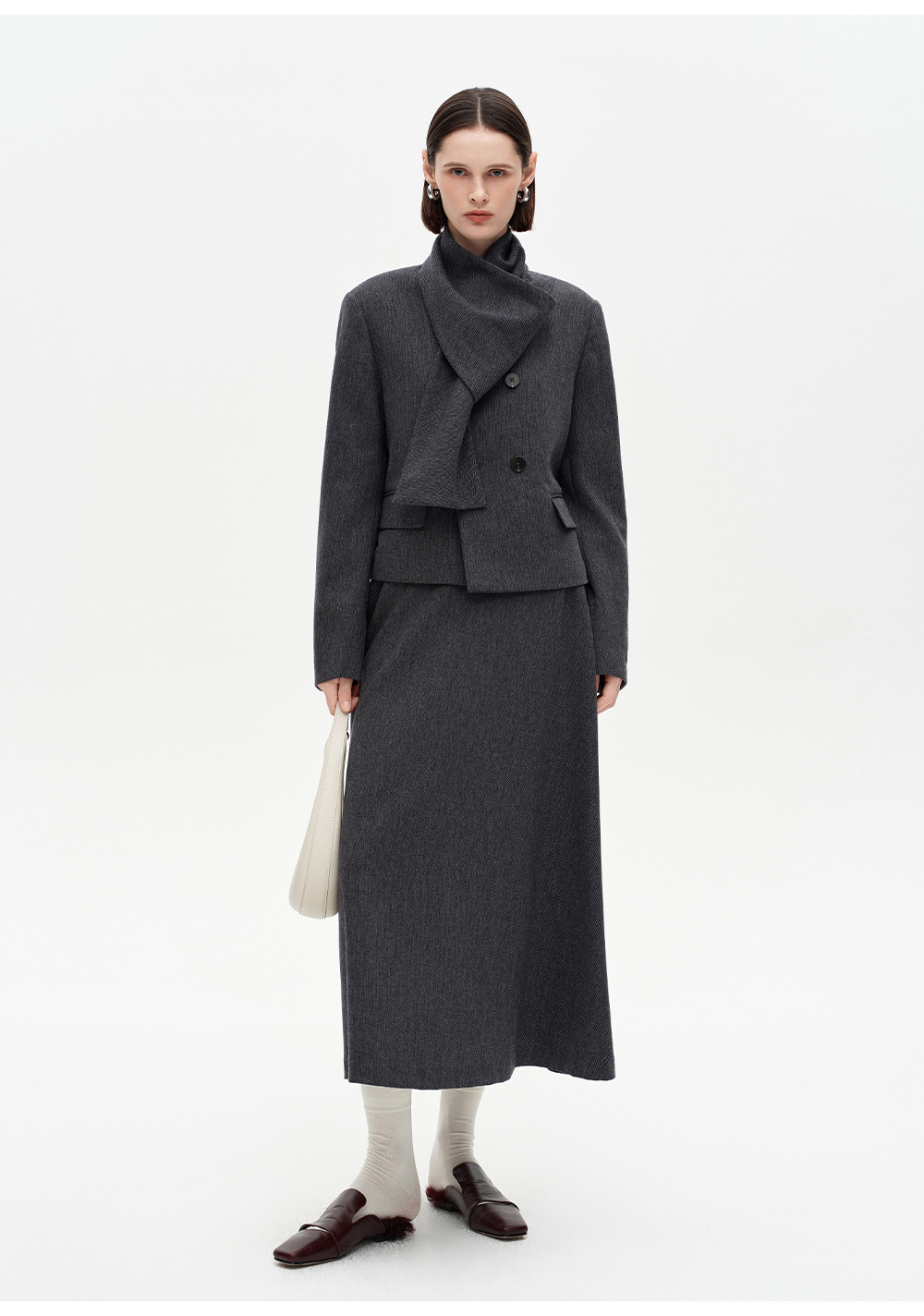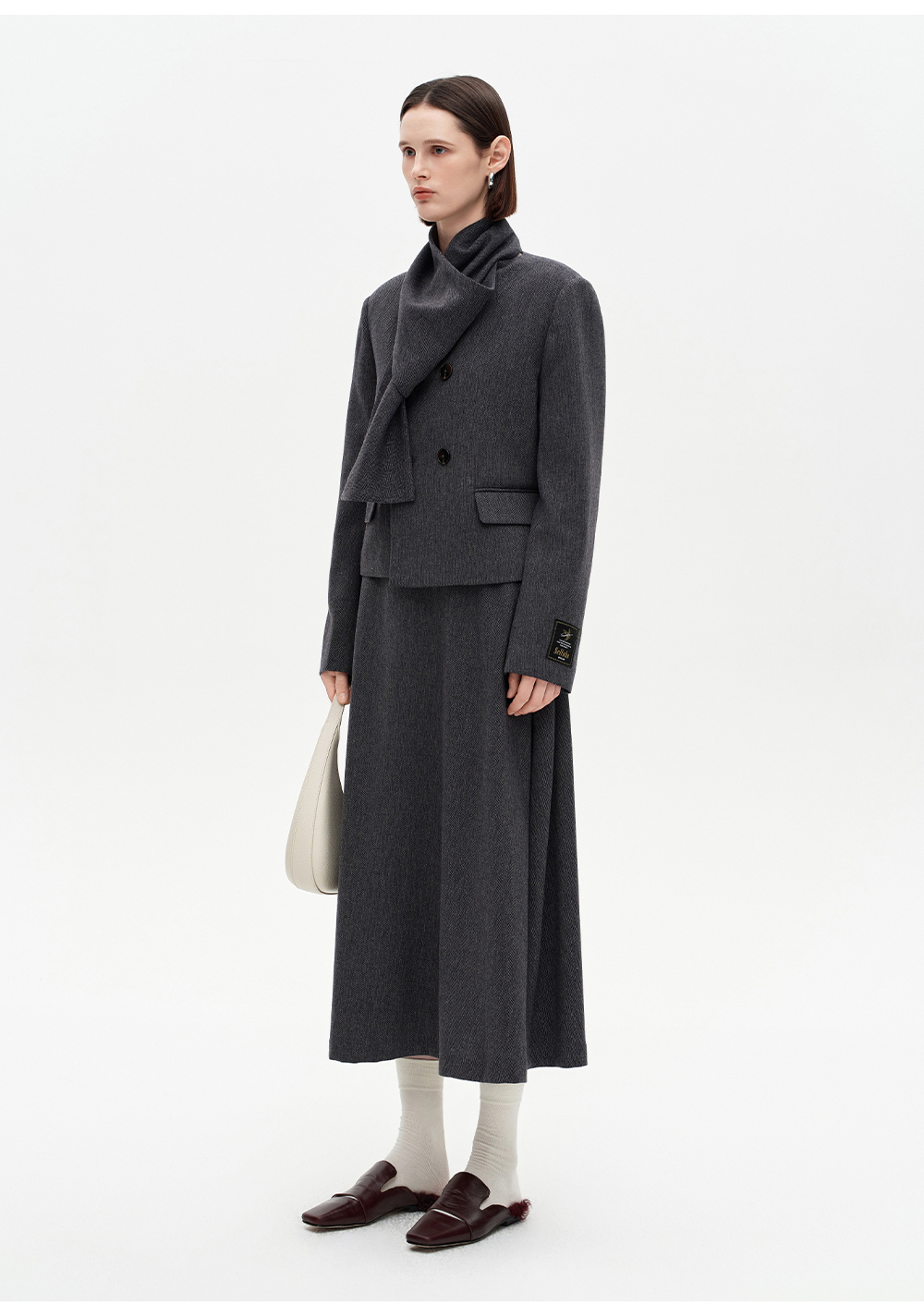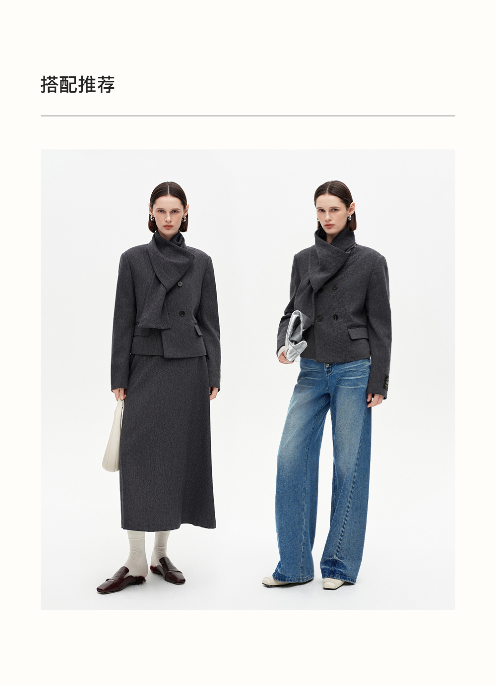SELFWHO羊毛混纺经典围巾领西装女2025冬新款人字纹双排扣短外套