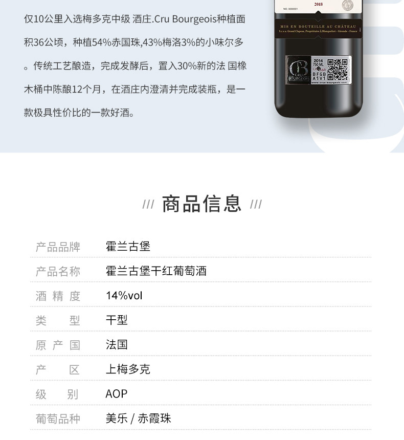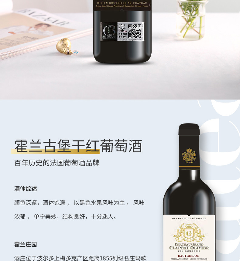 【法国进口】霍兰庄园古堡干红葡萄酒 14%vol 750m/瓶