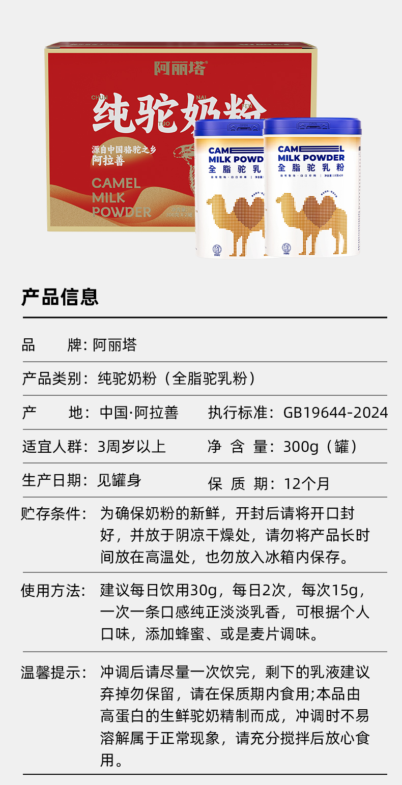阿丽塔全脂纯驼奶粉300g(独立包装20g*15条)