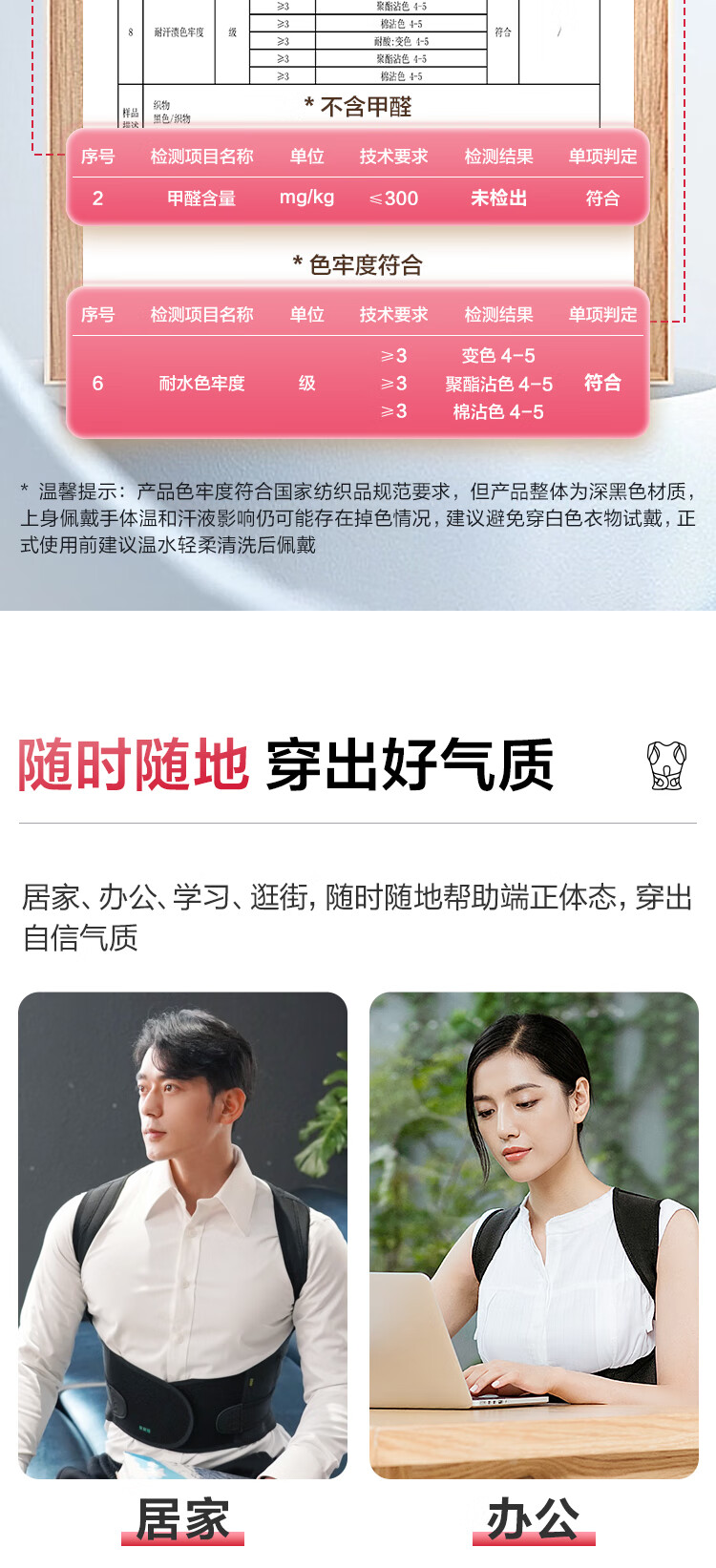 ✅分散压力:合理的矫姿带设计可以分散肩部、背部等部位的压力,使身体各部位的受力更加均匀。对于一些需要长时间保持同一姿势工作或学习的人来说,如办公室职员、学生等,使用背背佳新 e 款矫姿带能够缓解因姿势不良和肌肉紧张导致的身体疲劳和酸痛感,让身体感觉更加舒适