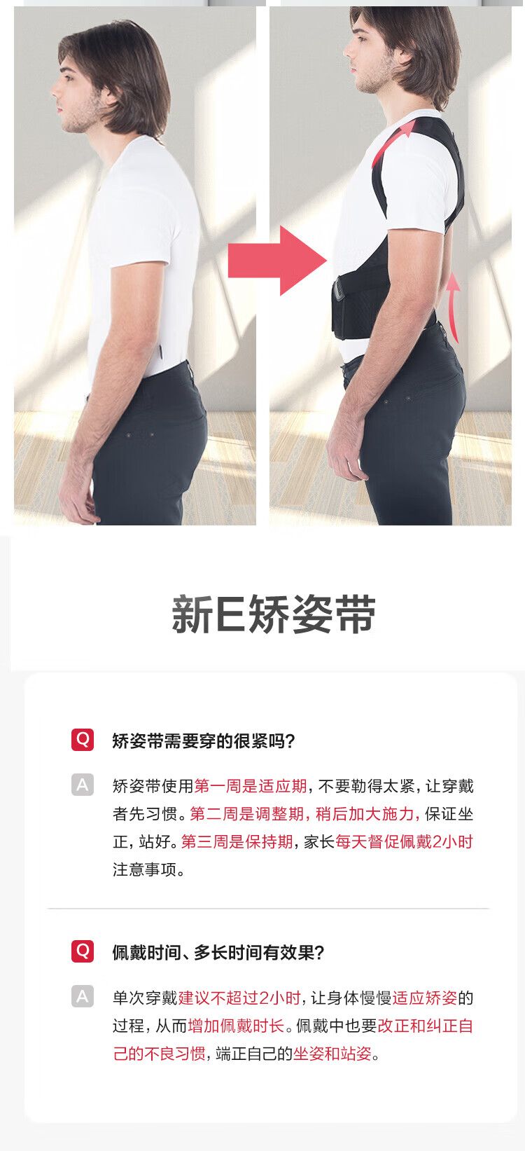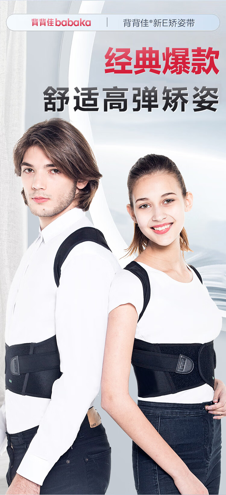 背背佳新 e 款矫姿带通过科学合理的设计,能够在穿戴时对肩部、背部等部位施加适当的外力,帮助使用者纠正不良姿势,逐渐养成挺胸抬头、双肩平衡的良好体态,提升个人气质和形象。