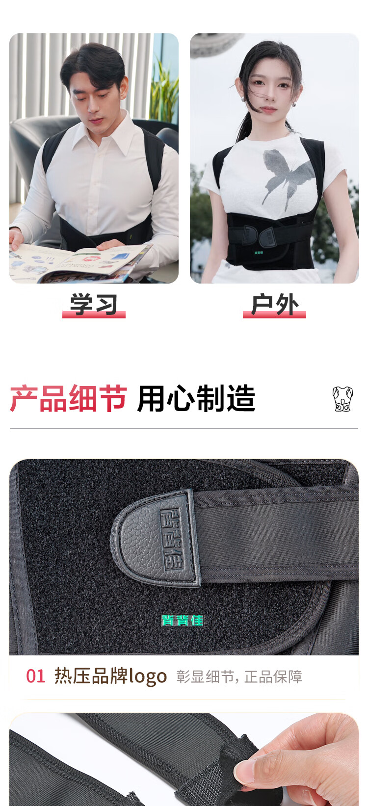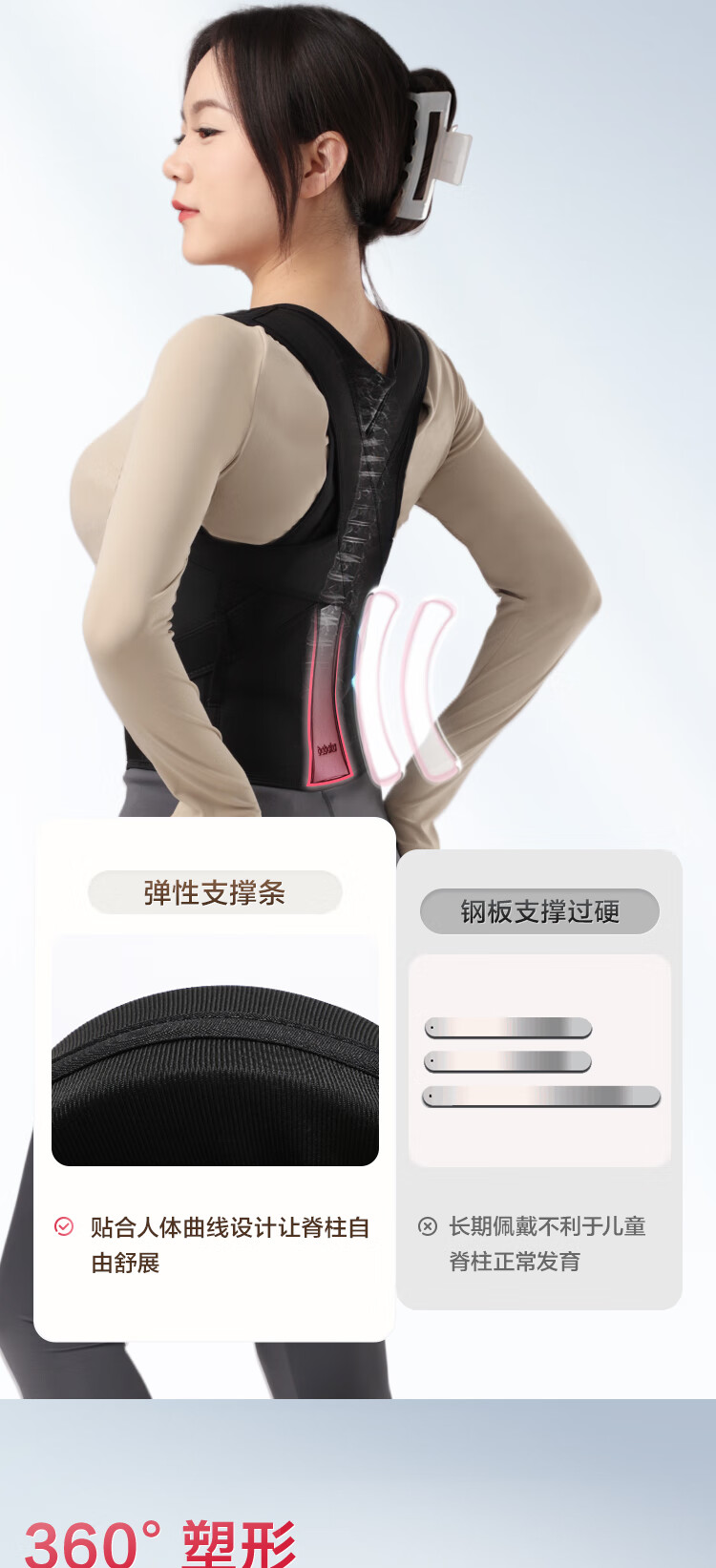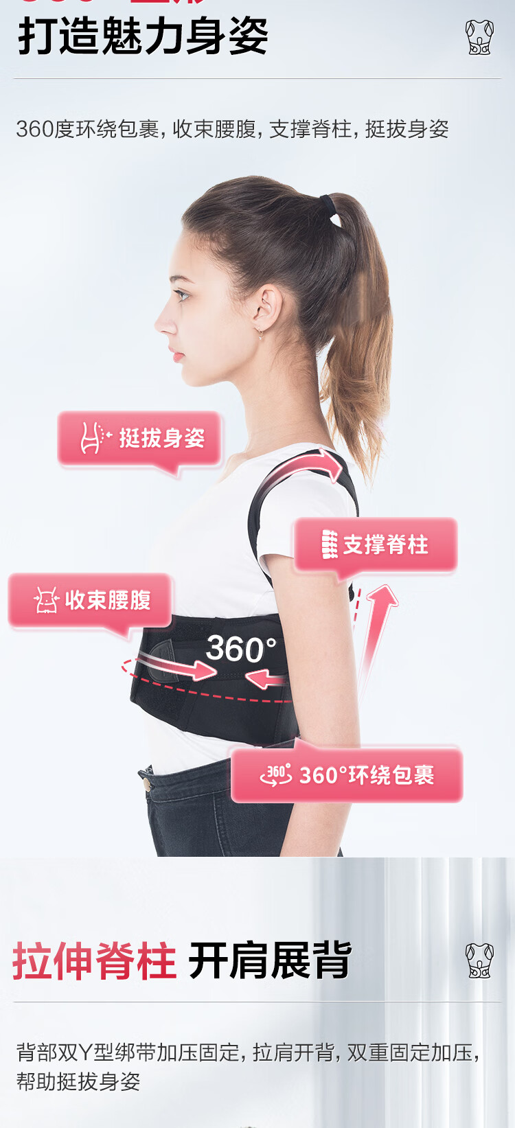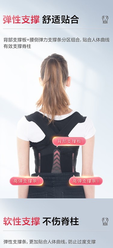 ✅预防脊柱问题:长期的姿势不良可能会对脊柱的正常生理曲度产生影响,增加脊柱侧弯等问题的发生风险。该矫姿带可以起到一定的支撑和约束作用,减轻脊柱所承受的压力,保持脊柱的正常形态,从而在一定程度上预防脊柱相关疾病的出现,维护脊柱健康。
