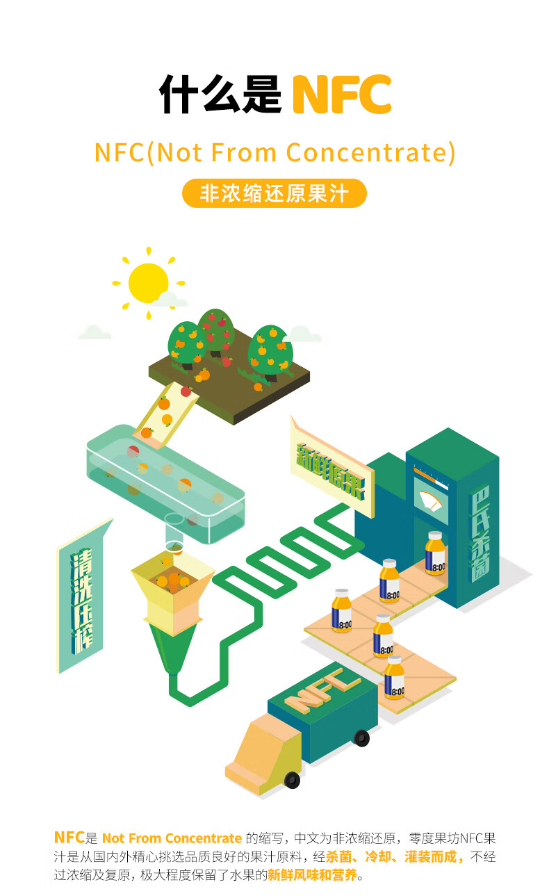 1:NFC鲜榨果汁,是将新鲜原果清洗后压榨出果汁
