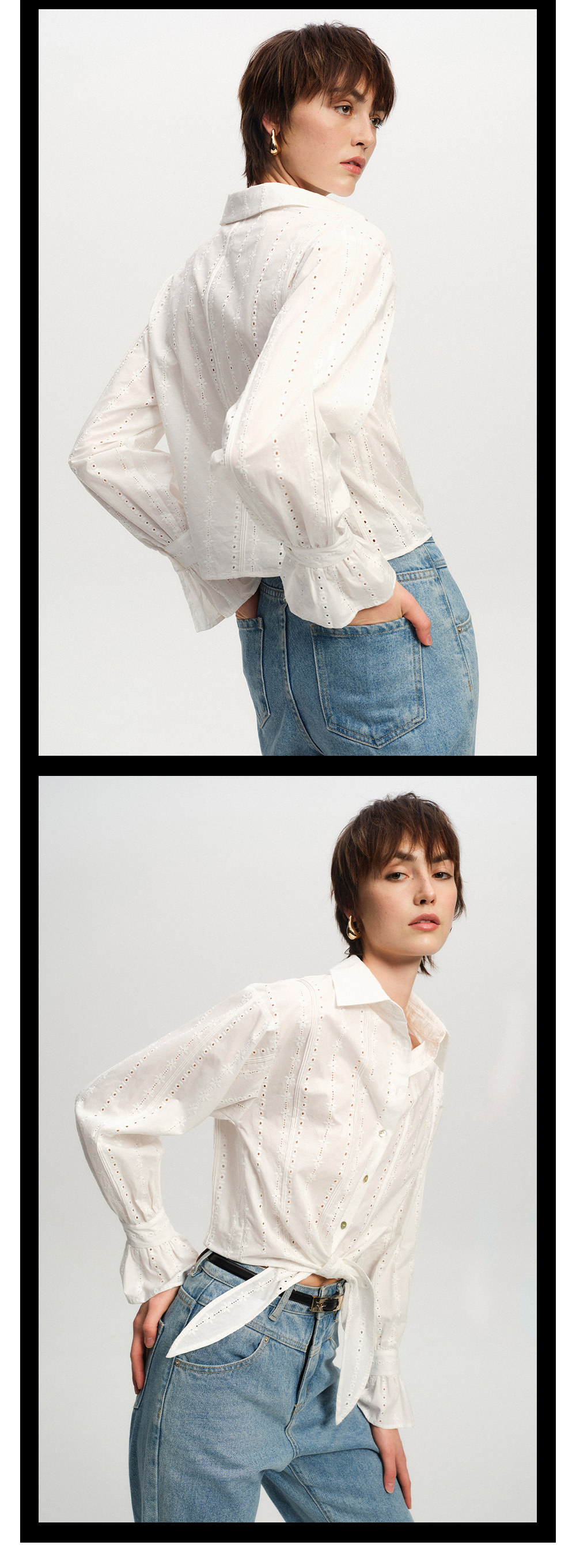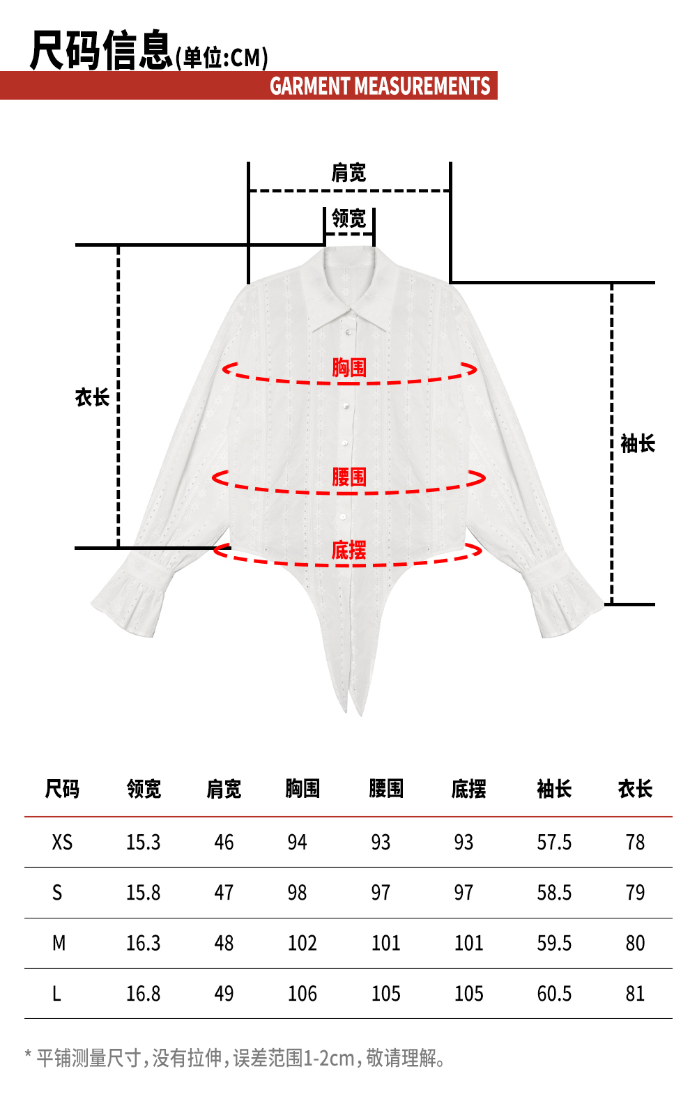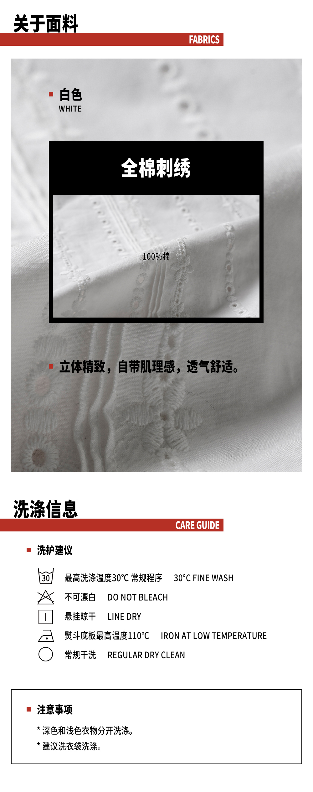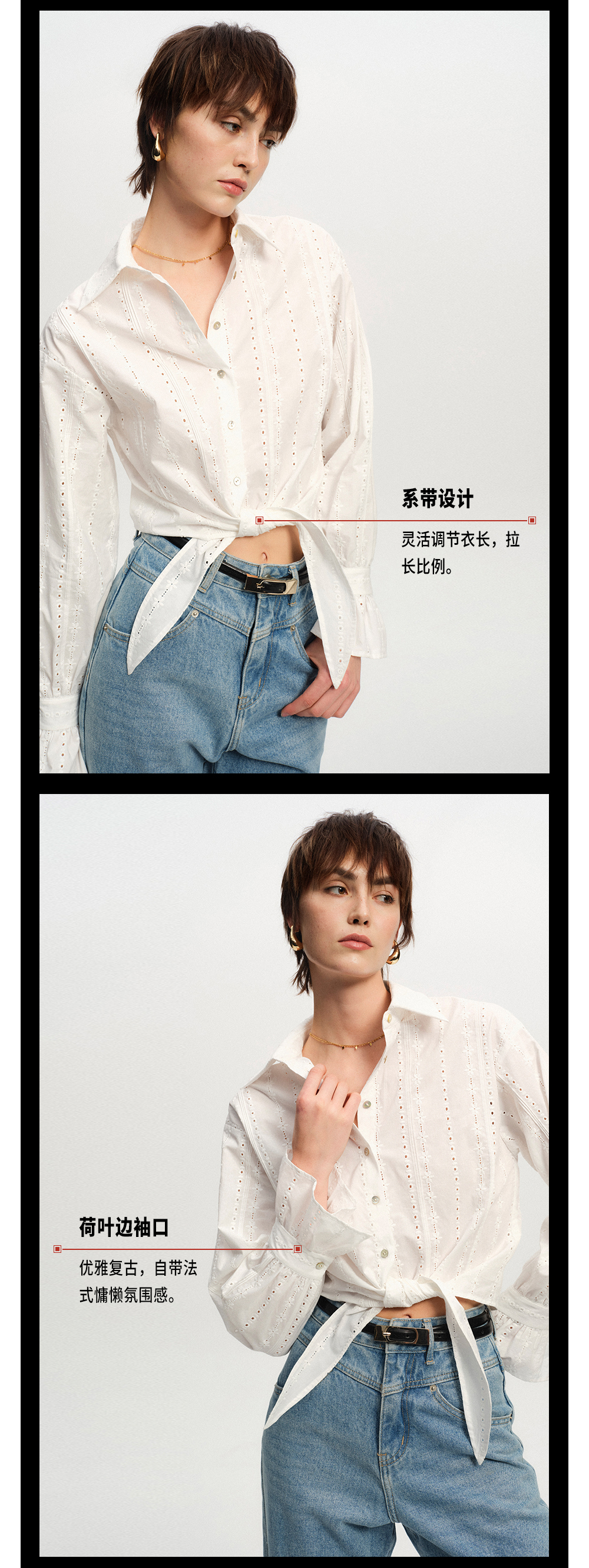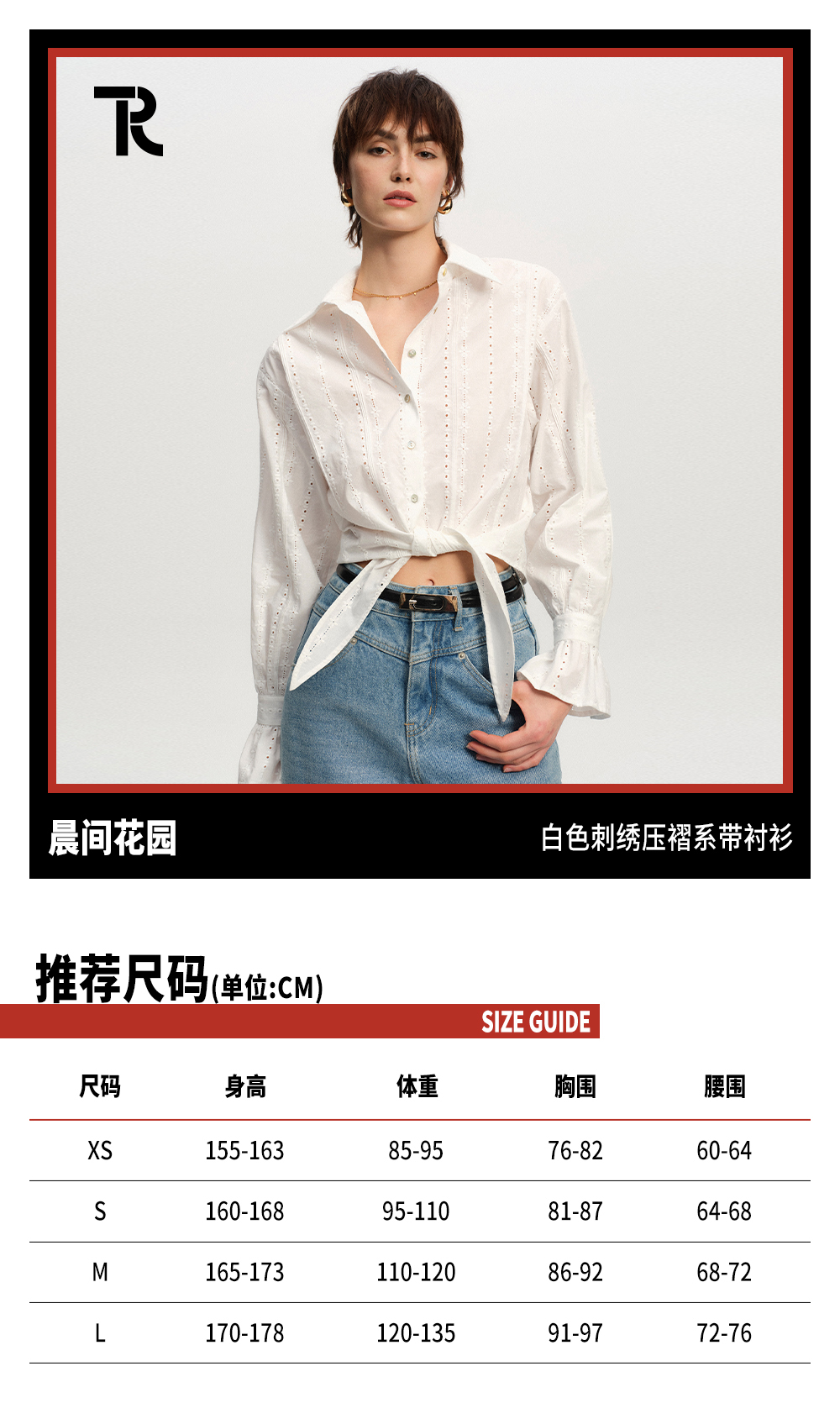 TR她热 晨间花园 白色棉感蕾丝刺绣压褶荷叶边复古度假宽松系带衬衫